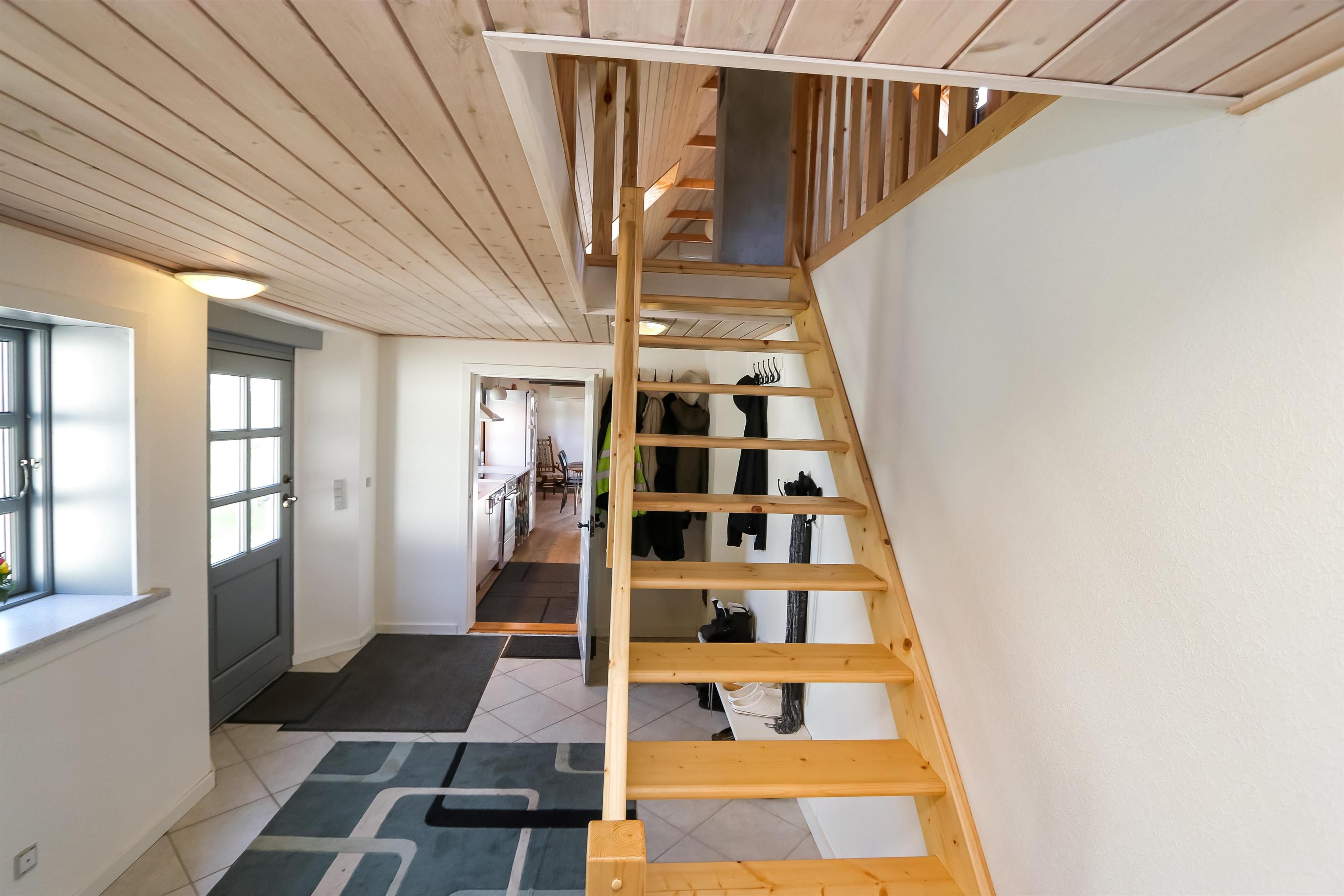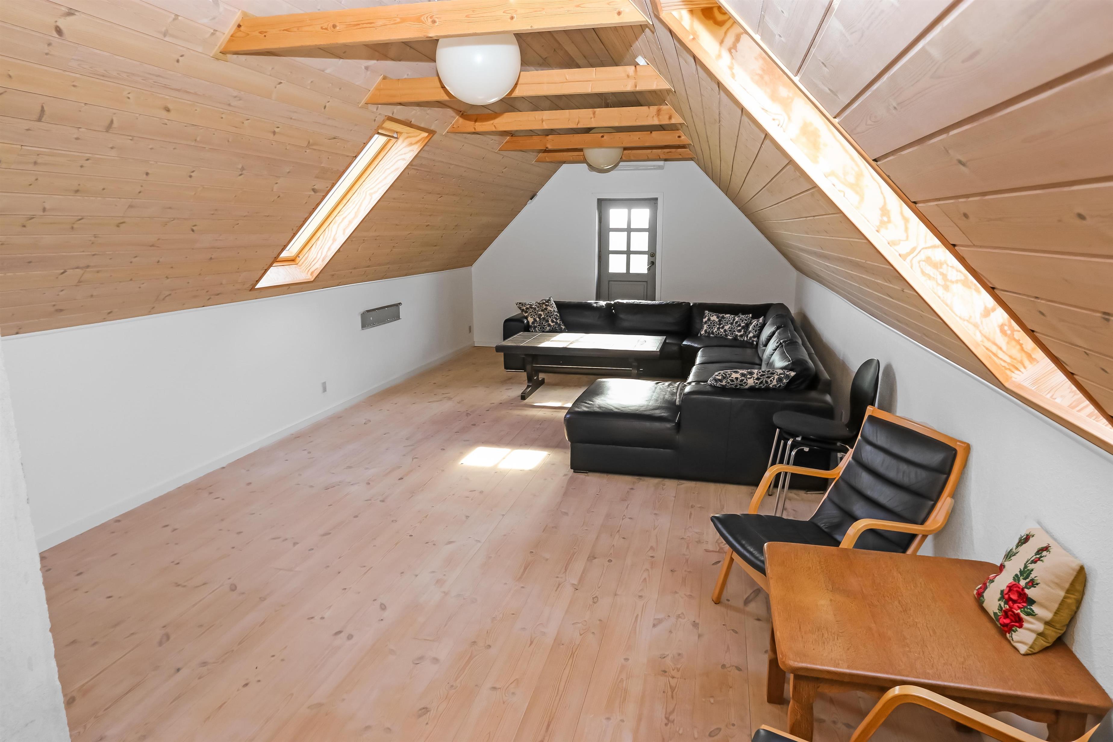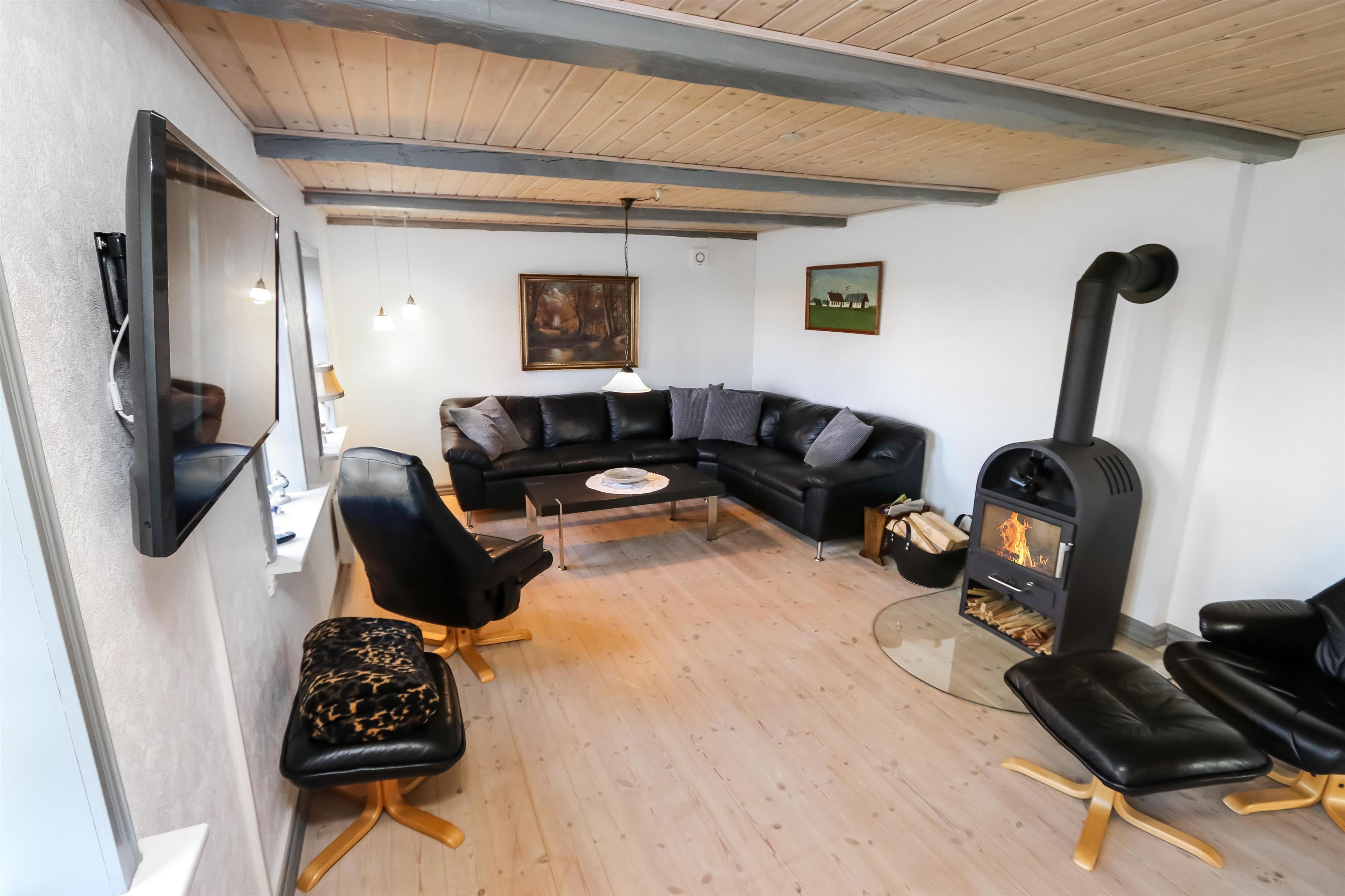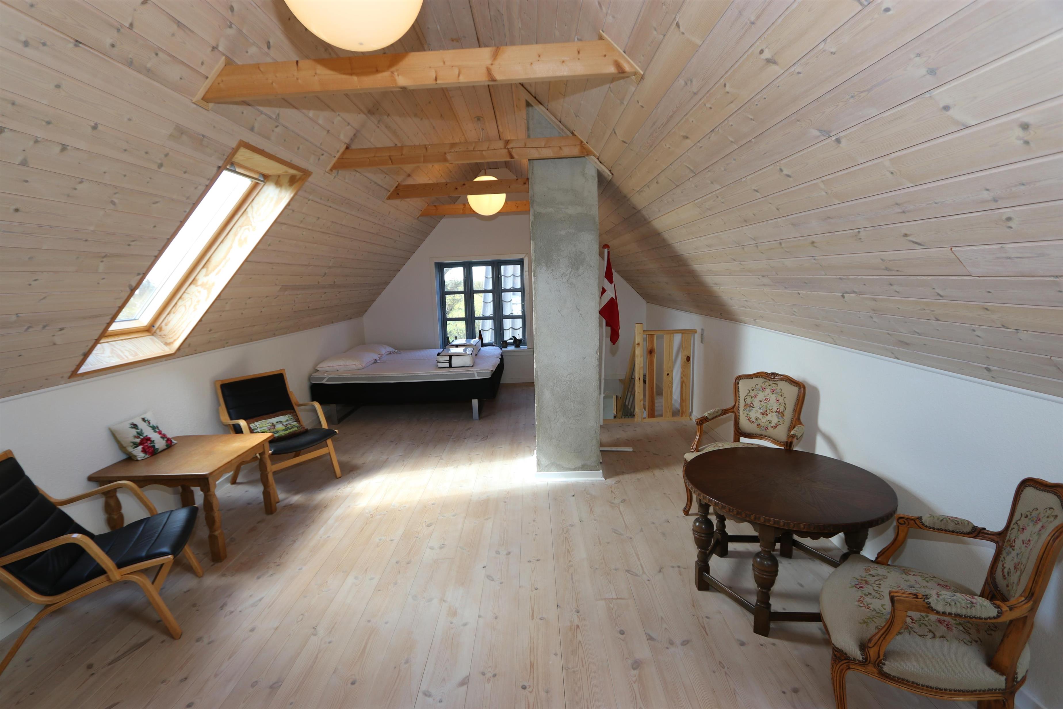 Tag trappen fra entréen op til 1 sal. Her er den en flot, ekstra opholdsstue med stor hjørnesofa, ekstra varmpumpe og ekstra TV, kurvestole og god seng (1DS) samt flot udsigt over landskabet.