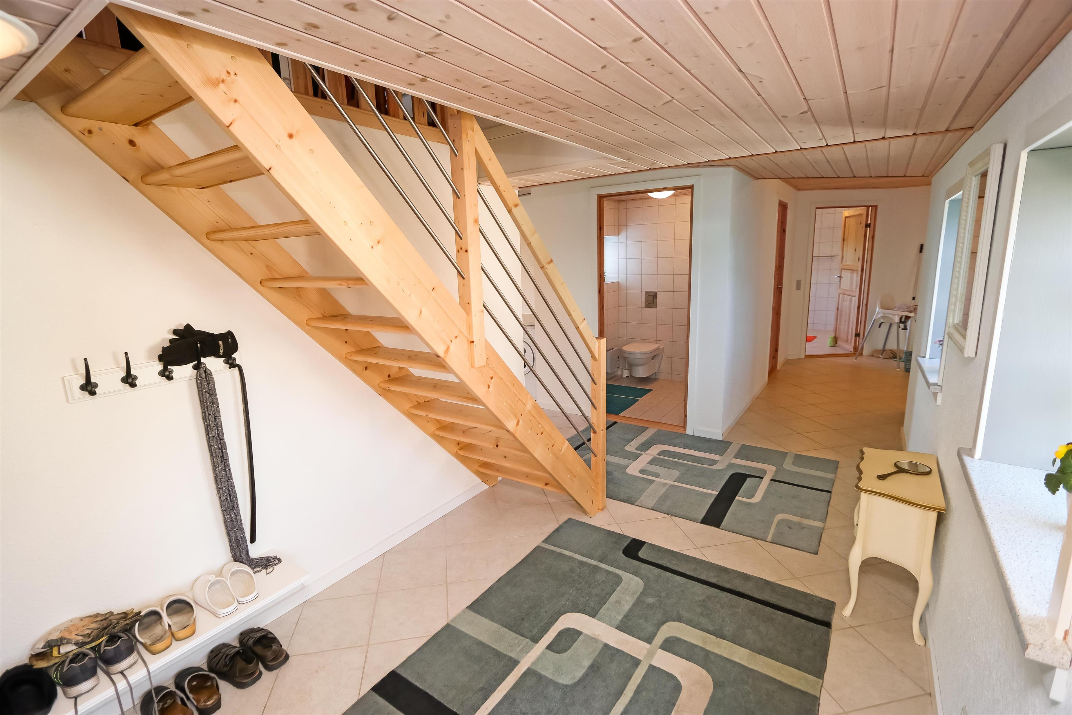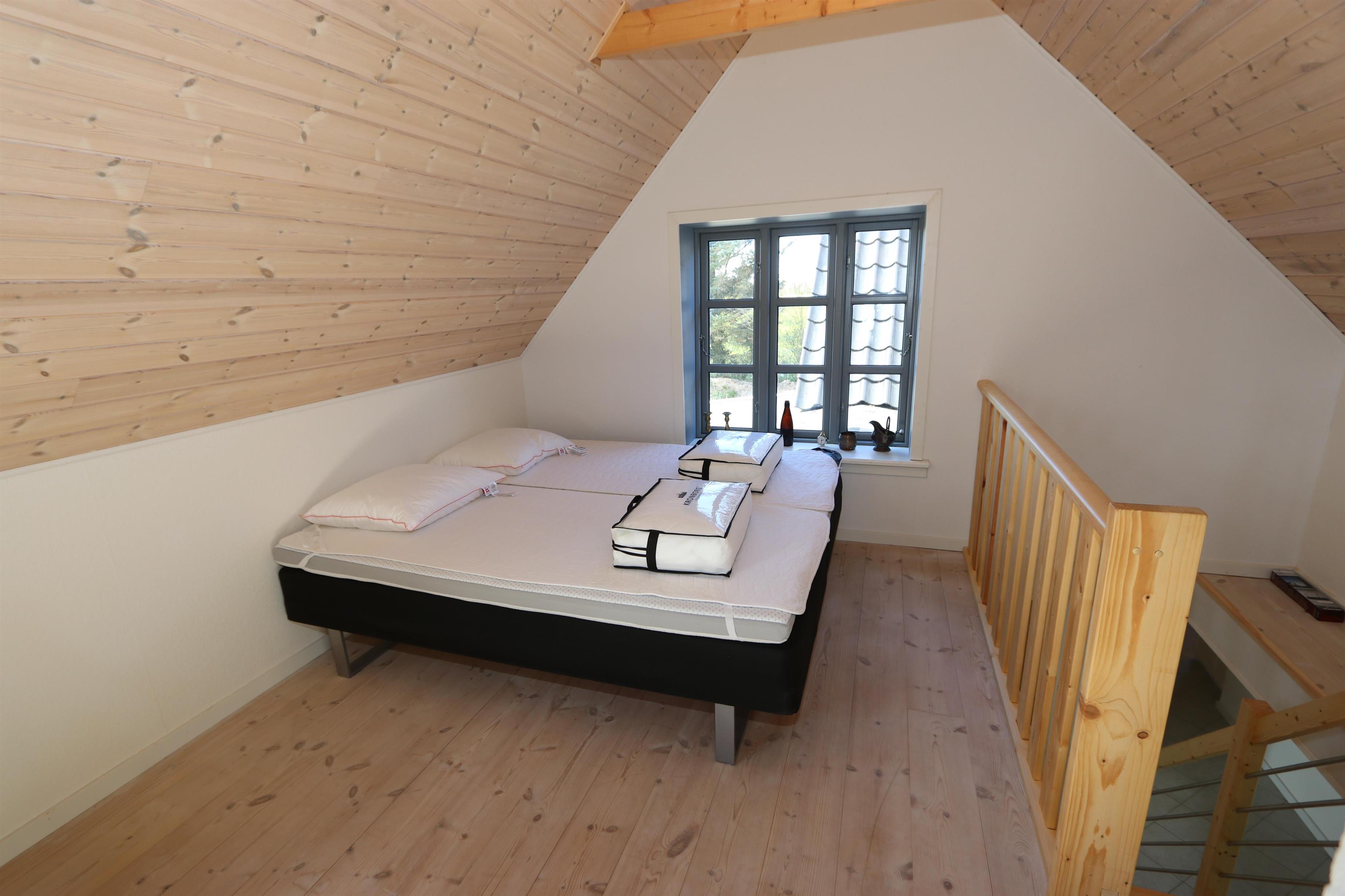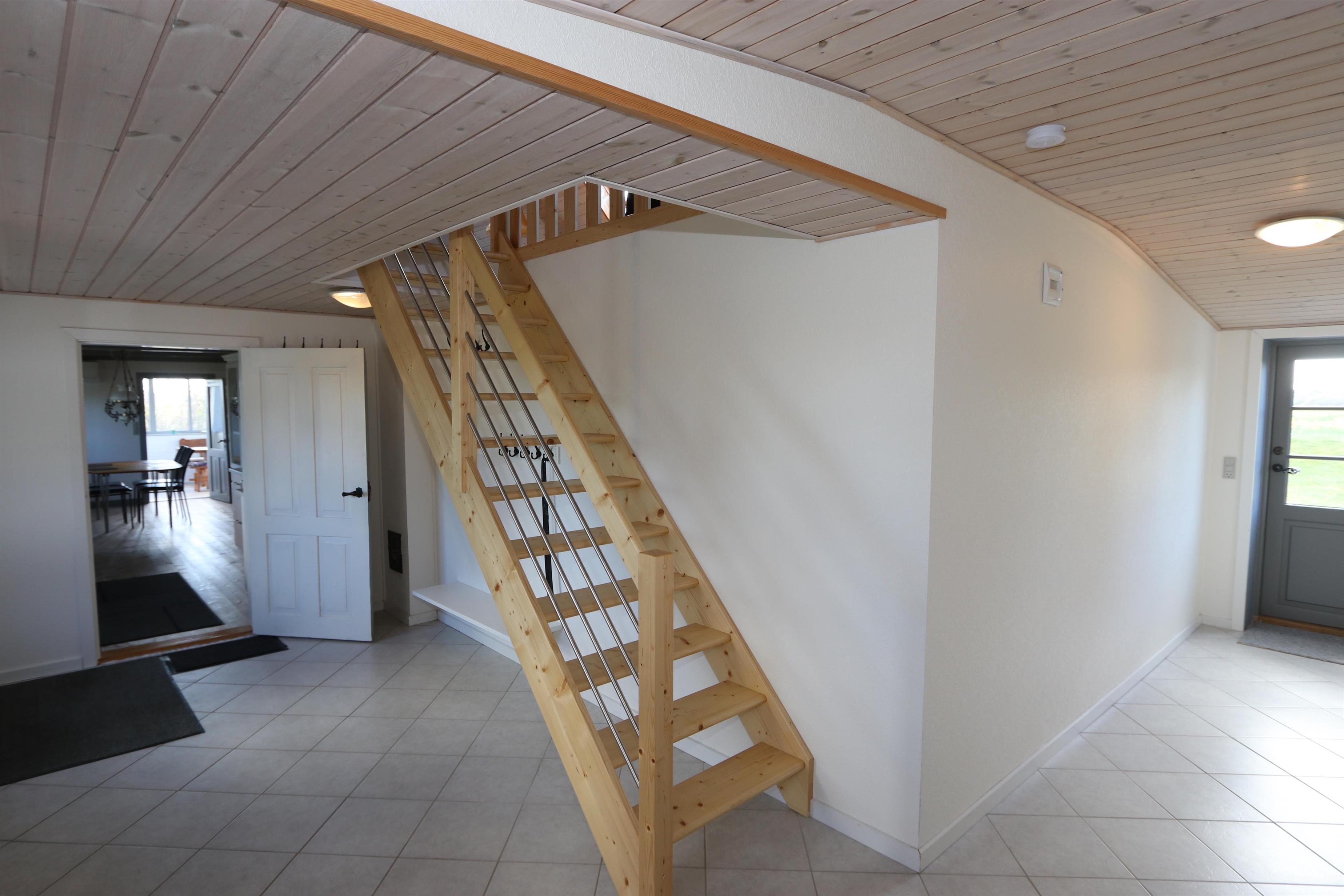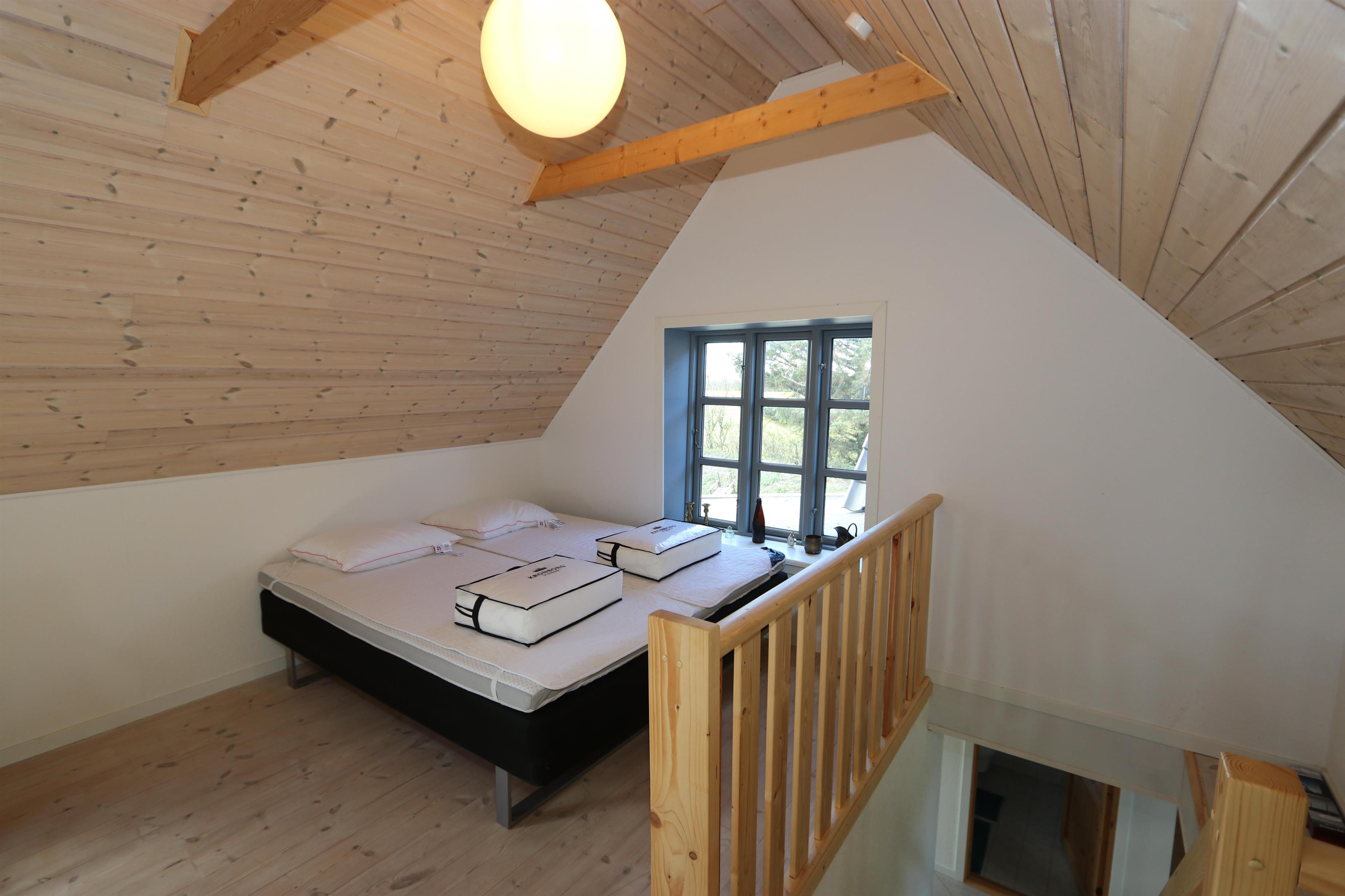 Tag trappen fra entréen op til 1 sal. Her er den en flot, ekstra opholdsstue med stor hjørnesofa, ekstra varmpumpe og ekstra TV, kurvestole og god seng (1DS) samt flot udsigt over landskabet.