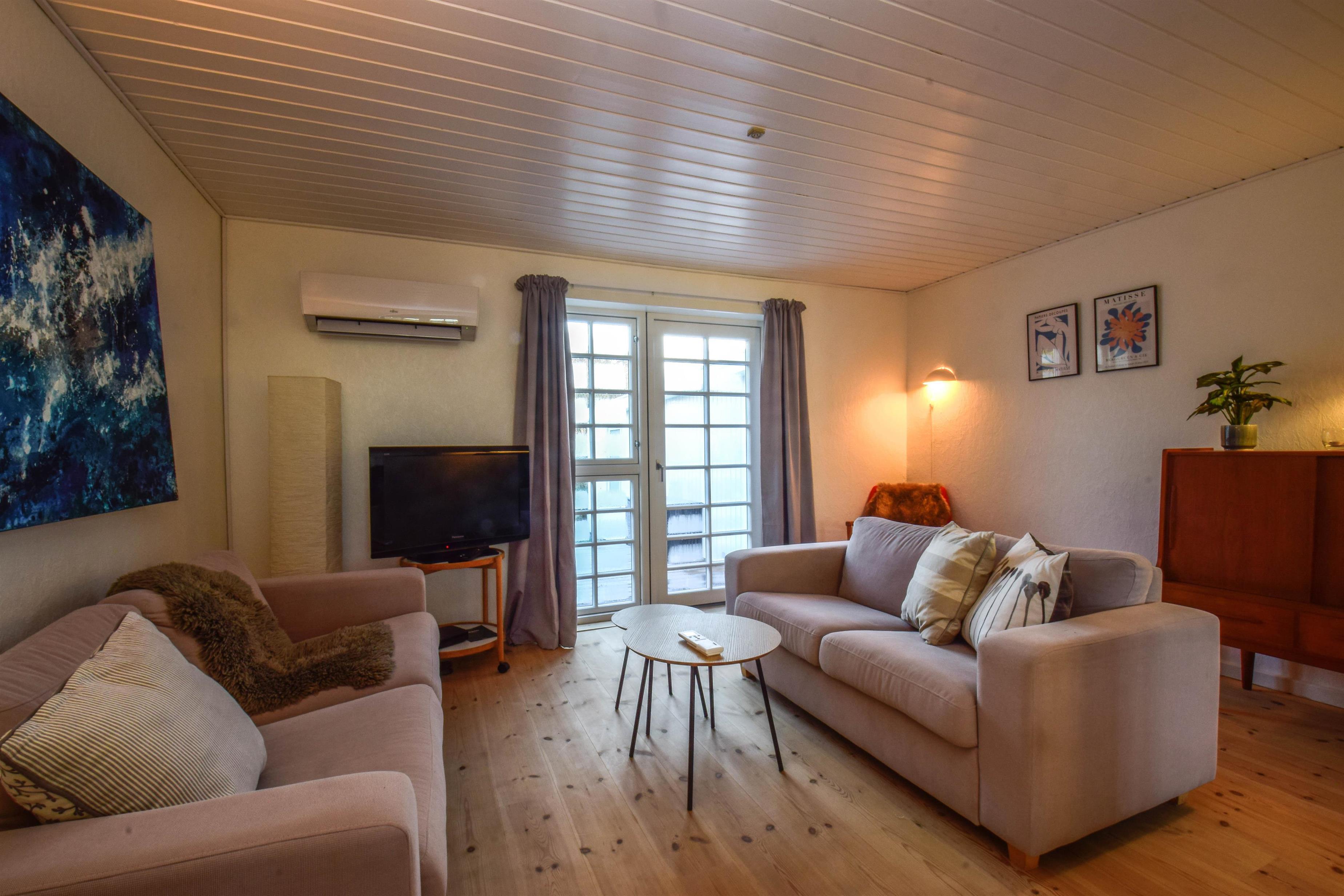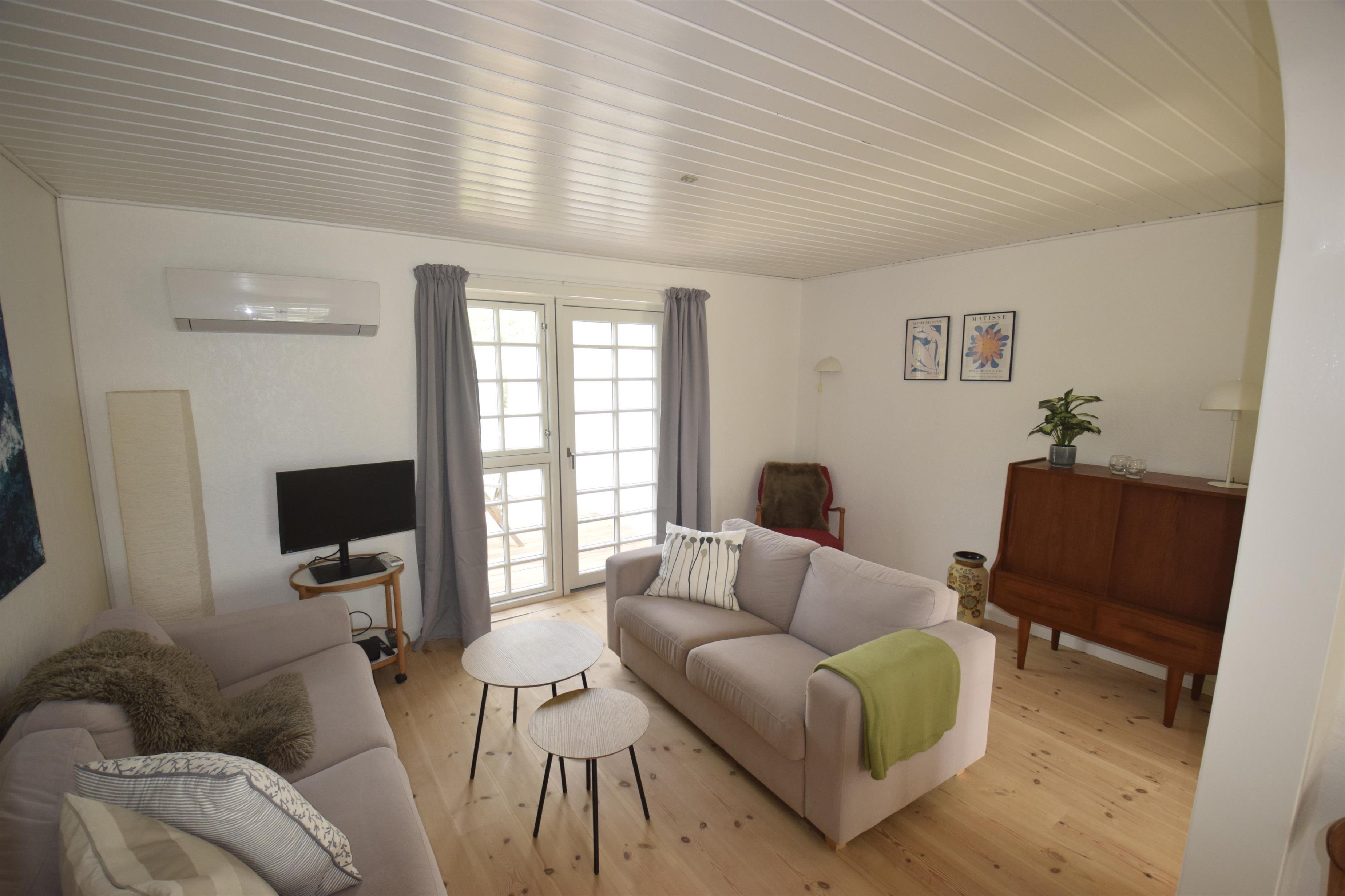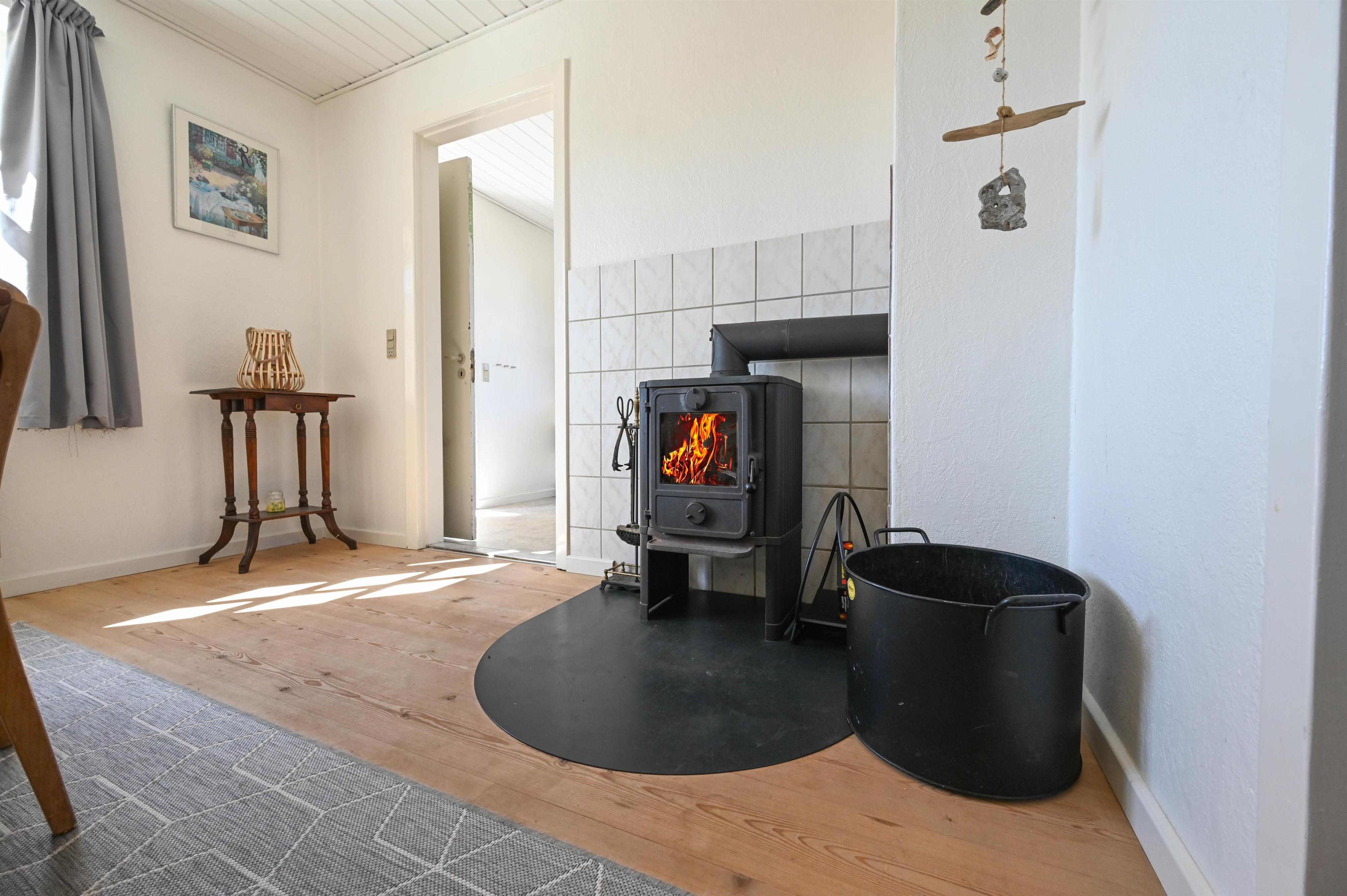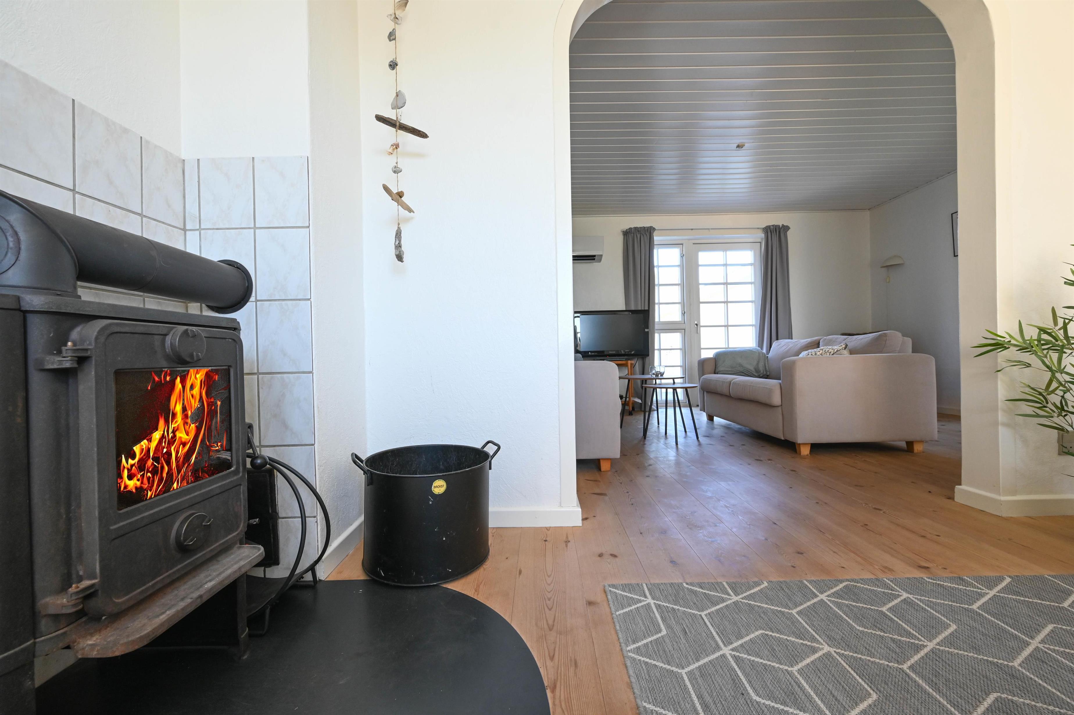 Stuen er hyggeligt indrettet med brændeovn, varmepumpe, komfortable møbler og udgang til terrassen – her er det let at føle sig hjemme.