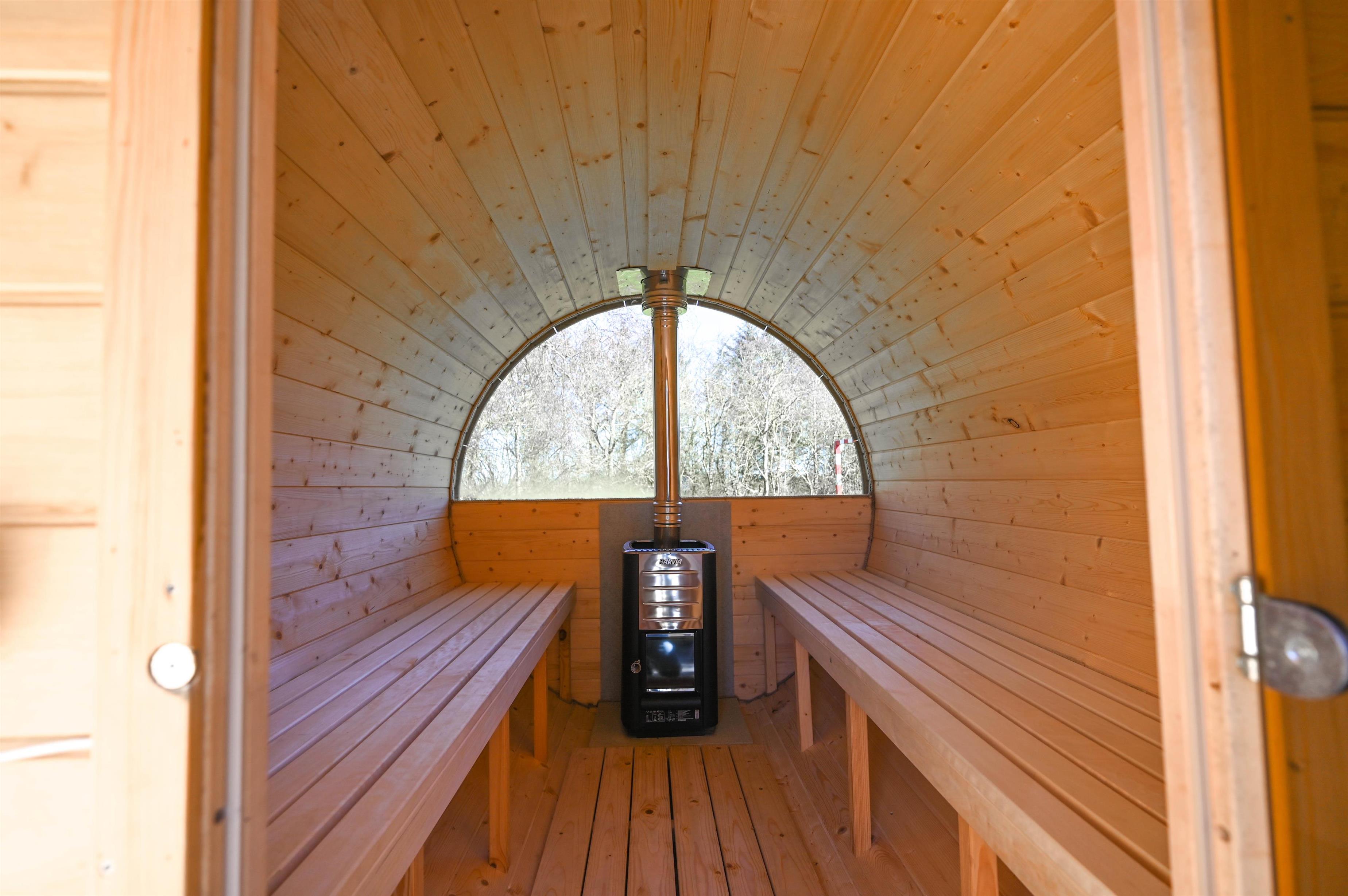 Udenfor finder I både vildmarkskar og udendørs sauna, hvor I kan slappe af og nyde roen, naturen og den friske vestjyske luft.