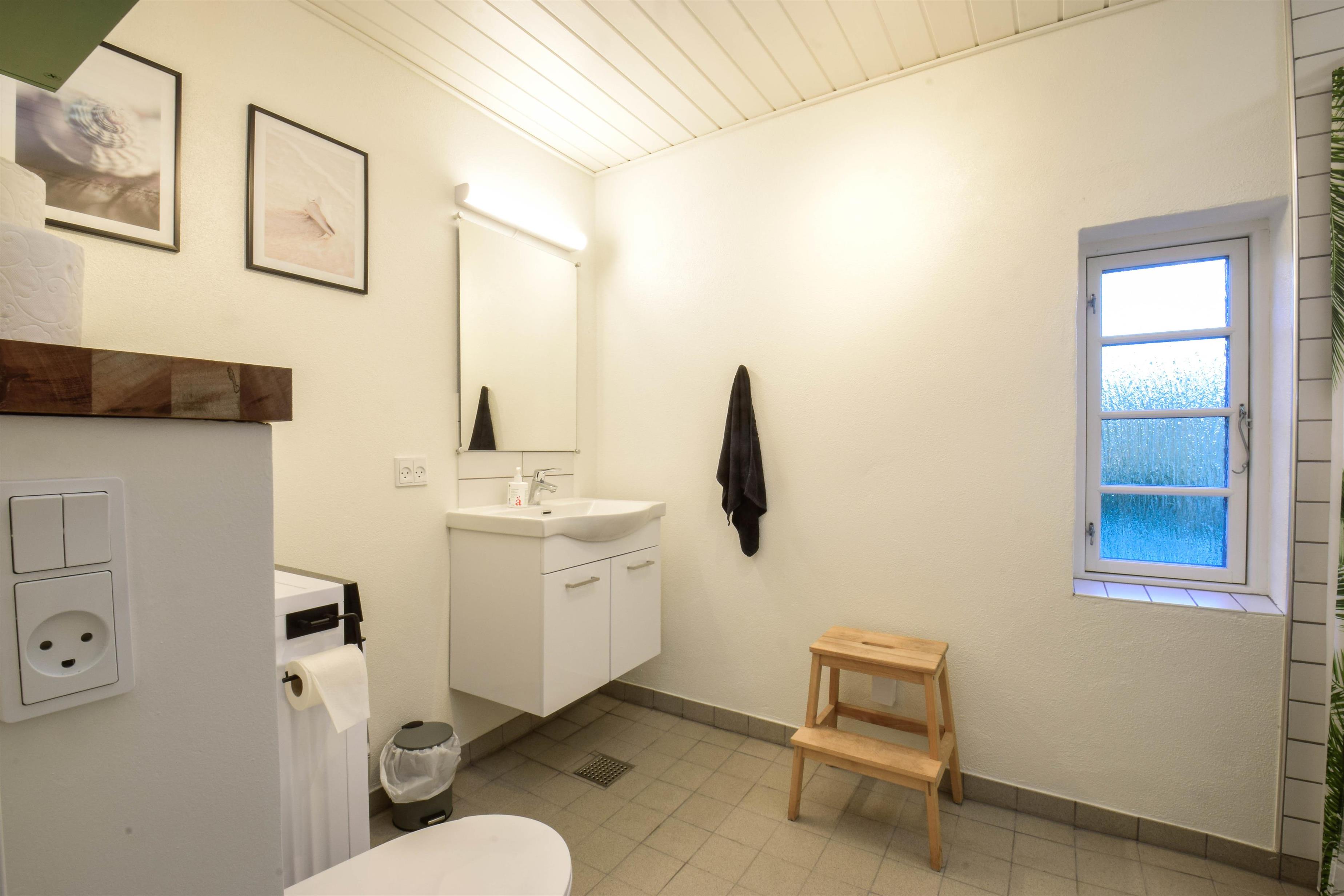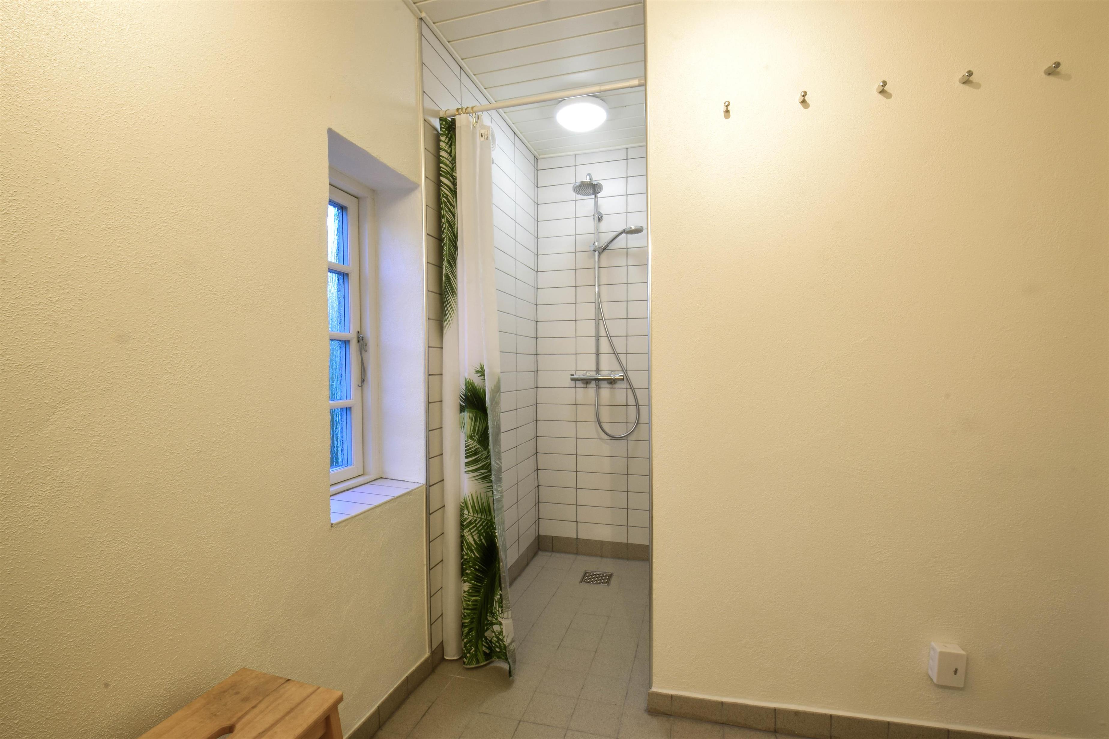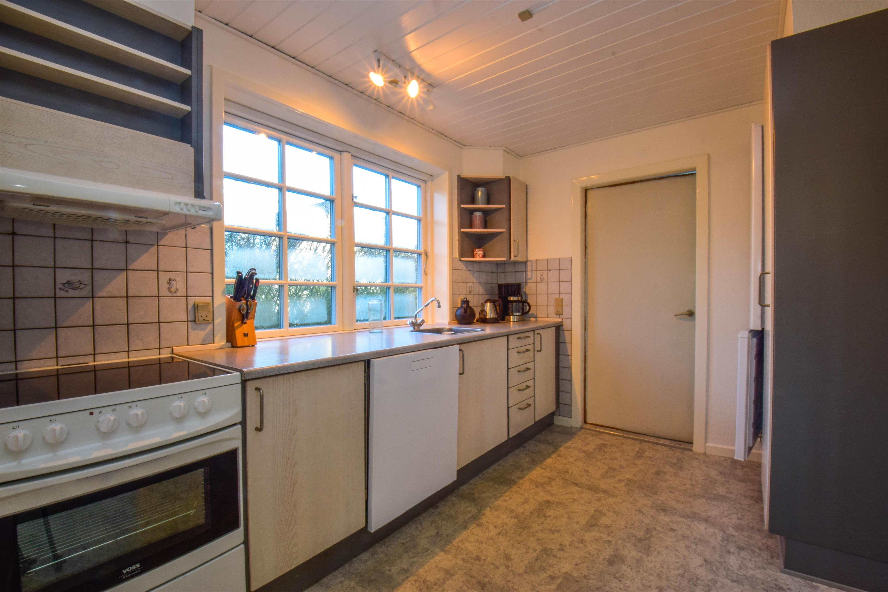 Indenfor finder I en entre med klinkegulv, et nyt badeværelse med bruseniche, samt et veludstyret køkken med opvaskemaskine.