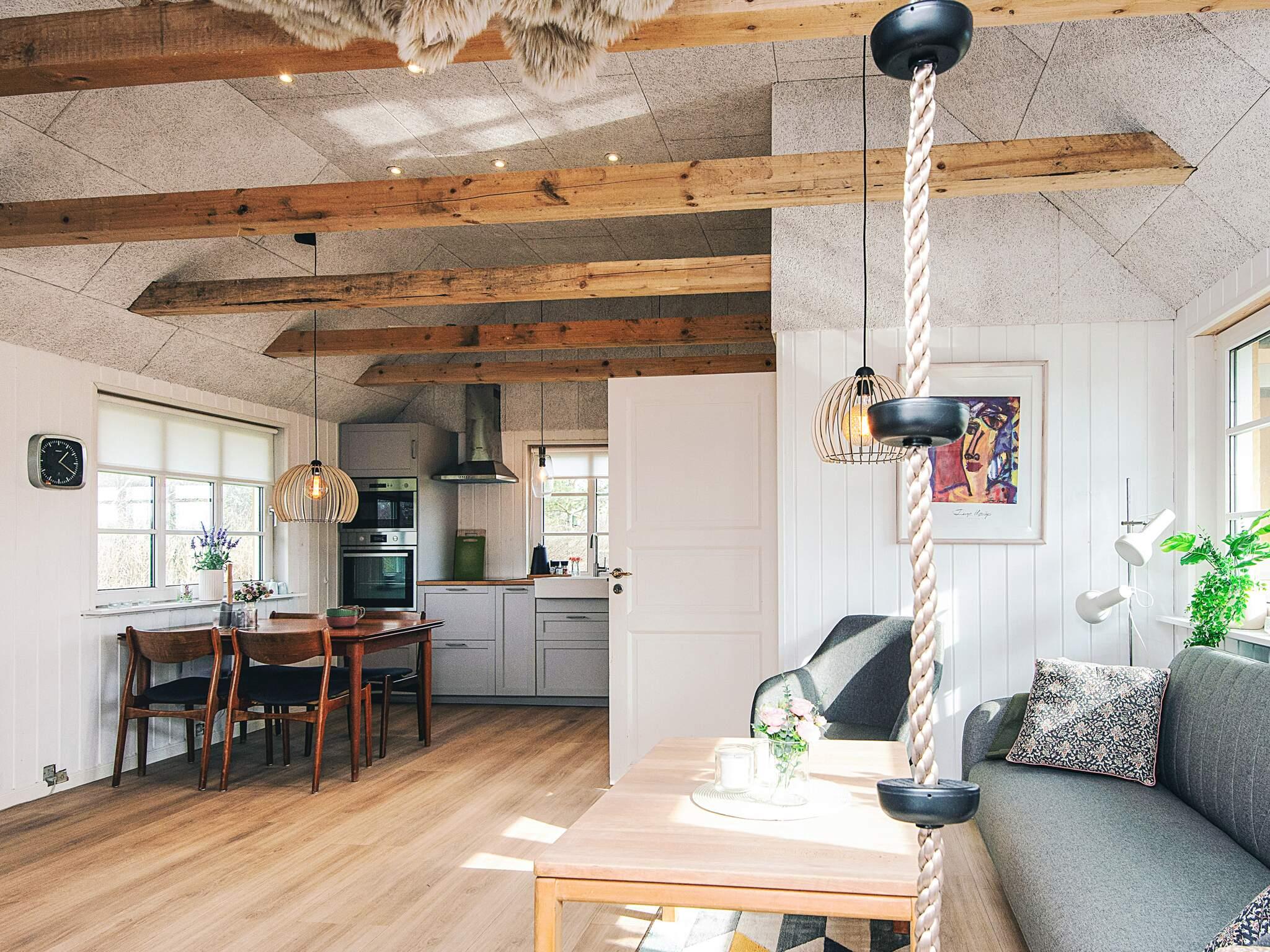 Dette lille sommerhus oser af charme udenfor såvel som indenfor og er skønt og fredeligt beliggende i Fjand. Indenfor hersker en personlig og hyggelig indretning med masser af små detaljer. Det veludstyrede køkken ligger i åben forbindelse med den kombinerede opholds- og spisestue, hvor det også er muligt at lune sig ved brændeovnens sagte ild på en kold sommeraften. Foruden tv og trådløst internet er sommerhuset tilmed udstyret med en energivenlig luft/luft varmepumpe, som kan varme hele huset op. Fra entreen er der adgang til husets badeværelse, som har gulvvarme, vaskemaskine og tørretumbler. Og fra stuen er der adgang til husets to soveværelser, hvoraf det ene har dobbeltseng, mens det andet har to enkeltsenge. Sommerhusets terrasse er delvist indhegnet, som giver et læfyldt sted at sidde ude og nyde solens stråler. Huset er omgivet af en græsplæne, der indbyder til boldspil og leg.
