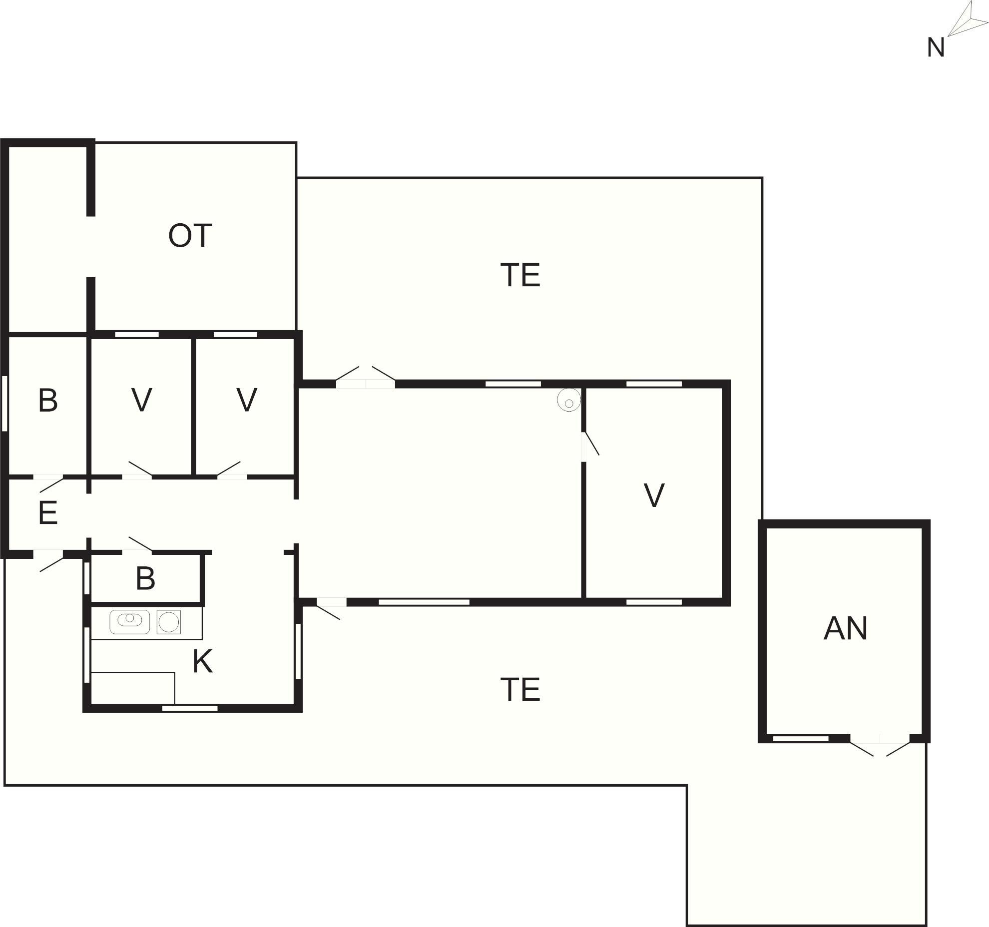 Huset har også to badeværelser med bruser og toiletter, hvilket sikrer bekvemmelighed for alle gæster. Kombinationen af ??traditionel charme og praktiske faciliteter gør dette feriehus velegnet til et afslappende ophold hele året rundt.