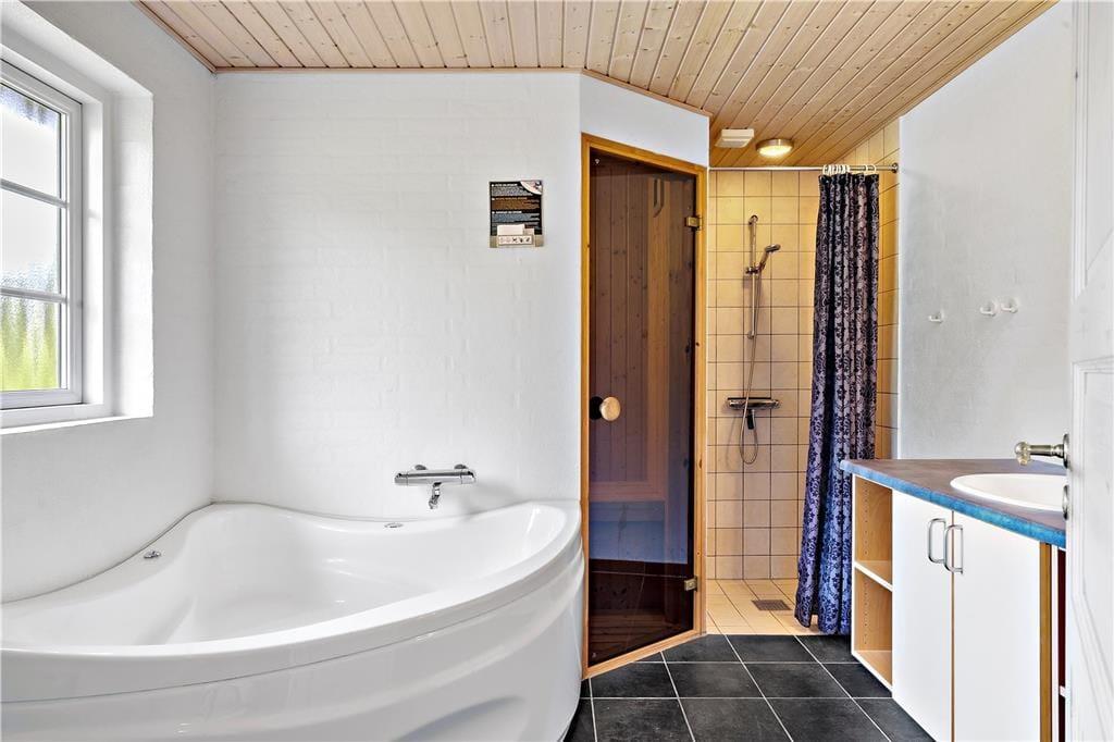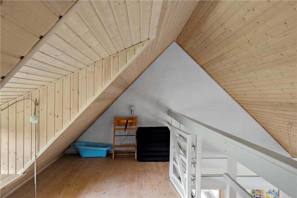 Badeværelset er et lille wellness-område i sig selv, med både spa, sauna, bruseniche og gulvvarme, så I kan forkæle jer selv efter en dag ude i naturen. Børnene vil elske den store 20 m² hems, fyldt med legesager og plads til sjov og fantasi. Og hvis børnene vil have en ekstra sjov oplevelse, kan de sove på hemsen, der er udstyret med madrasser og et sikkerheds-gelænder. Her får både voksne og børn den ultimative komfort og mulighed for at slappe af i naturskønne omgivelser.