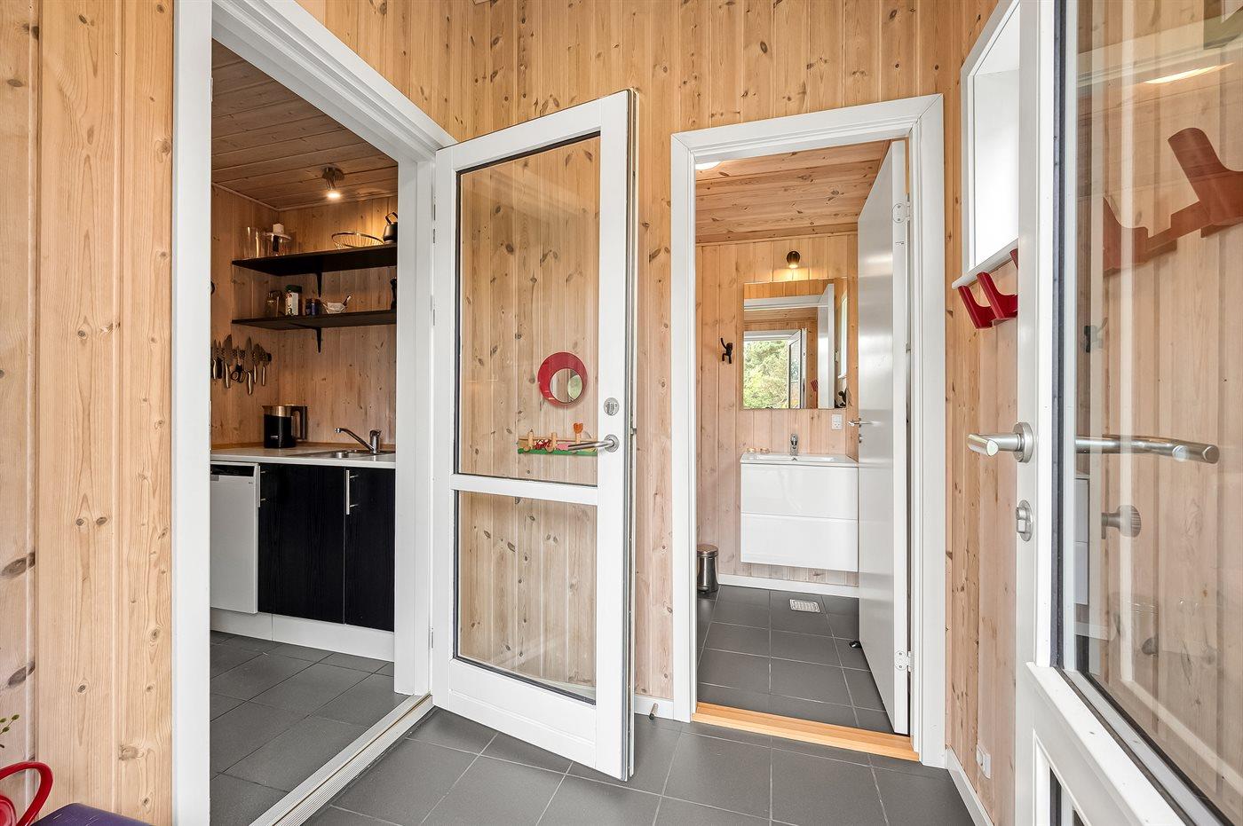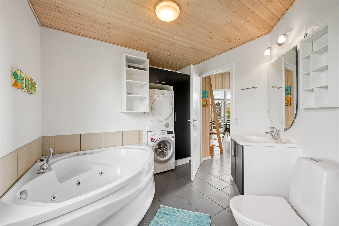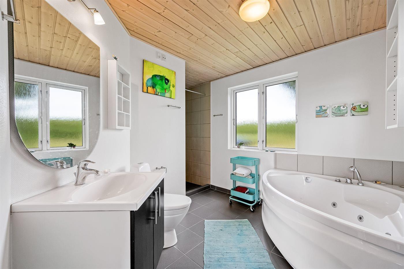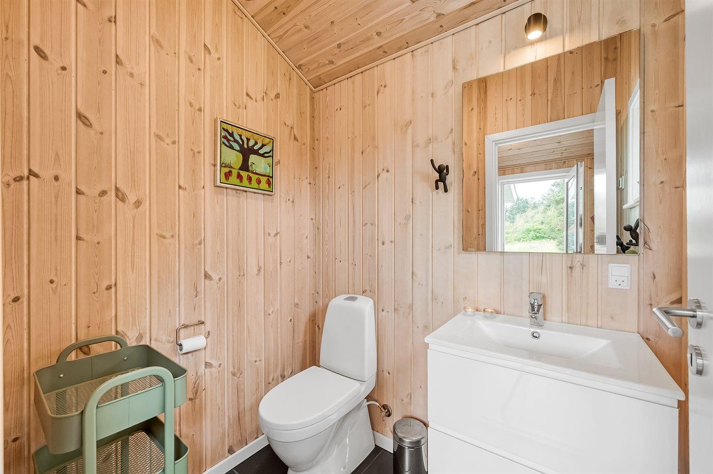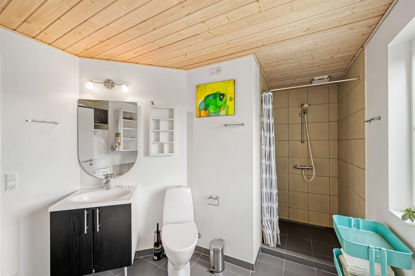 Der er 1 badeværelse med bruseniche og 2 toiletter, heraf 1 gæstetoilet. Der er gulvvarme på 1 badeværelse. Der er gulvvarme på gæstetoilettet.