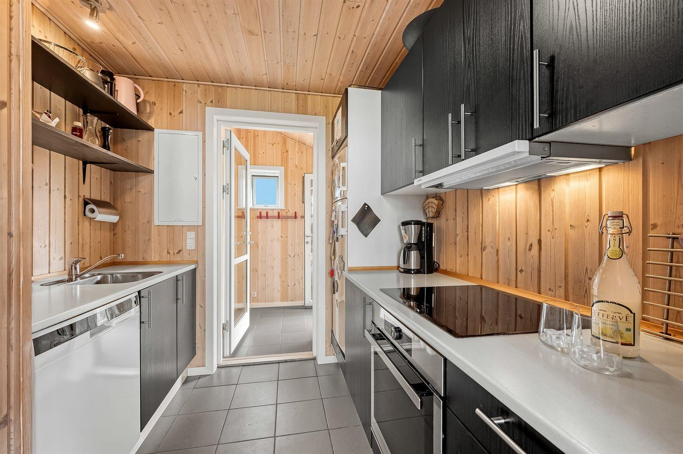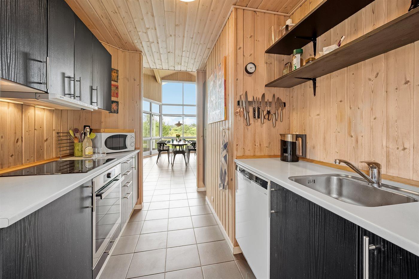 Køkkenet er udstyret med 1 køleskab. Der er 4 induktionskogeplader, varmluftovn, mikrobølgeovn samt opvaskemaskine.