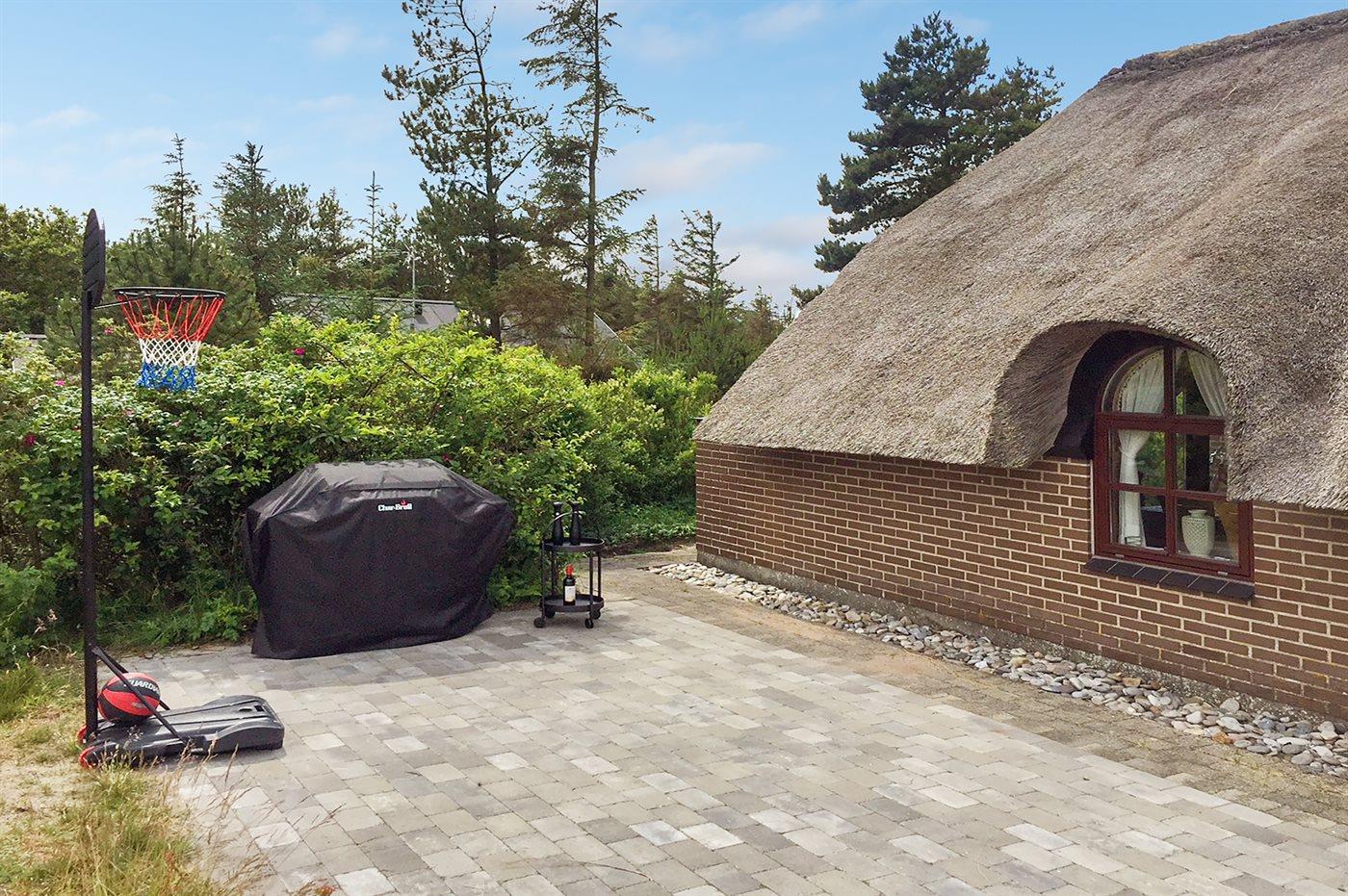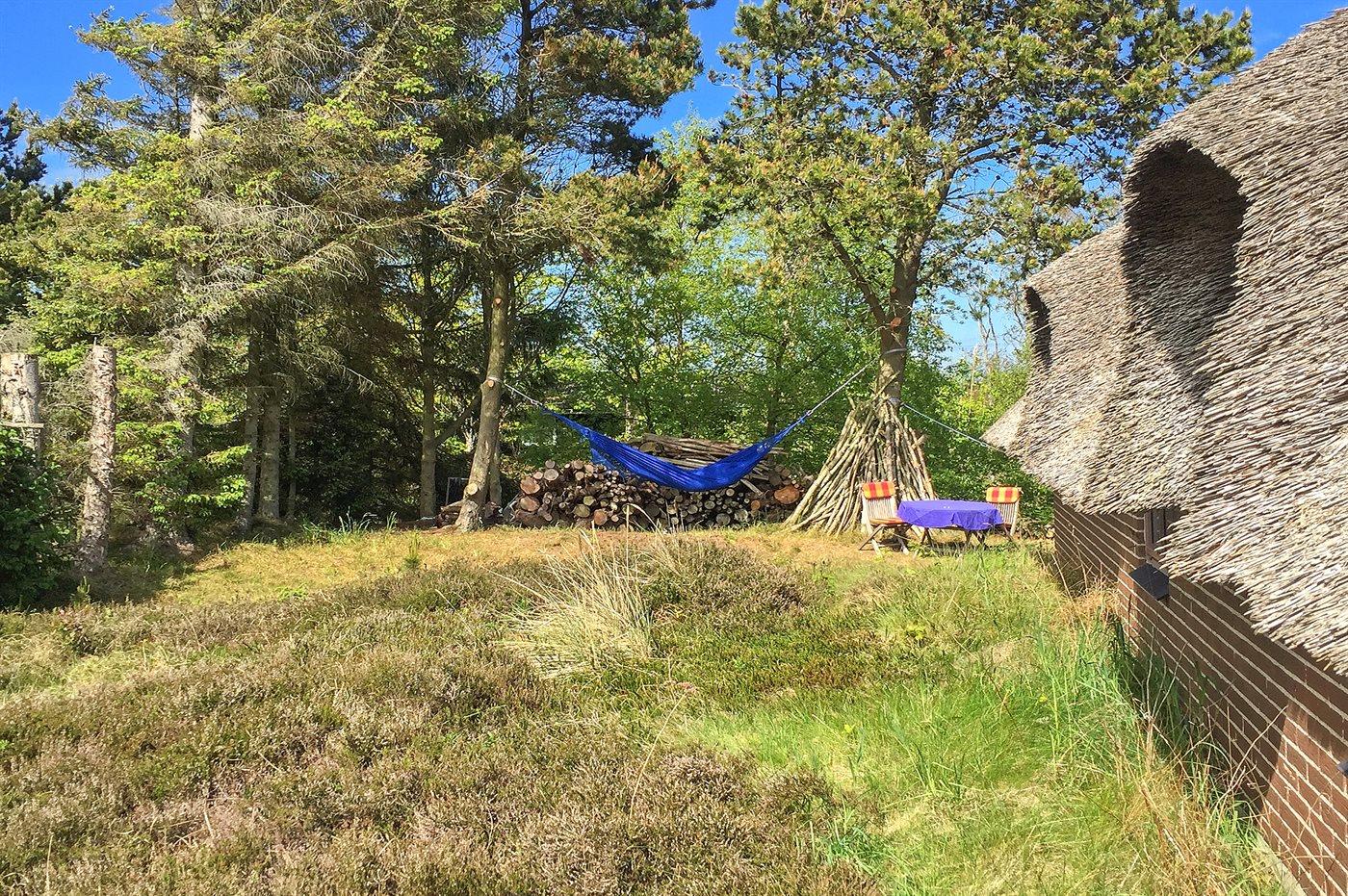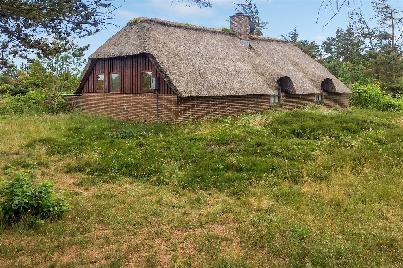 Hyggeligt sommerhus med stråtag, stor terrasse og brændeovn, beliggende tæt på fjord og natur i Ulfborg.