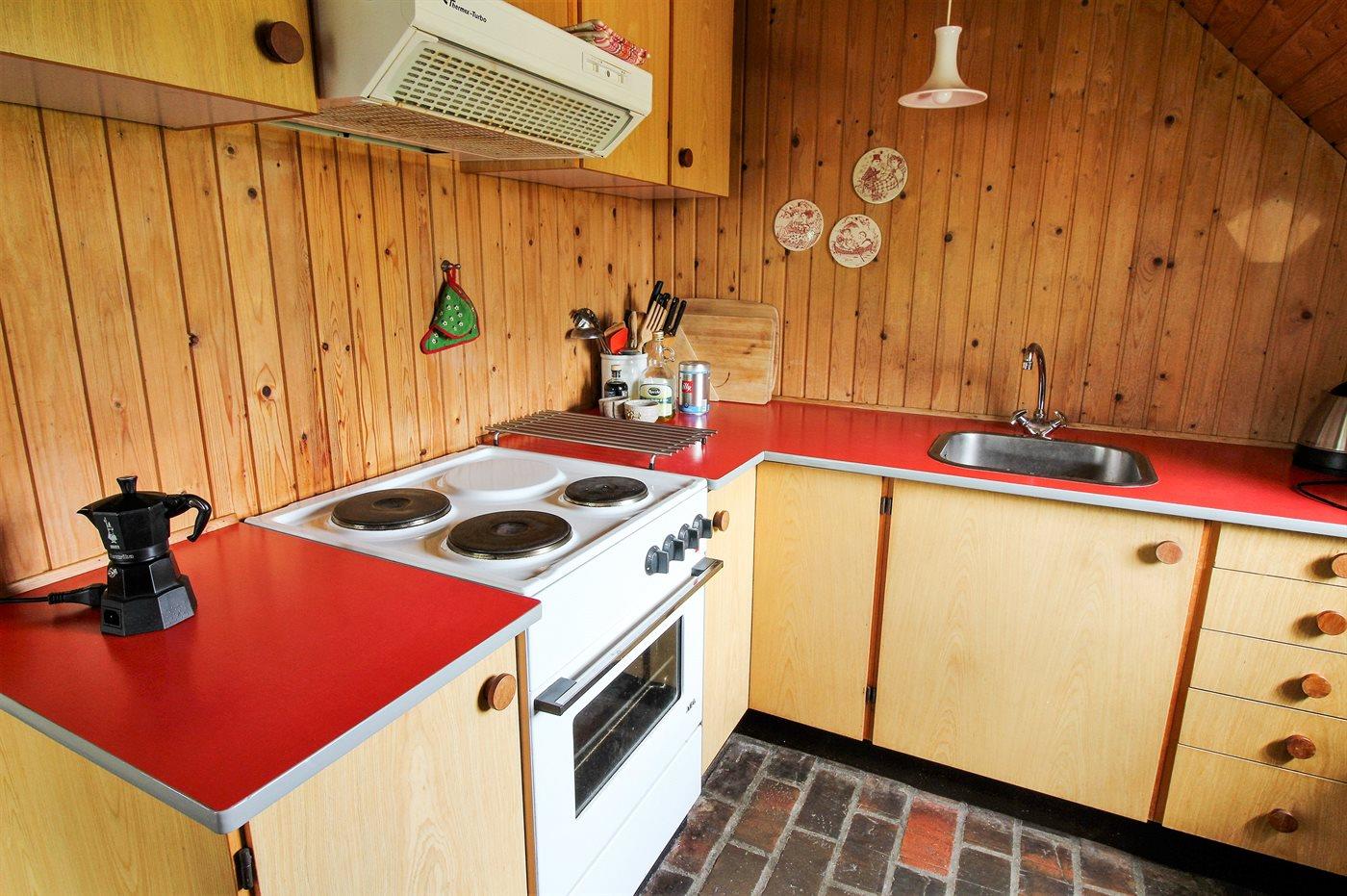 Køkkenet er udstyret med 1 køleskab. Der er 4 keramiske kogeplader, varmluftovn.