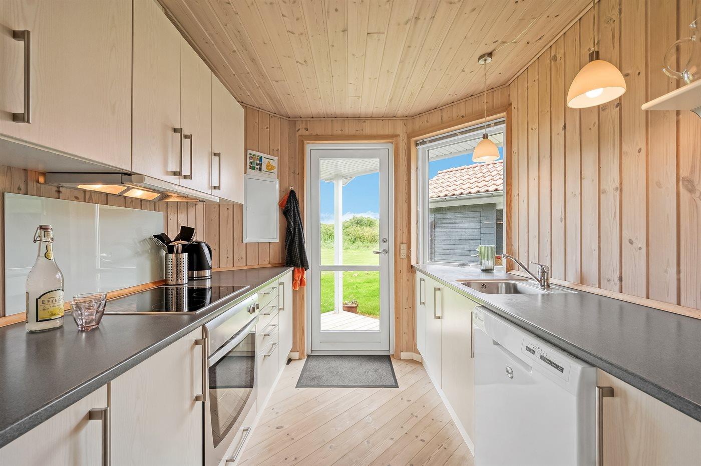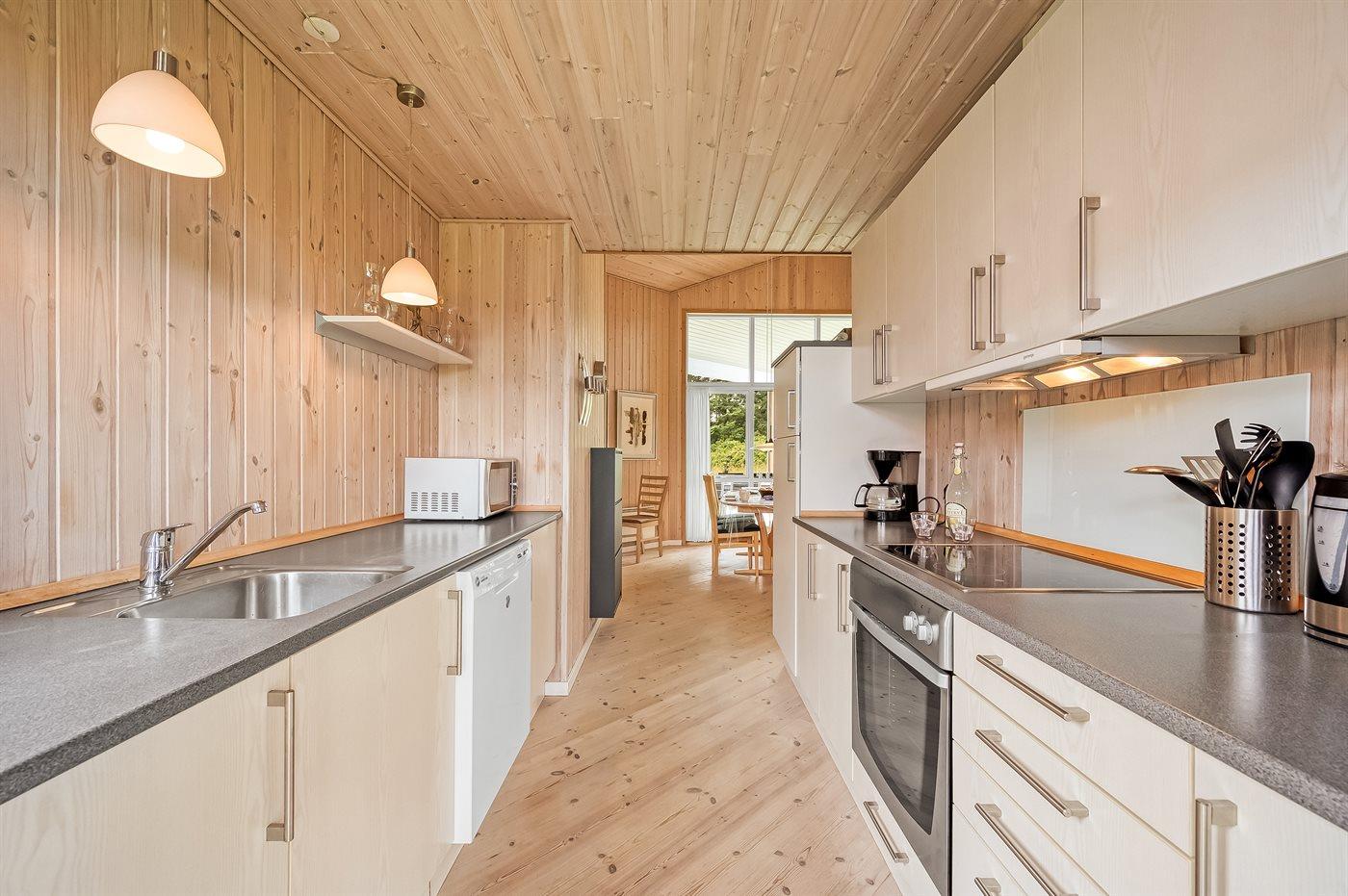 Køkkenet er udstyret med 1 køleskab. Der er 4 keramiske kogeplader, varmluftovn, mikrobølgeovn samt opvaskemaskine.