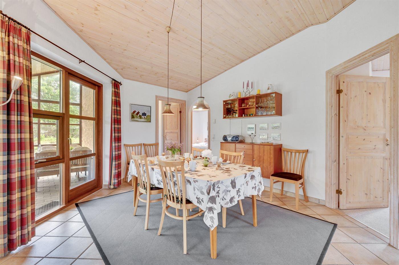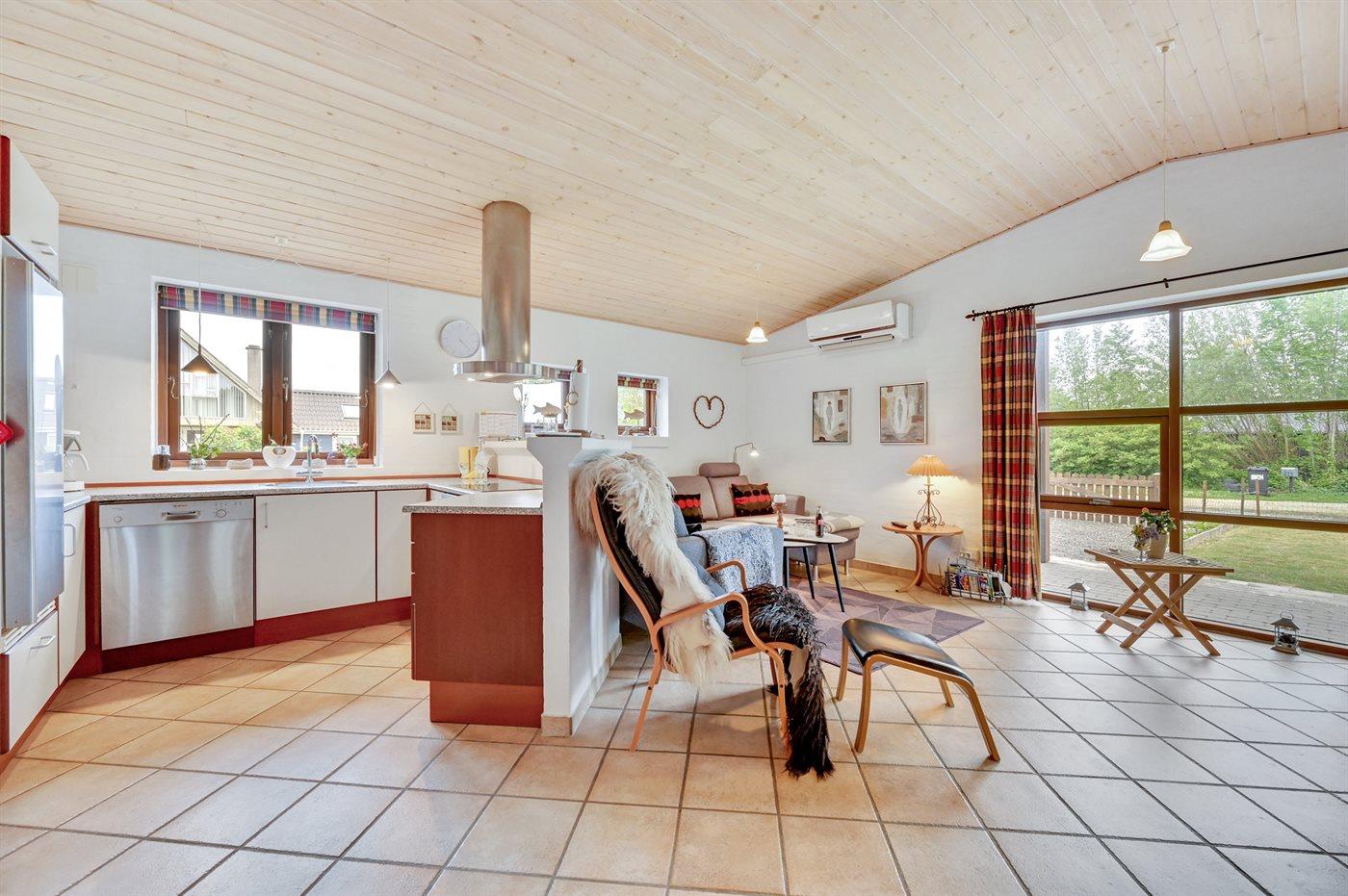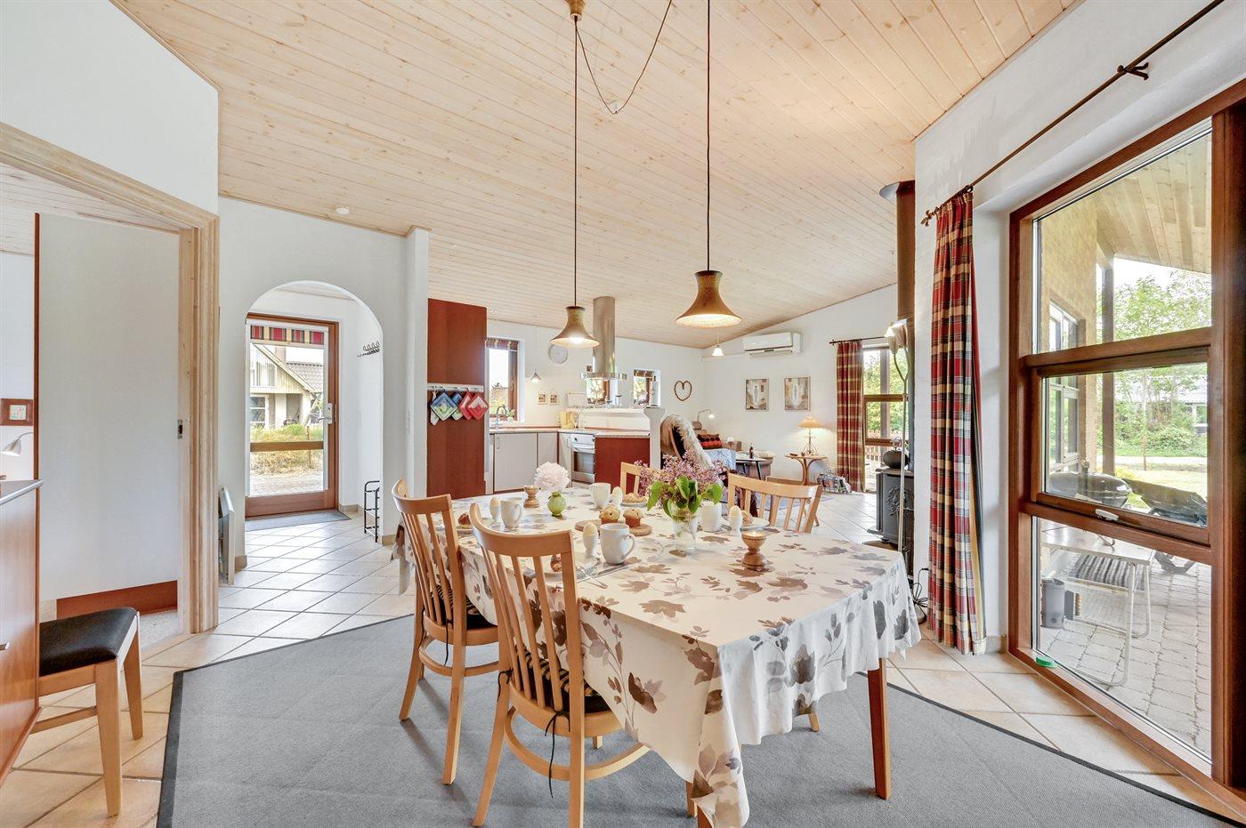 I et naturskønt område mellem hav og fjord ligger dette skønne og rummelige sommerhus, for enden af en lukket vej, på en lukket grund med gode aktivitetsmuligheder for børn.