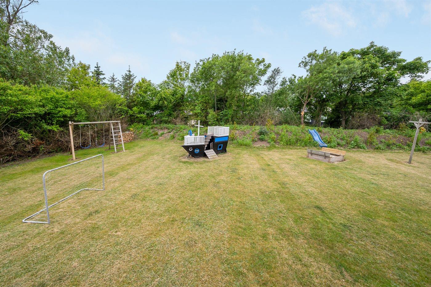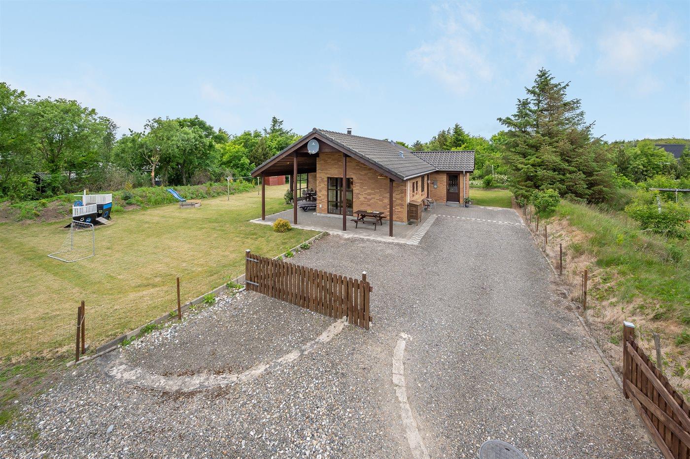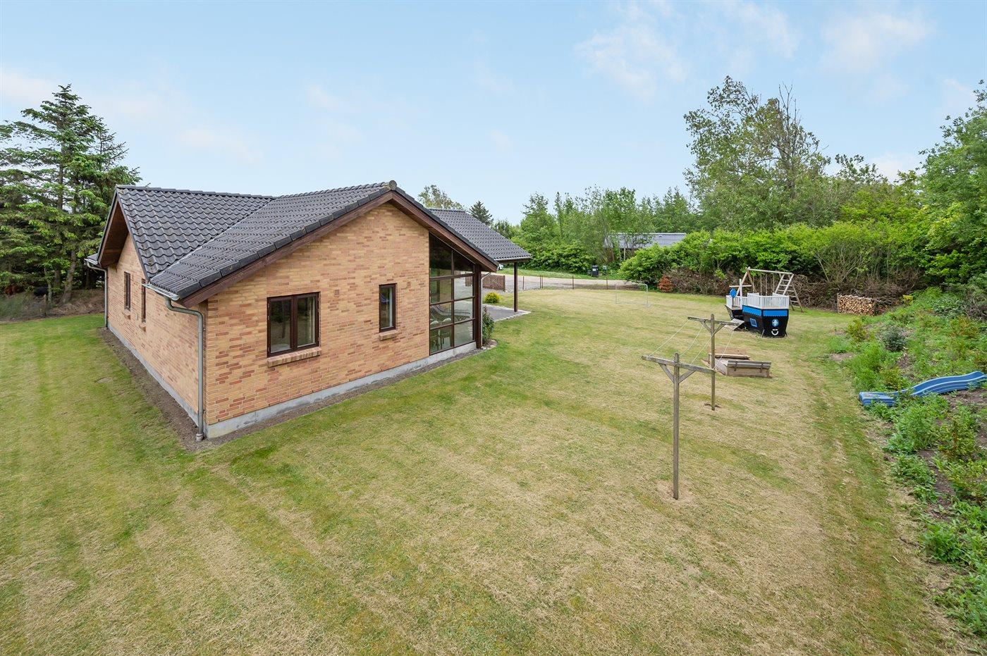 Ferieboligen er beliggende på en 1279 m² stor naturgrund. Grunden er indhegnet. Der er 2000 m til havet. Der er 525 m til fjorden. Nærmeste forretning er beliggende i en afstand af 3700 m. Til ferieboligen hører 20 m² terrasseareal. Desuden er der 20 m² overdækket terrasse. Der er redskabsrum. Gynge. Sandkasse. Legetårn. Grill til rådighed. Parkering ved ferieboligen.