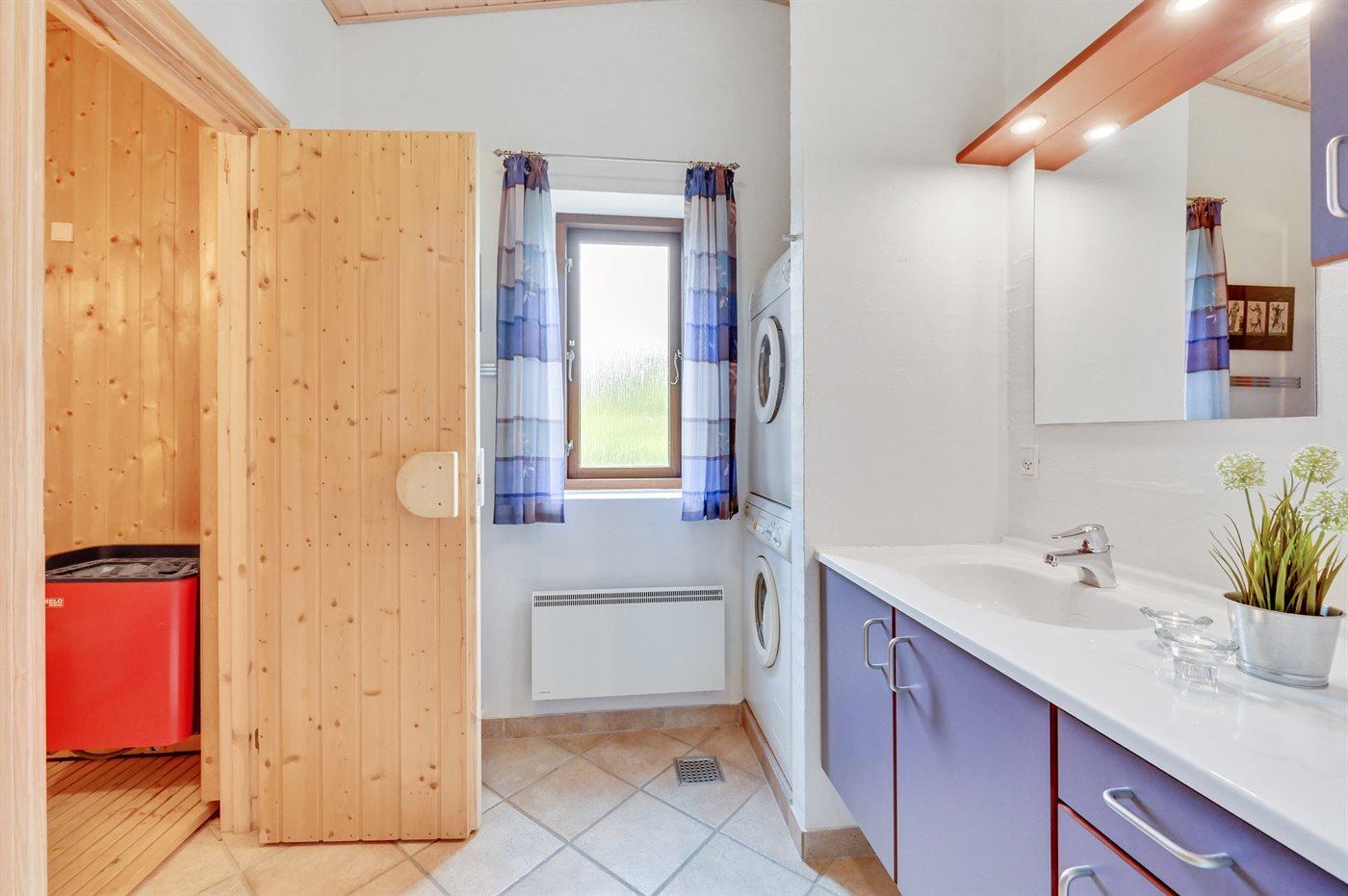 Der er 1 badeværelse med bruseniche og 1 toilet.. Der er gulvvarme på 1 badeværelse. I saunaen er der mulighed for afslapning.