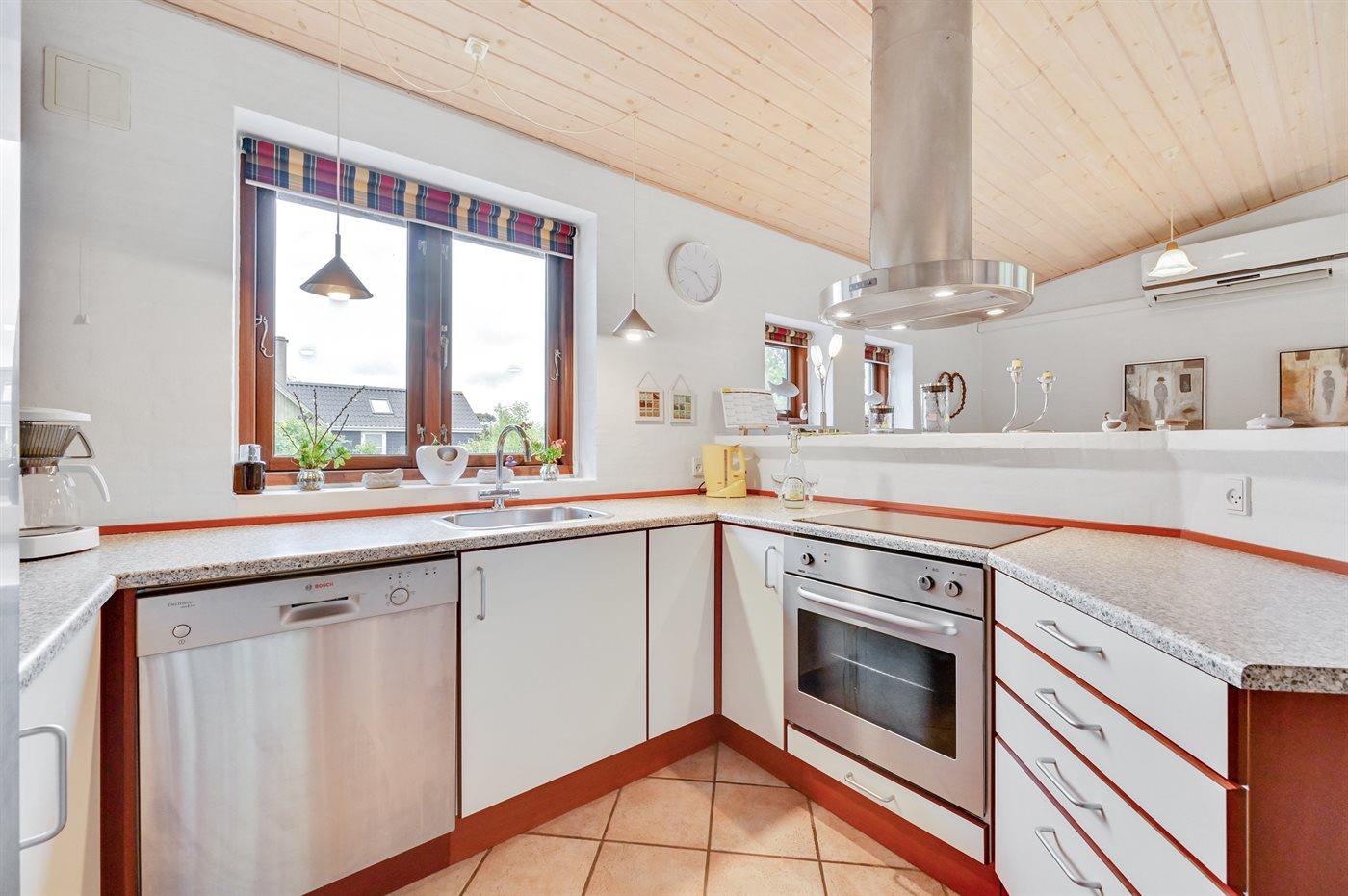 Køkkenet er udstyret med 1 køleskab. Der er 4 keramiske kogeplader, varmluftovn, mikrobølgeovn samt opvaskemaskine.