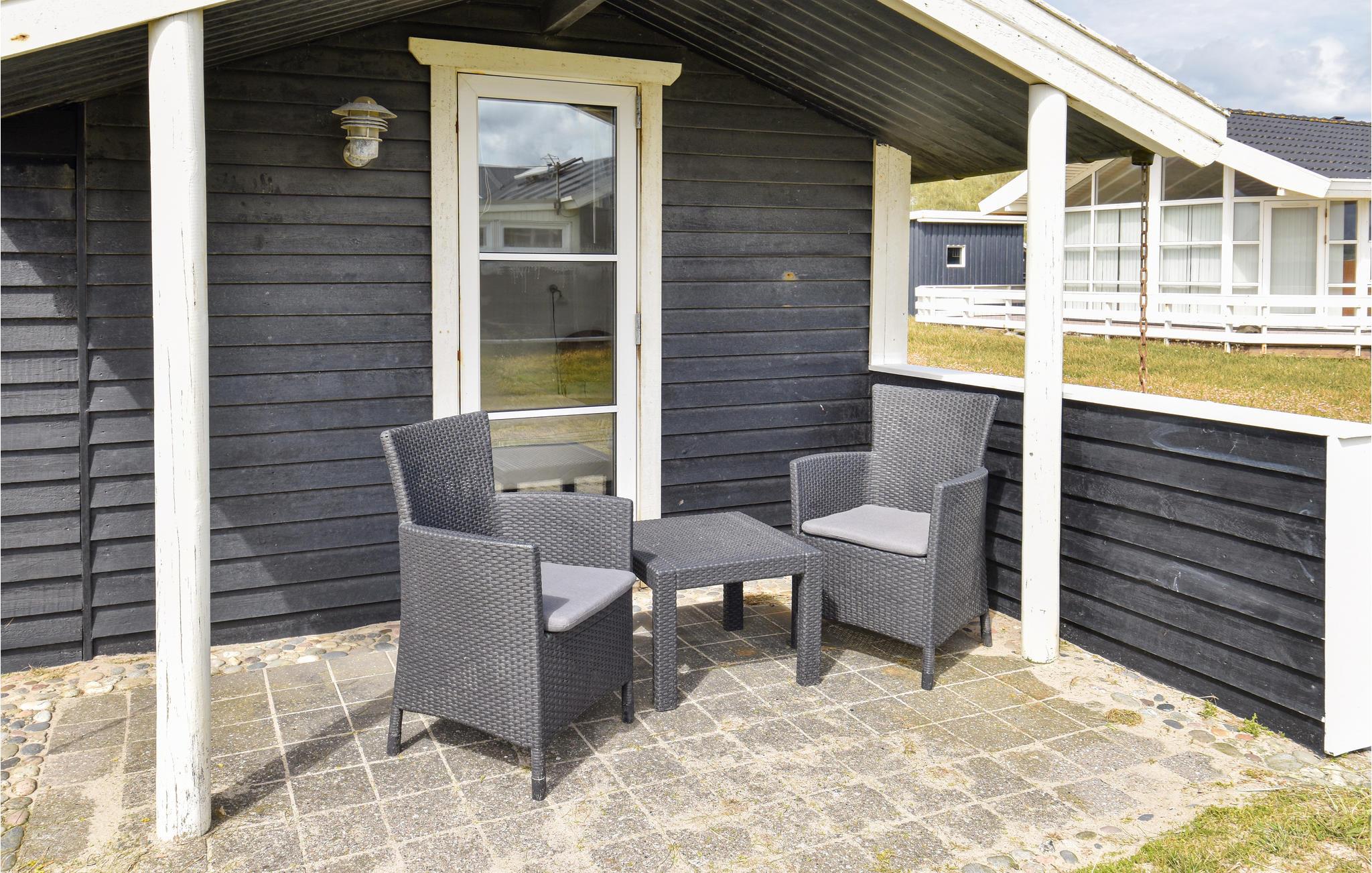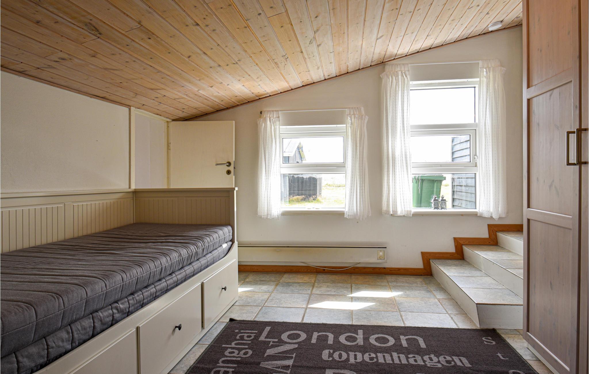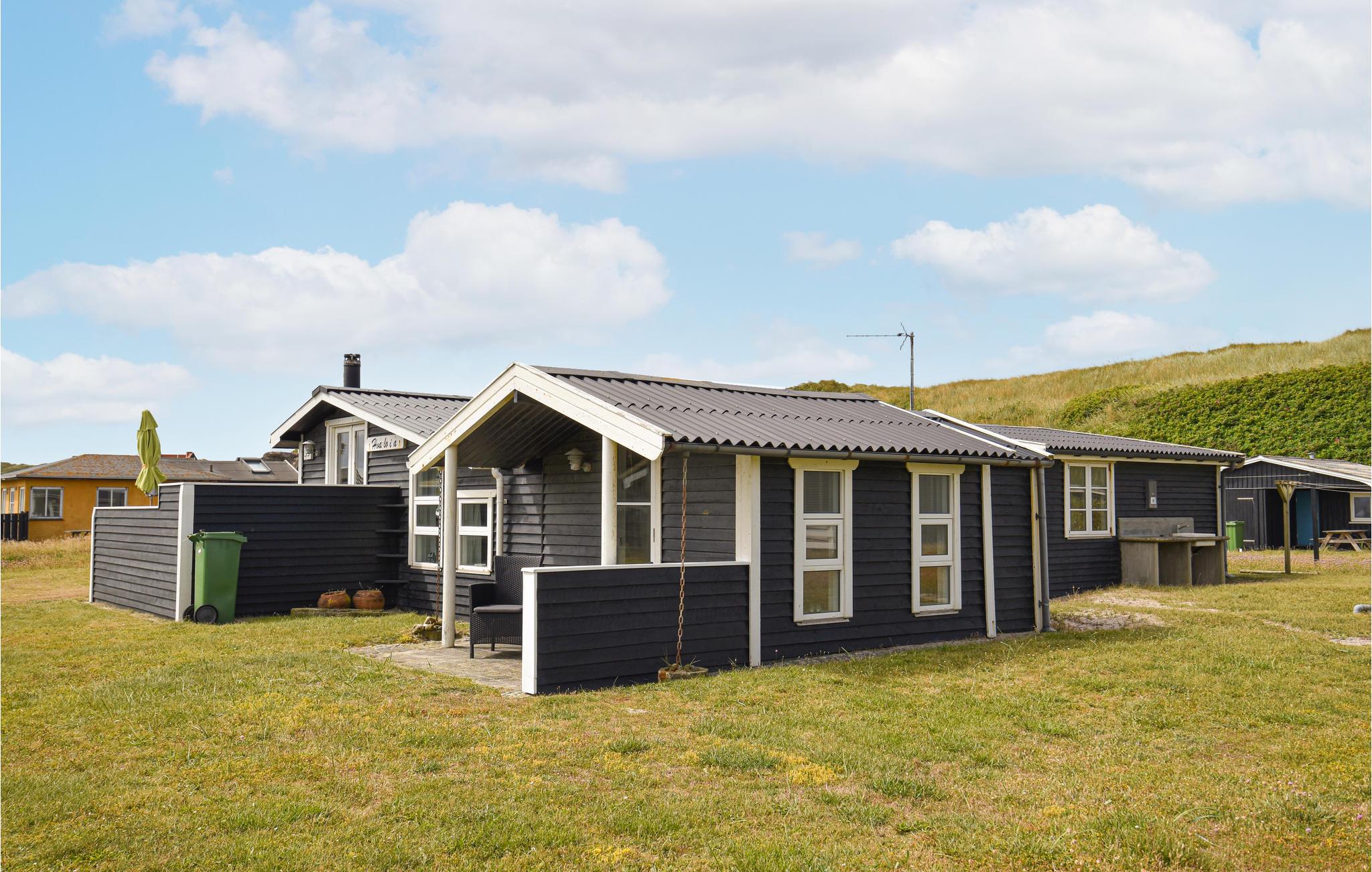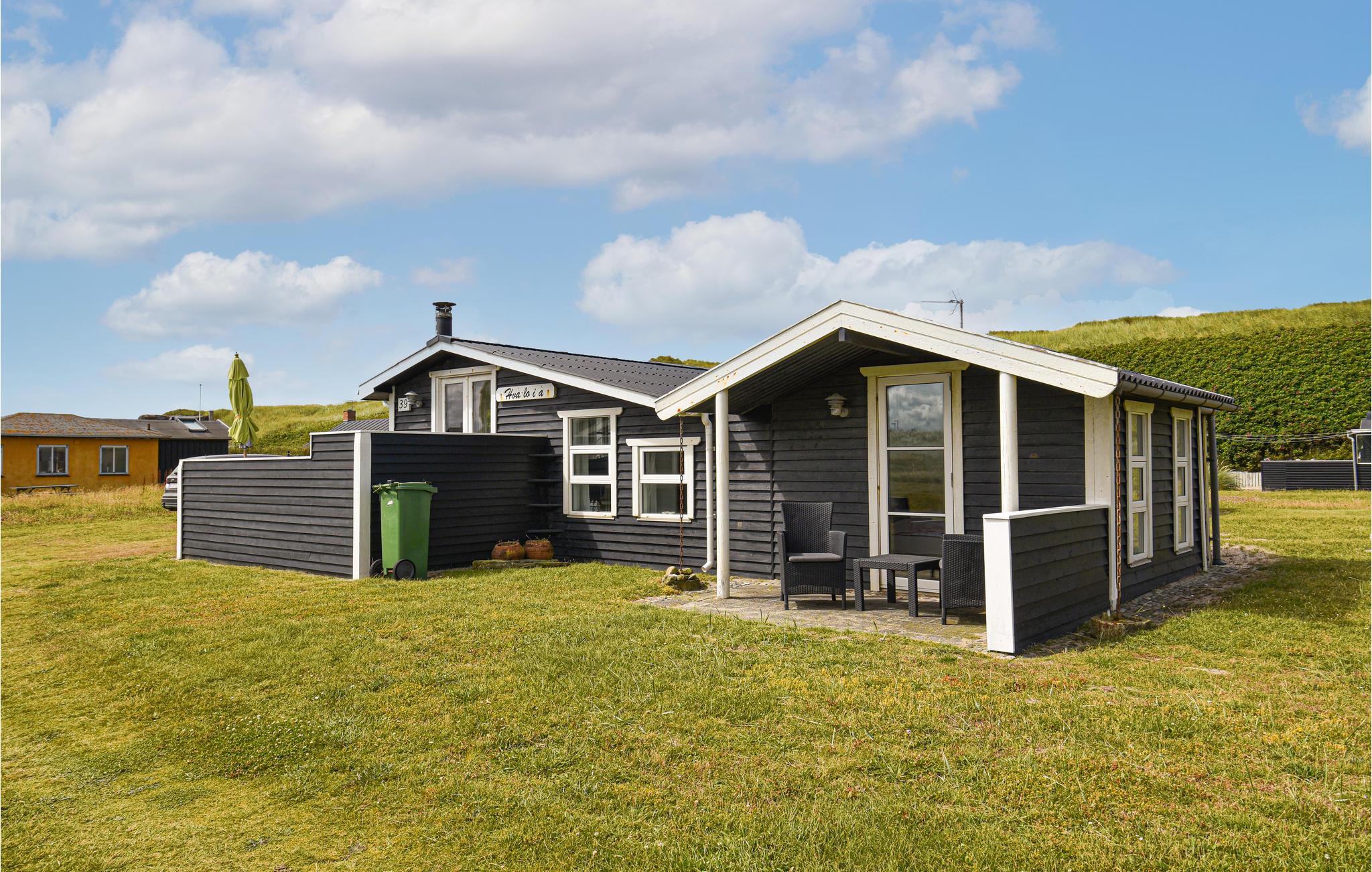 Dette skønne sommerhus ligger helt fantastisk, lige på den anden side af de smukke klitter og det betagende Vesterhav. Huset er godt indrettet med et hovedhus og et anneks. I hovedhuset findes et lyst køkken, stue med brændeovn, tv og behagelige møbler. Fra stuen går et par trin ned til et åbent værelse med en sovesofa, der kan slås ud til to sovepladser. Fra dette værelse er der adgang til husets ene badeværelse med bruser. Soveværelset med en dobbeltseng har udgang til den ene overdækkede terrasse. Døren til dette soveværelse er meget lav.