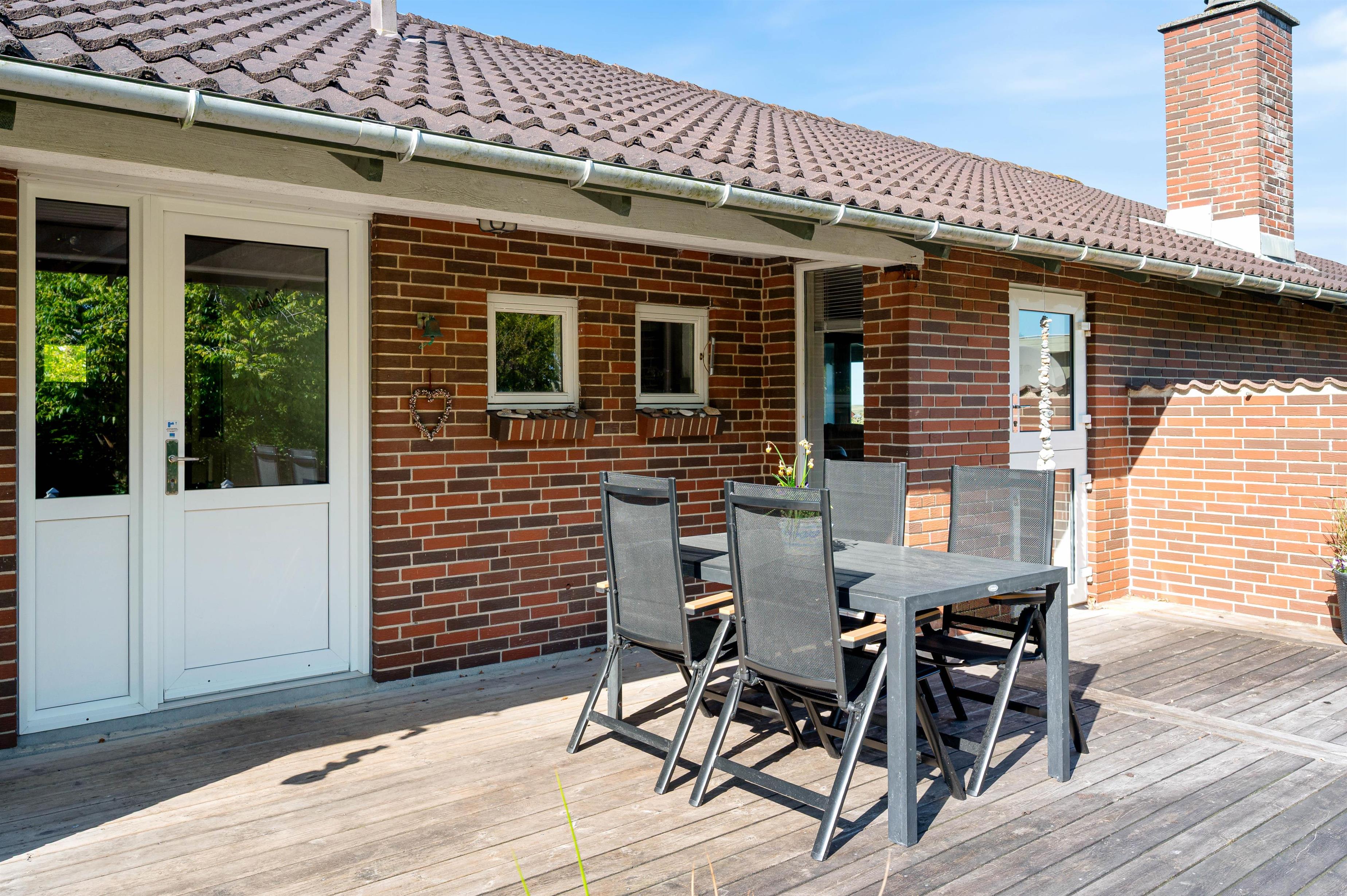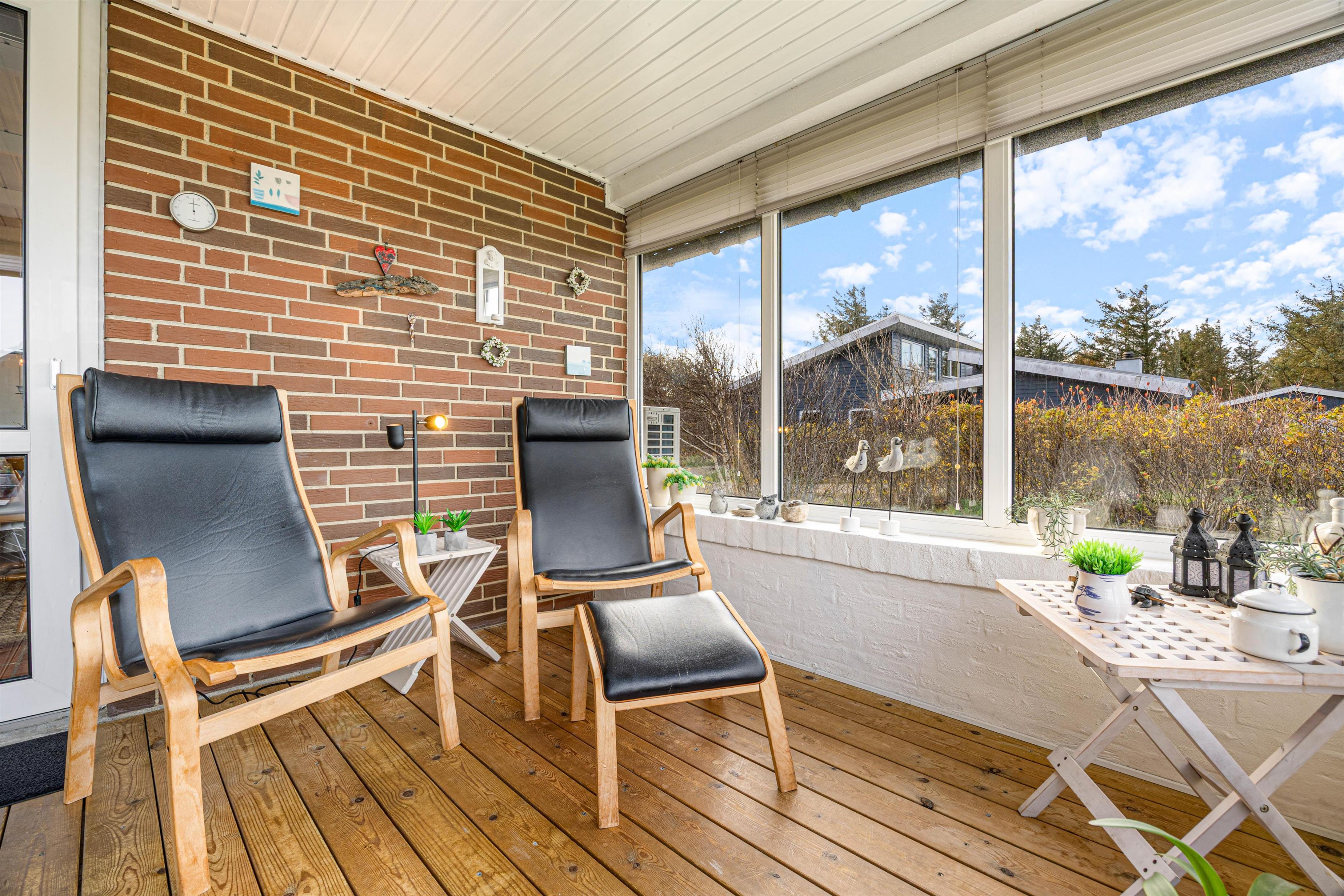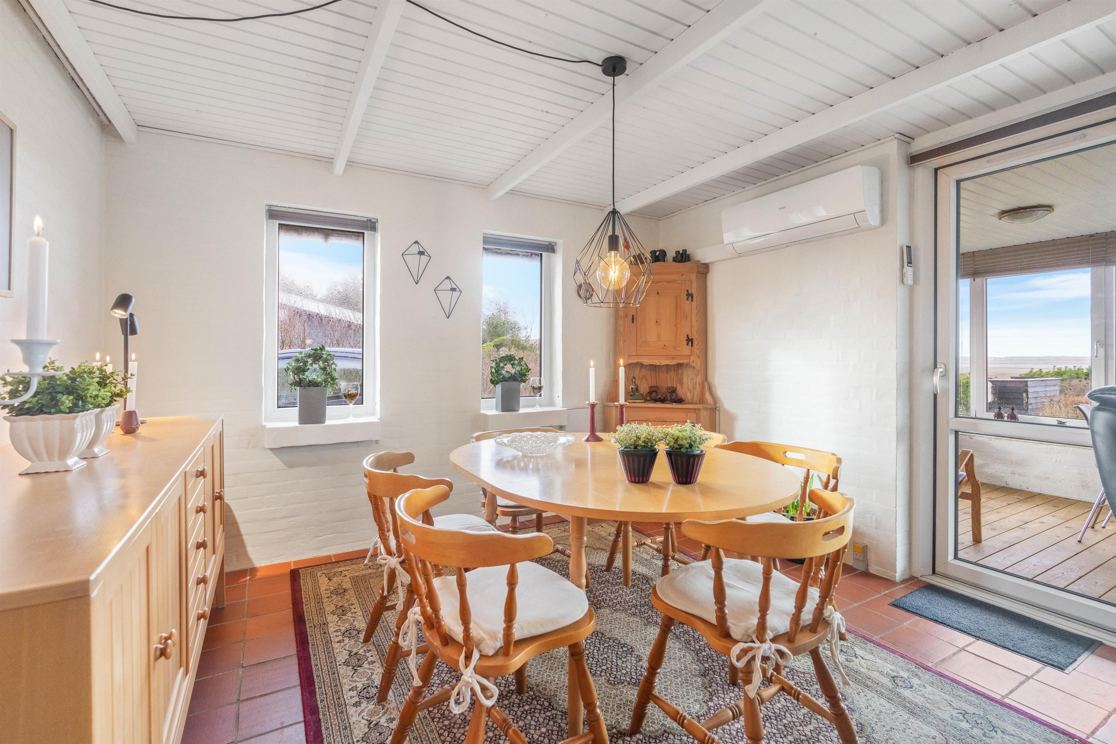 Fra udestuen har I en enestående udsigt! Selv fra spisebordet kan I nyde udsigten over fjorden og klitterne. Mange eftermiddage med brætspil indenfor, hvor der er dejligt lunt, mens vinden suser afsted udenfor.
