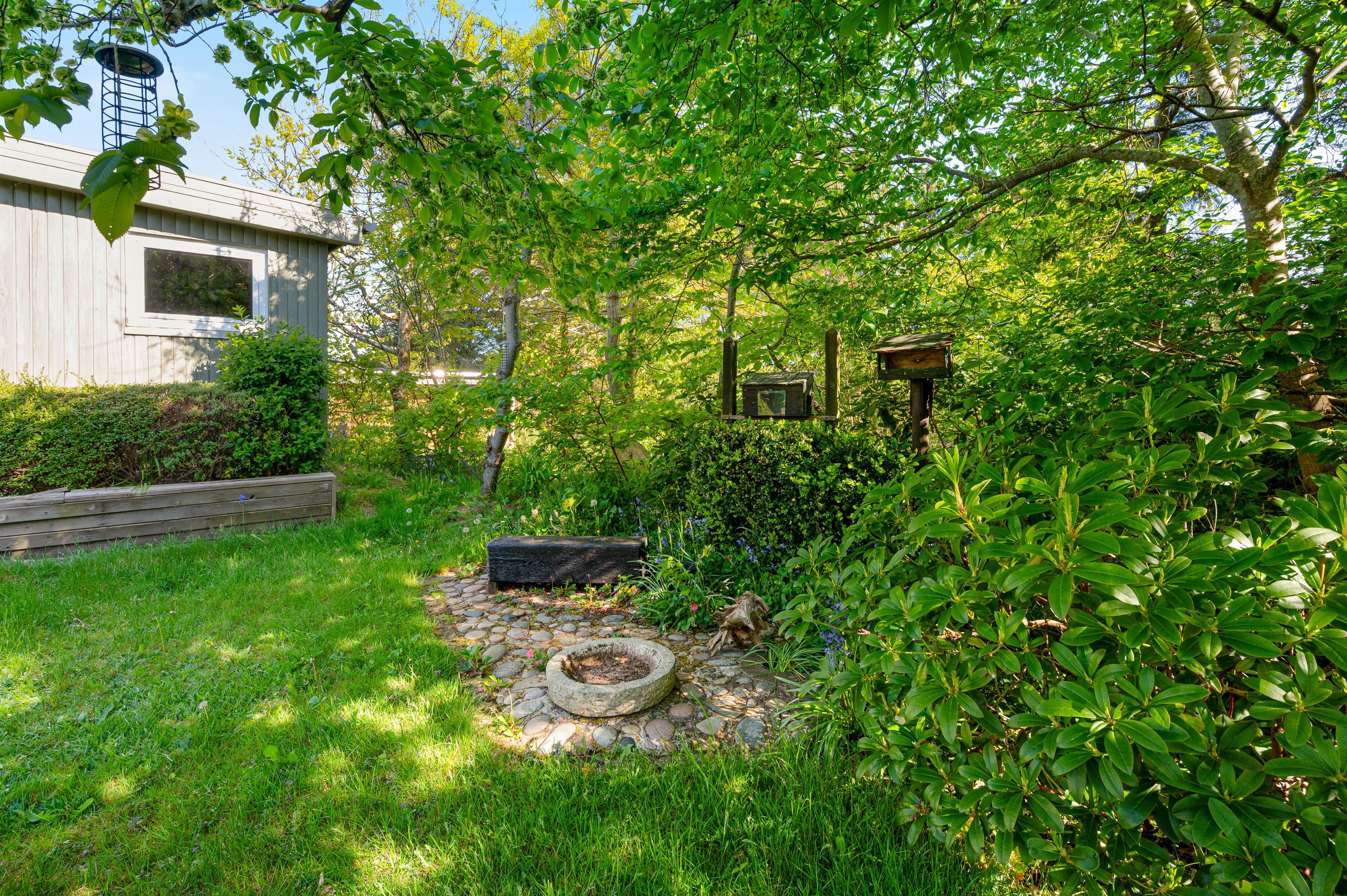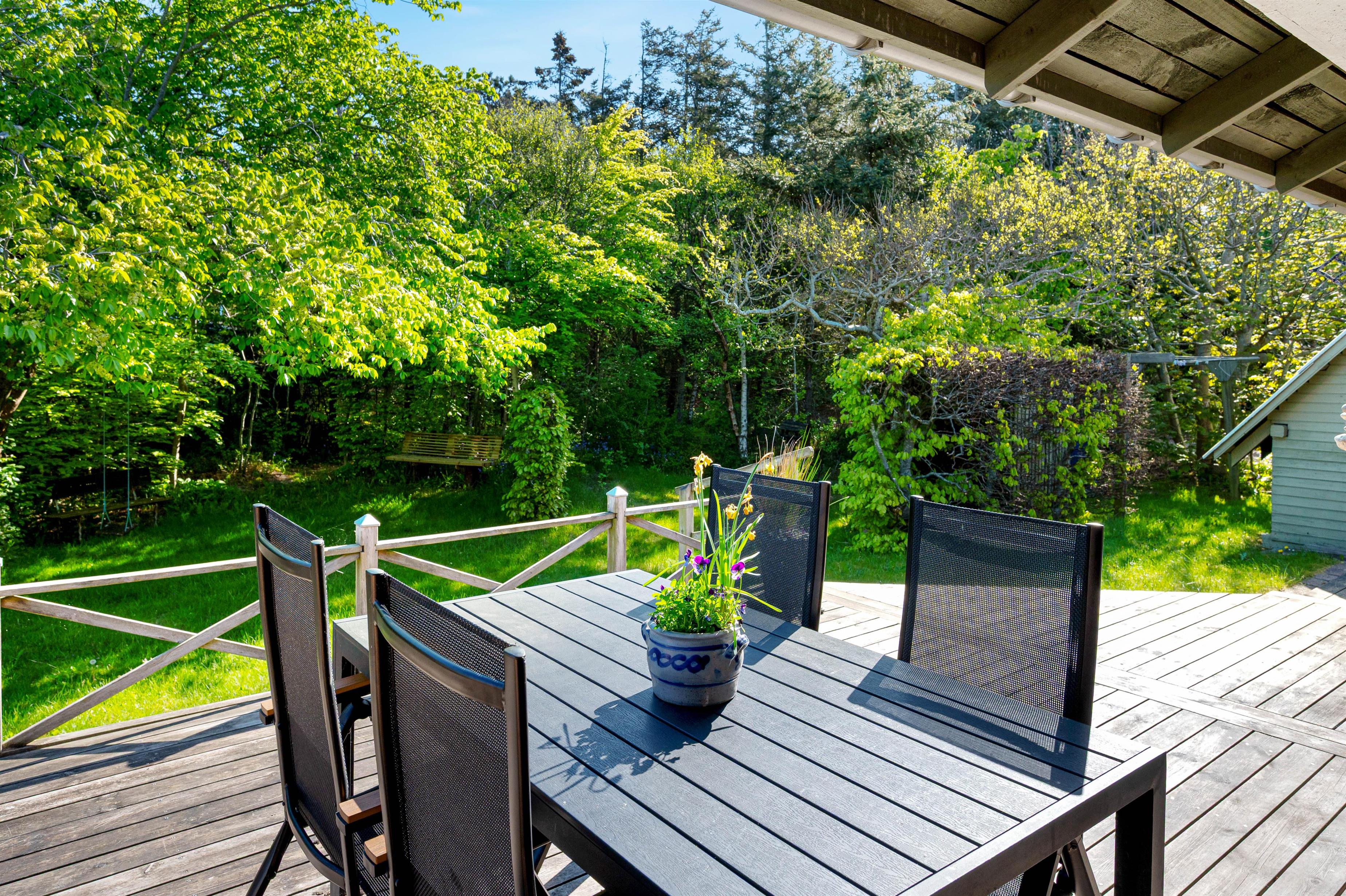 Sommerhusgrunden byder på 2 overdækkede terrasser med afskærmede hjørner, hvor der er rig mulighed for at nyde en forfriskende drik, mens maden tilberedes på den tilgængelige kulgrill. Havemøblerne står naturligvis til fri afbenyttelse, og alt er lagt op til ægte råhygge i de smukke, naturskønne omgivelser.