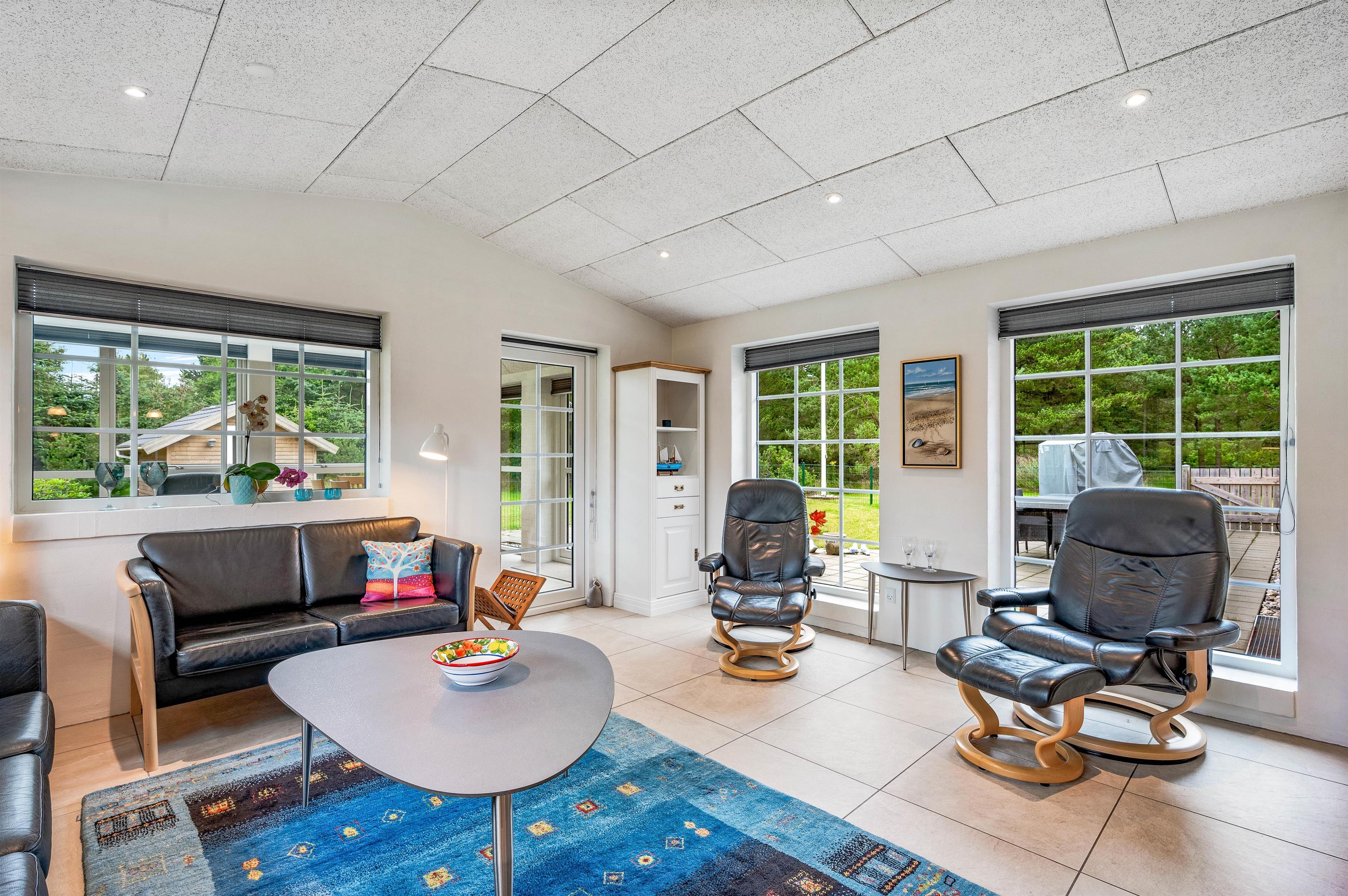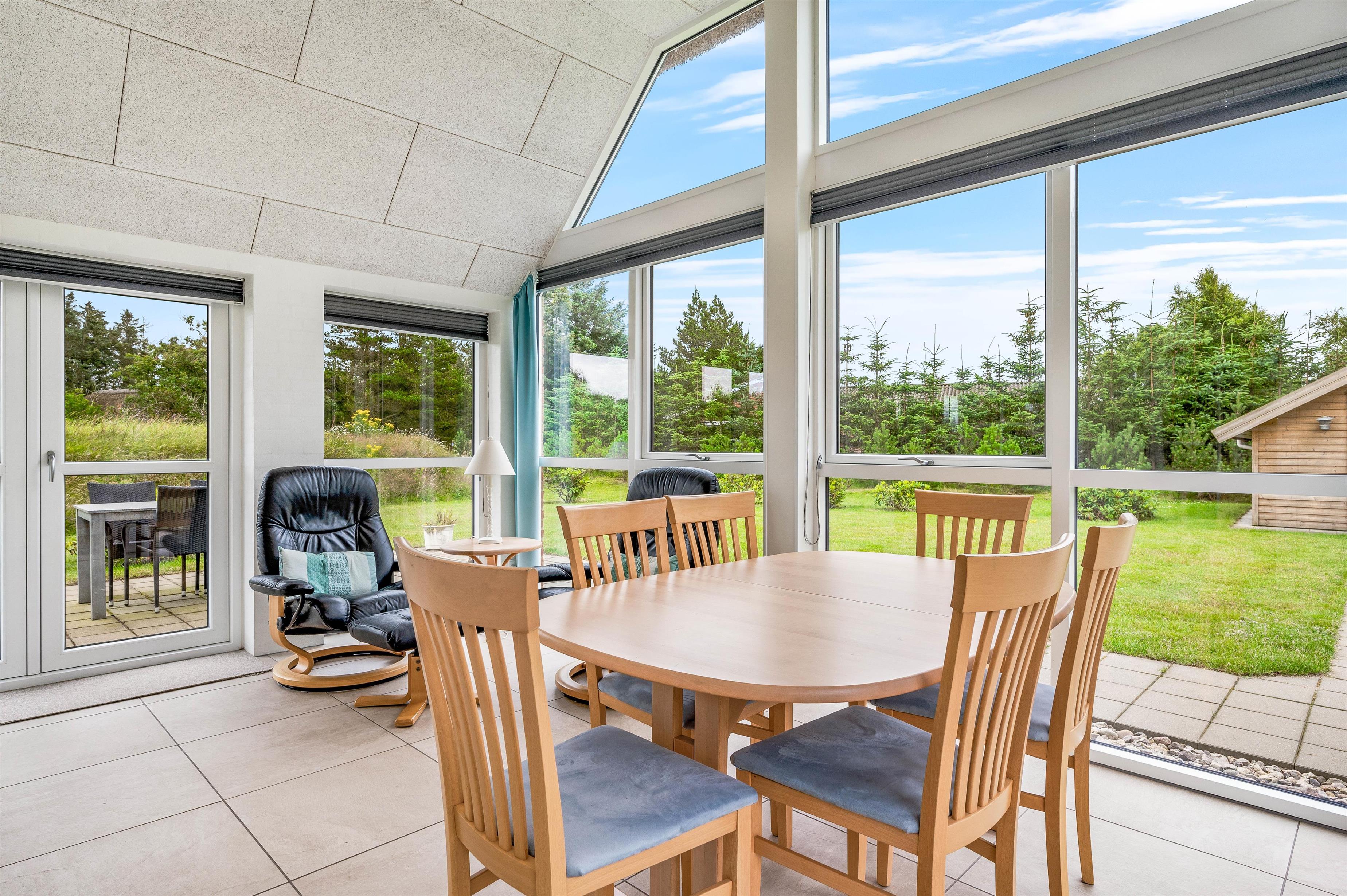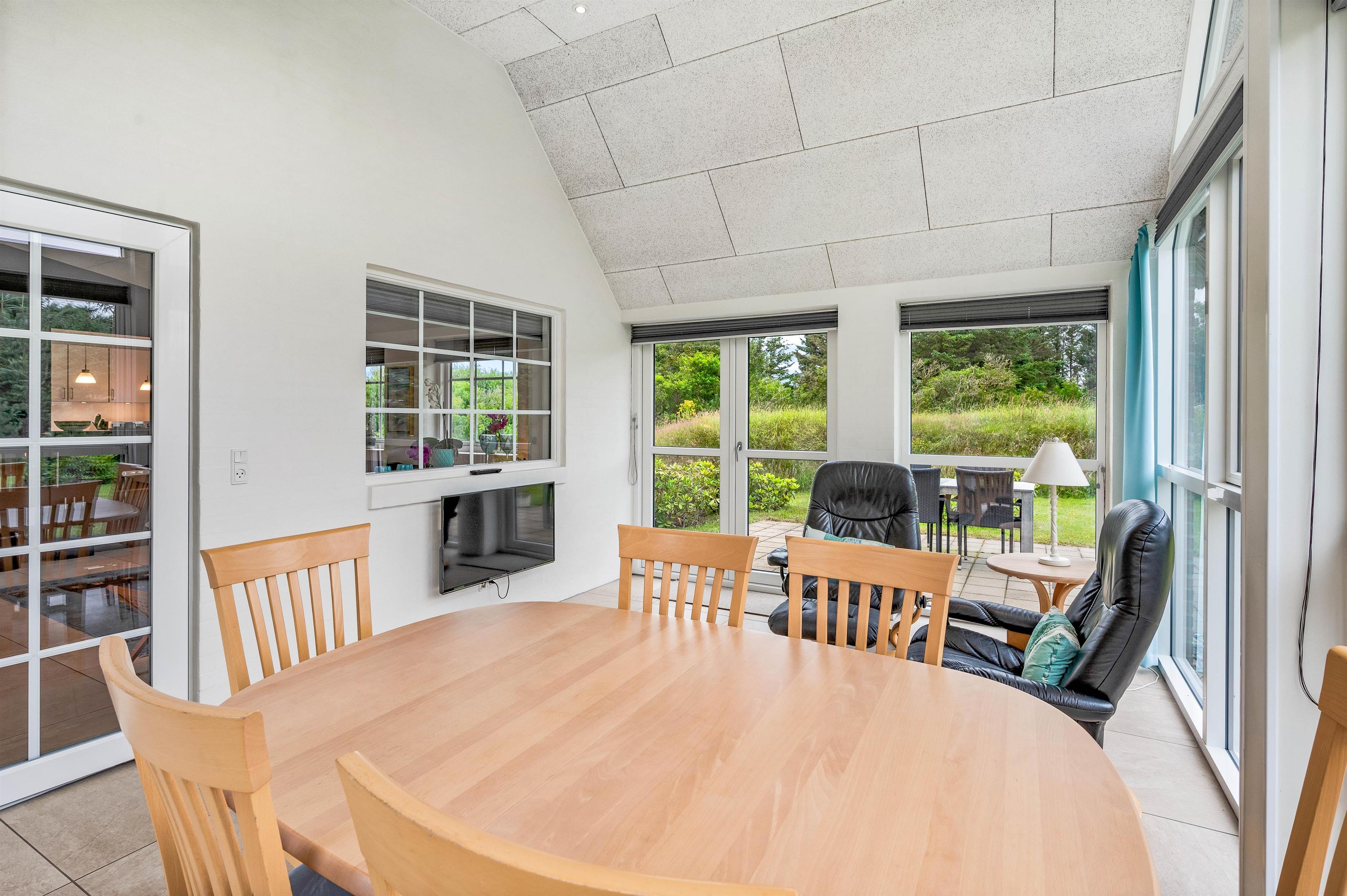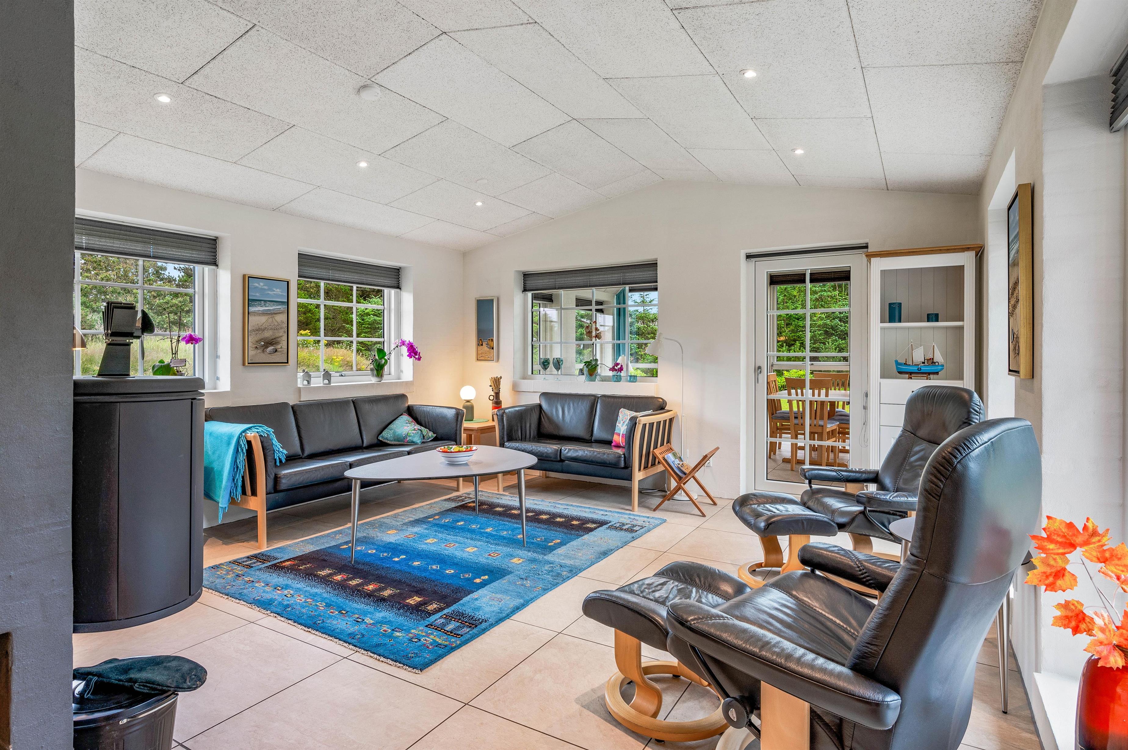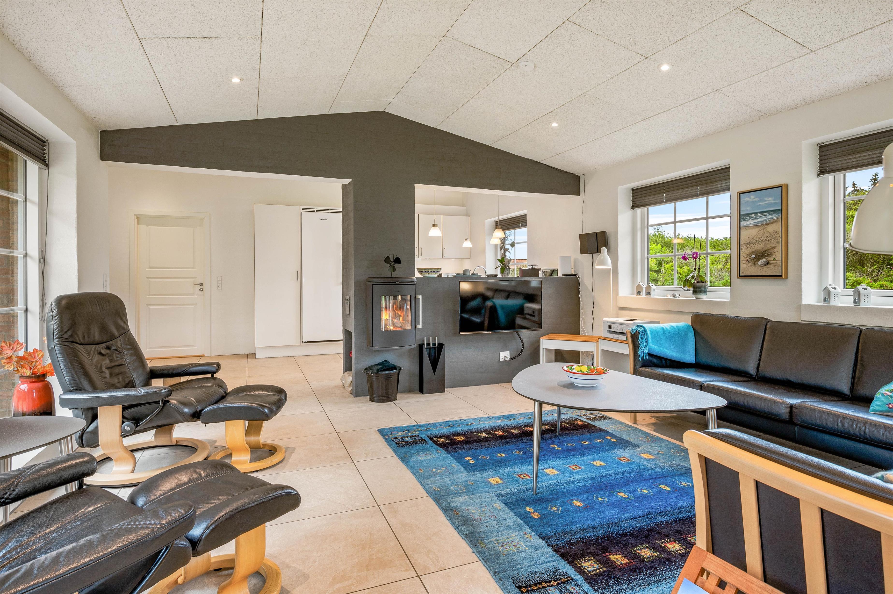 Når I træder ind i feriehuset på Sdr. Fjandvej 10, vil I blive modtaget af lyse og hyggelige omgivelser. Feriehusets hjerte er det store L-formede opholdsrum, som forbinder køkken, stue og spiseafdeling. Her kan I lave mad sammen, spille spil eller se en god film. Brændeovnen i opholdsstuen sørger for den ægte feriehusstemning og en fantastisk varme, som også udstråler en helt særlig hygge. Der er også en luft til vand varmepumpe. Ved siden af opholdsstuen finder I feriehusets udestue. Her kan I nyde jeres første kaffe med udsigt til haven om morgenen, når det endnu ikke er varmt udenfor.