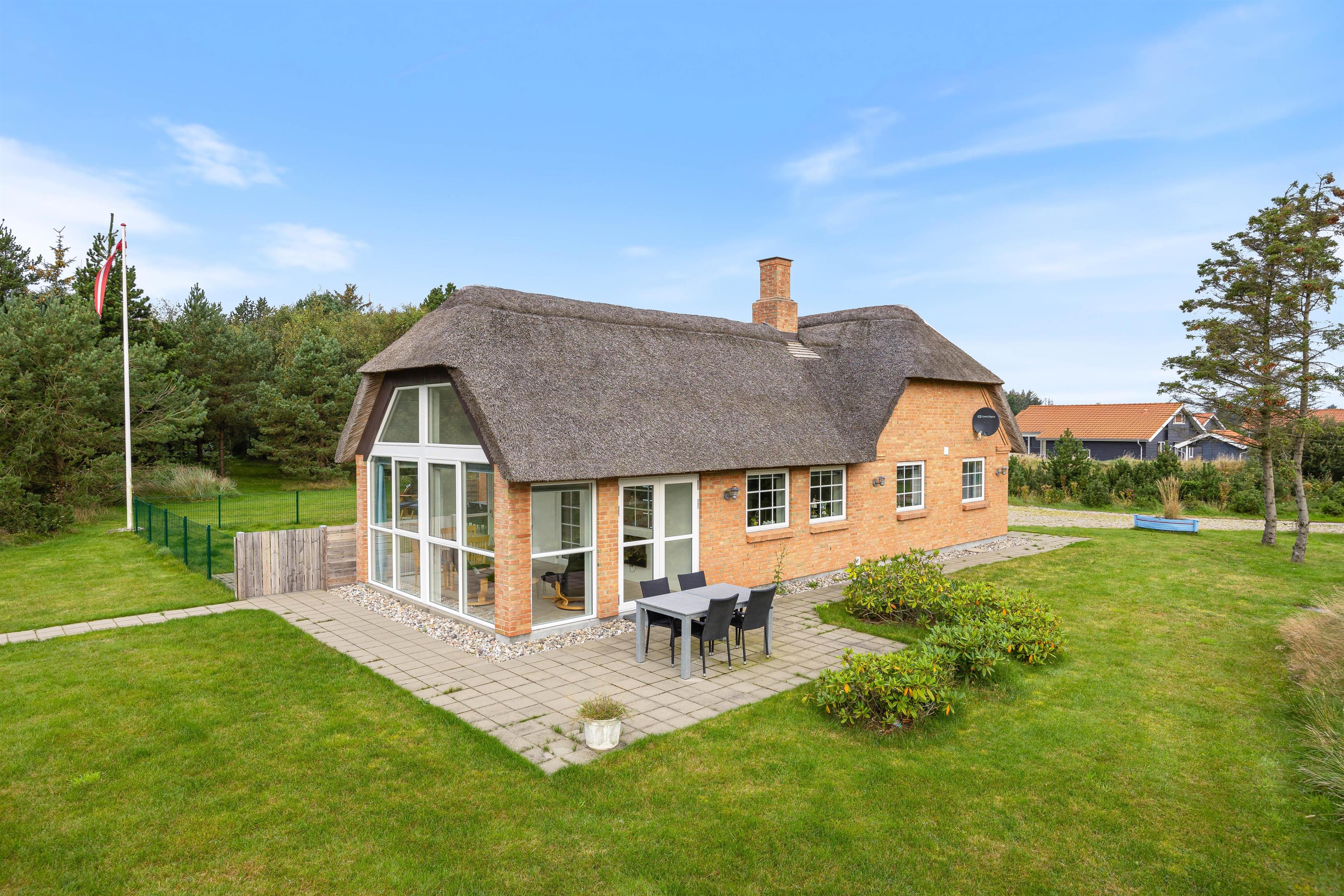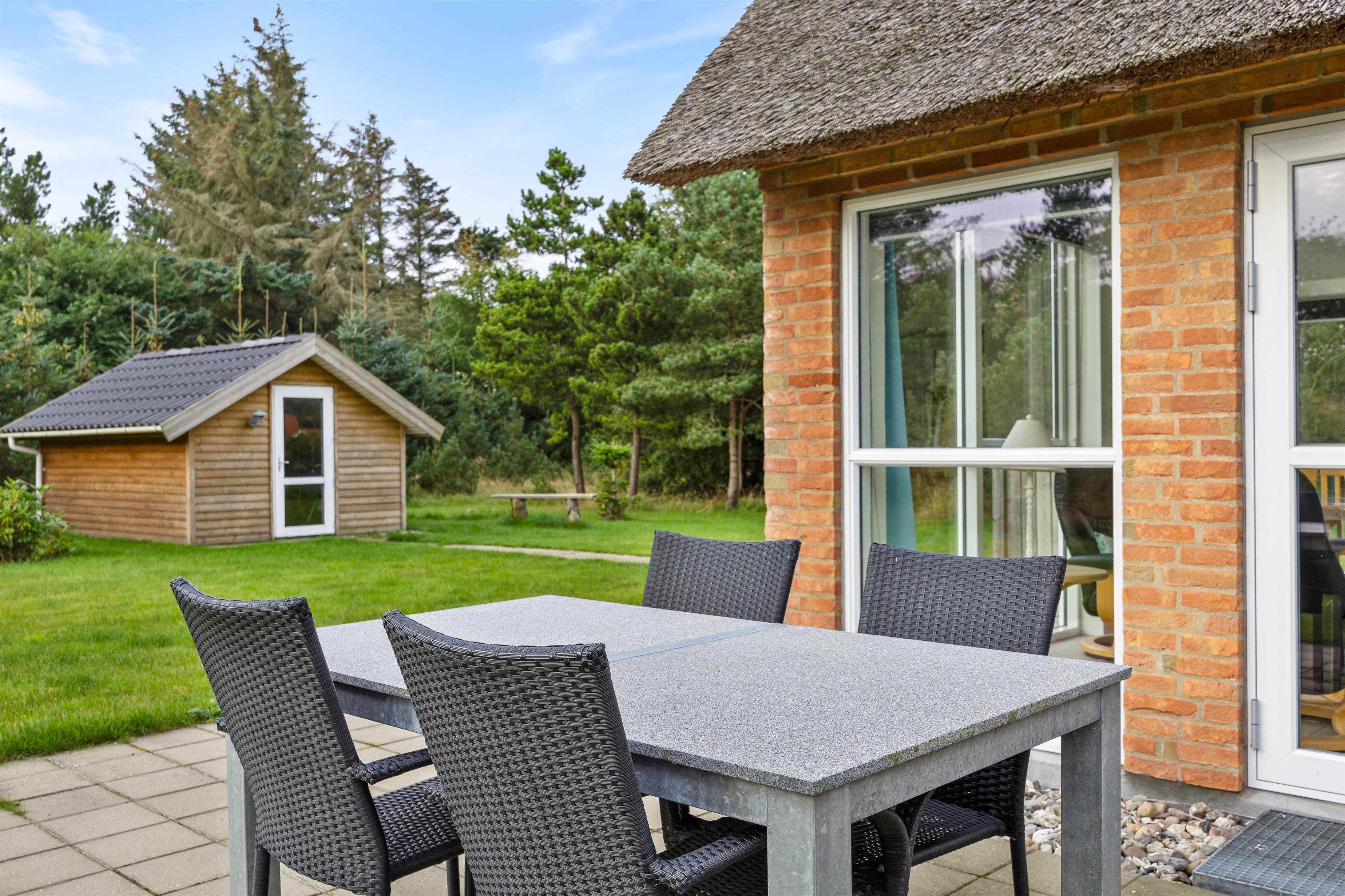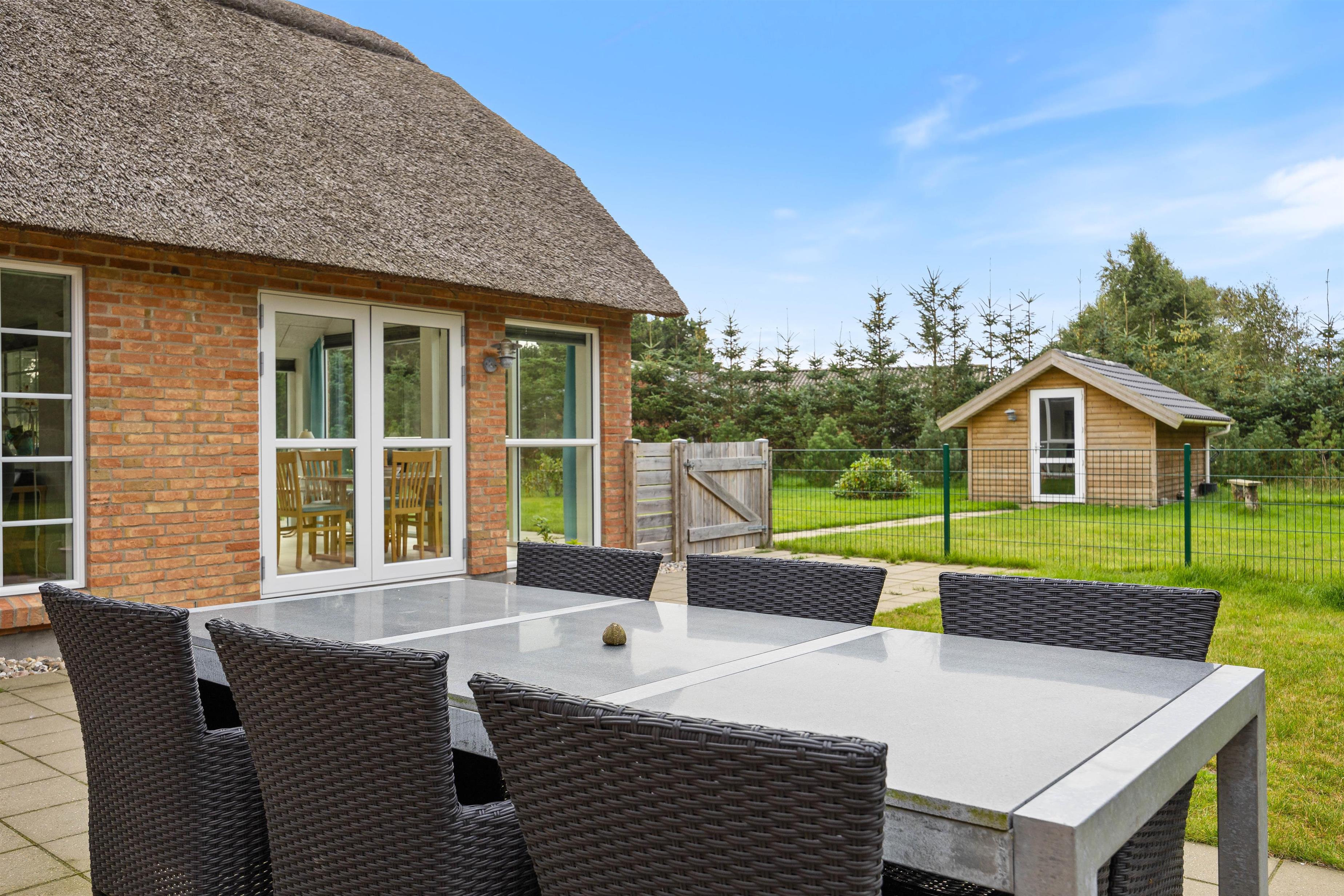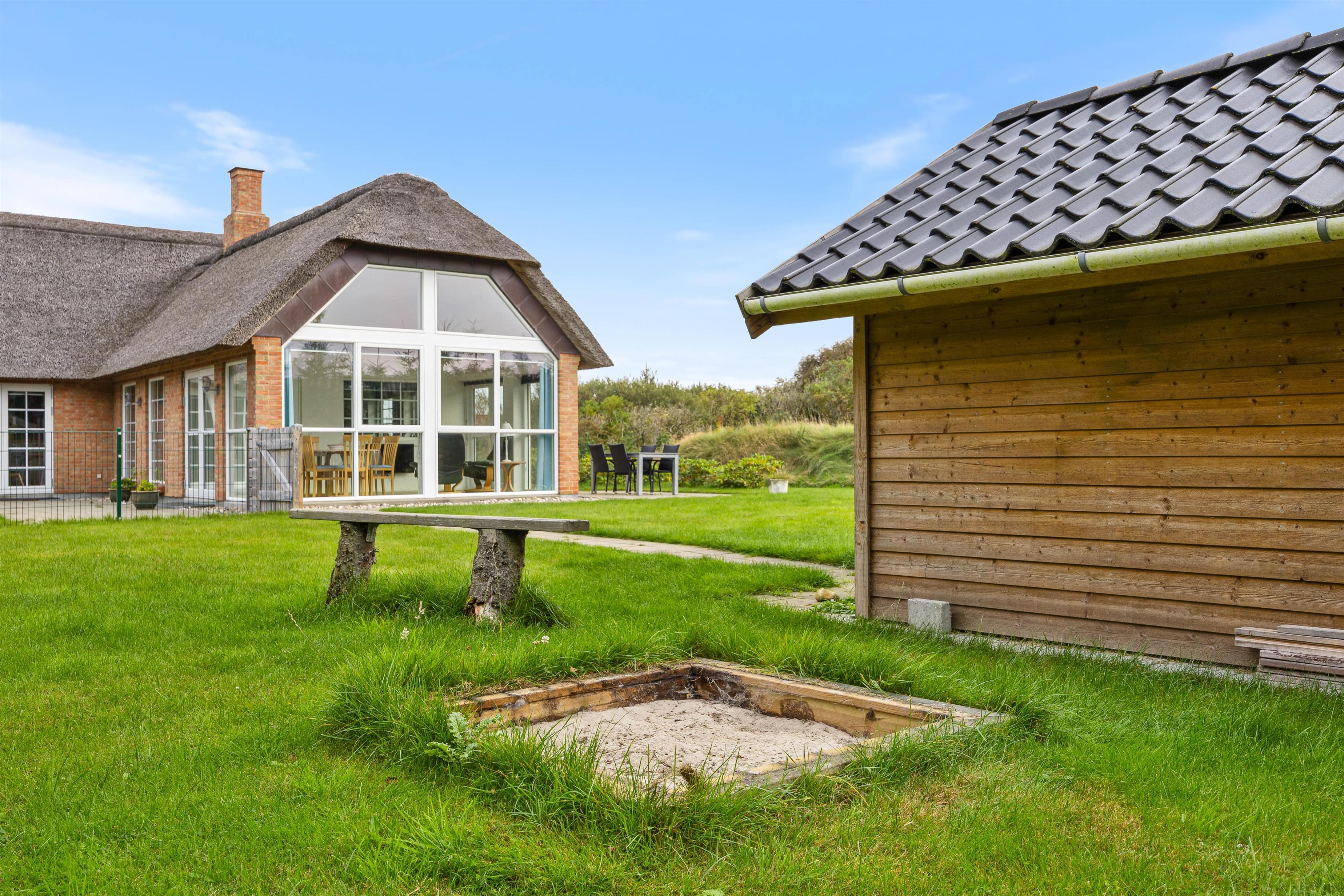 Den østvendte terrasse er åben og oplagt til at nyde dagens første kop kaffe i solopgangen. Den sydvendte terrasse er indhegnet, hvilket gør huset ideelt som et hundevenligt feriehus – eller til børnefamilier, der ønsker trygge omgivelser, mens de voksne slapper af i solen med en kold drink.