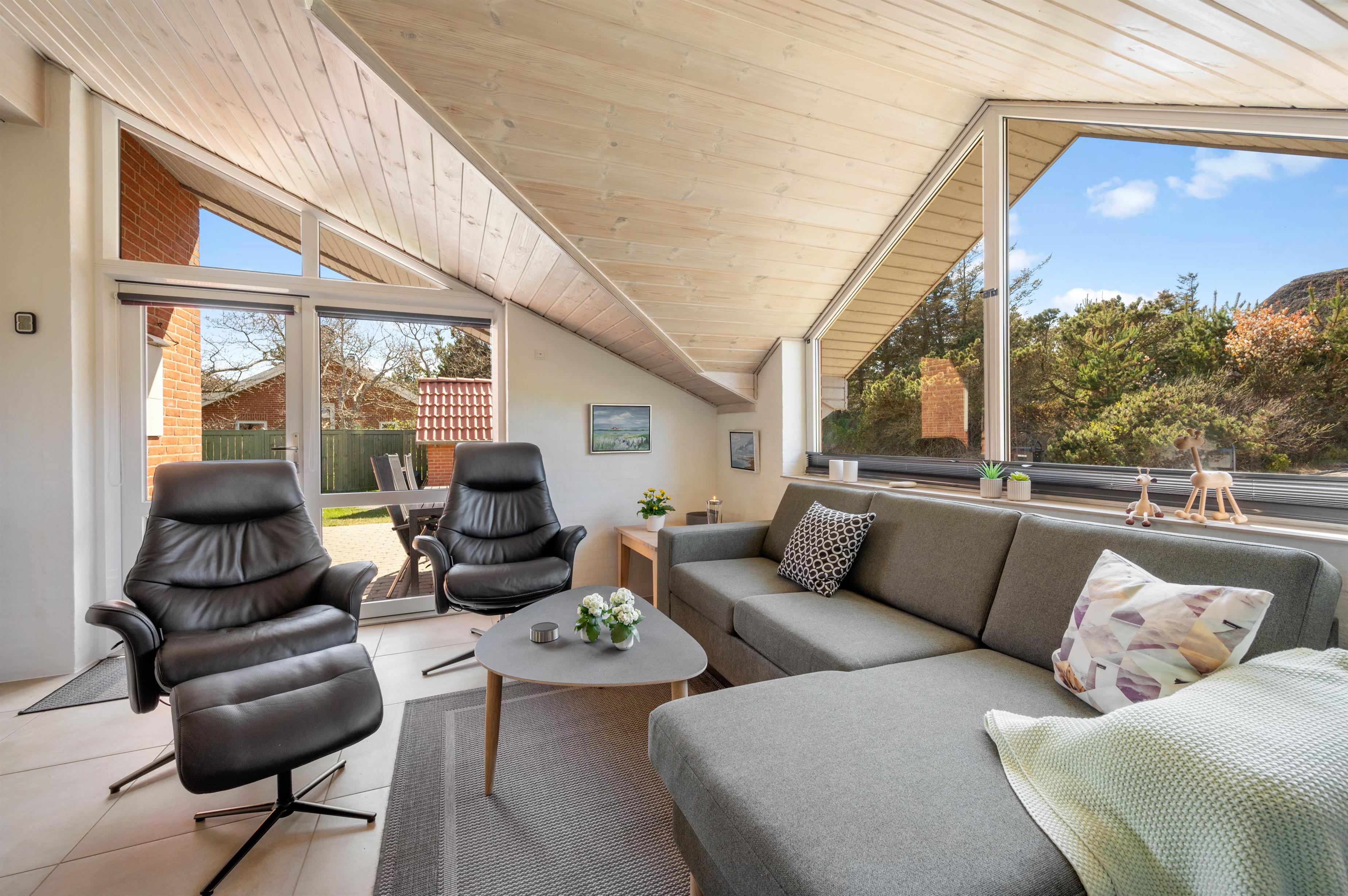 Indretningen er lys og indbydende med brændeovn, og der er ekstra luksus i form af både spa og sauna. Her er rig mulighed for at slappe af efter en dag ved Vesterhavet.