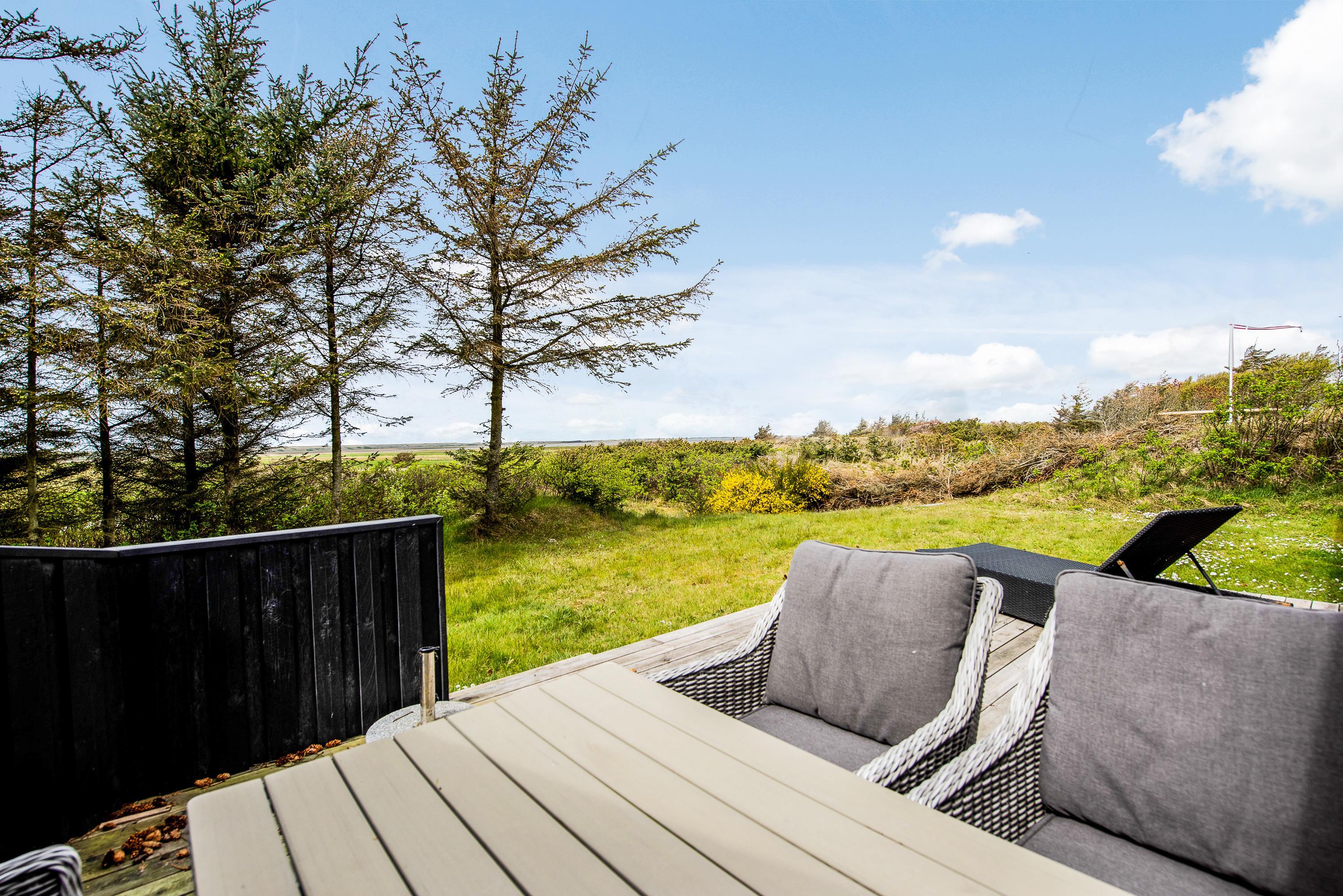 Huset har terrasse både mod syd, øst og vest. Terrassen mod syd og øst hænger sammen og er lukket hele vejen rundt med rækværk og låger. Her er der god plads til, at hundene kan komme ud, uden at I skal bekymre jer om, hvorvidt de mon selv tager på tur. Fra stuen kommer I ud på den vestvendte terrasse, hvorfra I har en helt fantastisk udsigt til de åbne marker og Nissum Fjord. På den østvendte terrasse kan I tage morgenkaffen med udenfor og få dagens første solstråler med, mens fuglene synger og vestkysten stille vågner op. Den overdækkede og delvist afskærmede terrasse mod syd giver jer tilmed mulighed for at sidde ude og nyde en dejlig grillaften i læ.