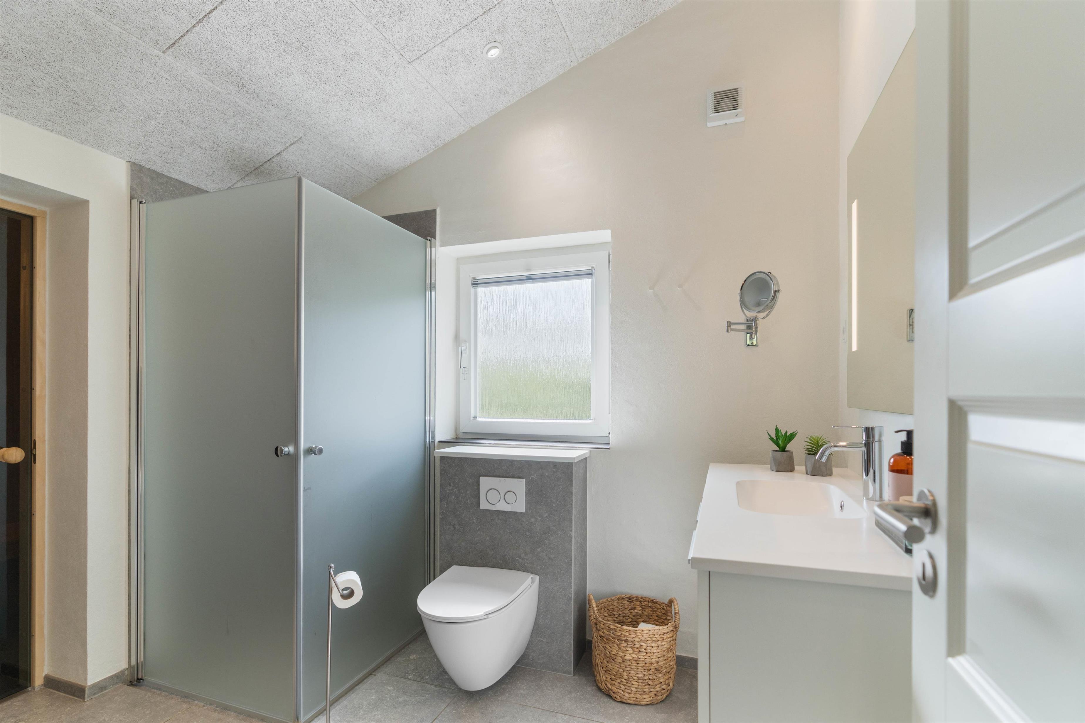Huset har både et badeværelse og et gæstetoilet. På det store badeværelse har I ikke kun indgang til saunaen, der er også et badekar (og en almindelig bruseniche).