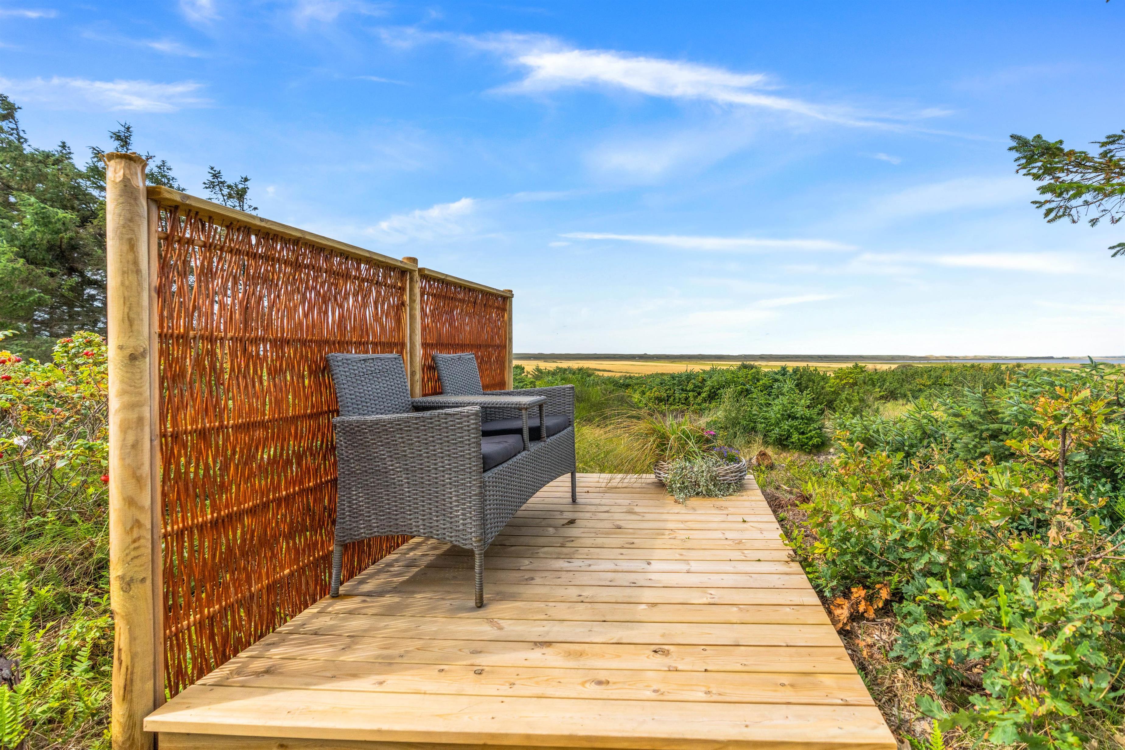 De store vinduer i opholdsrummet giver et skønt lysindfald og ikke mindst en rigtig fin udsigt til den grønne natur og et kig til både klitter og fjorden. Spisestue, stue og køkken er kombineret til ét stort fællesrum med masser af mulighed for samvær og hygge på højt plan i rolige ferieomgivelser.