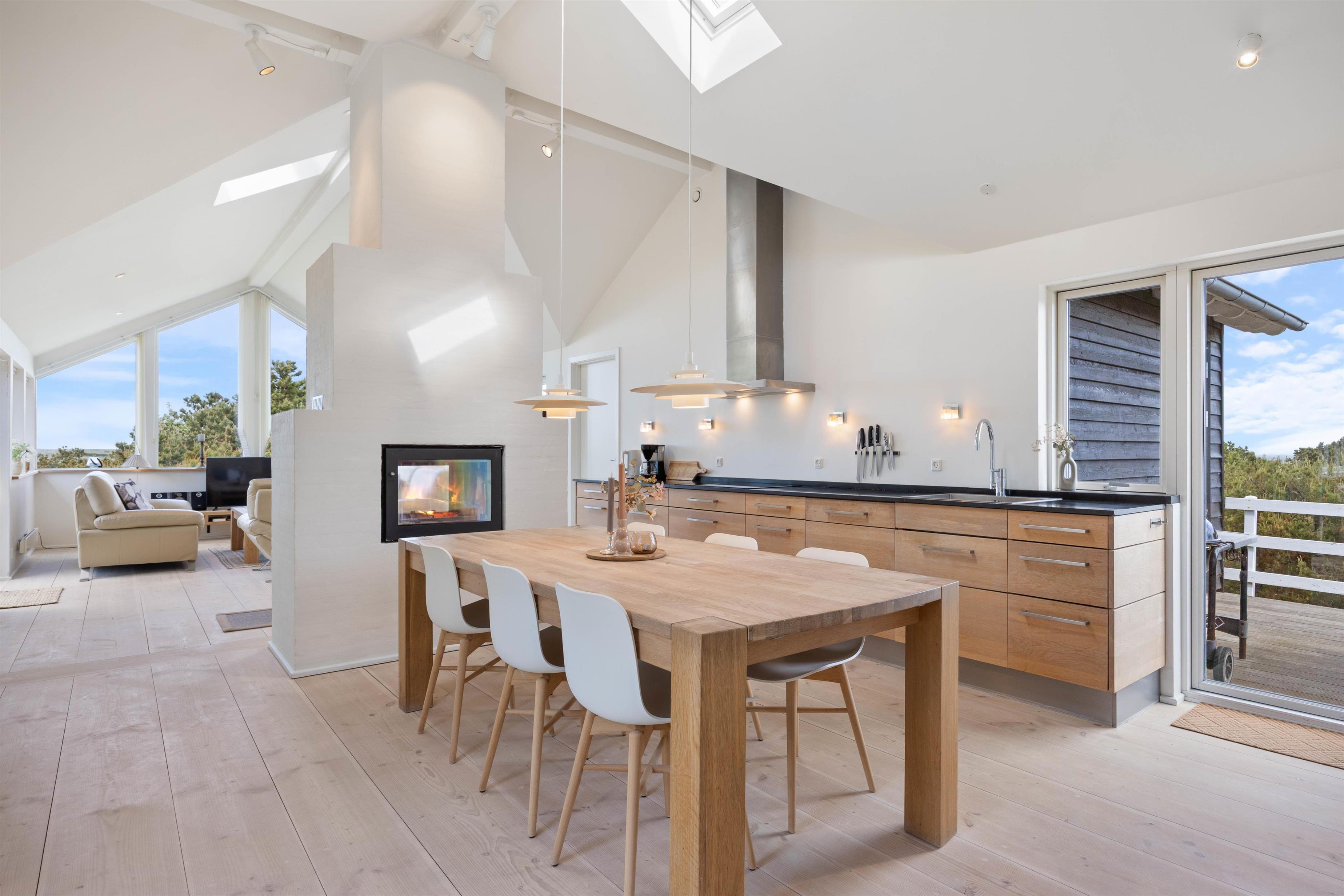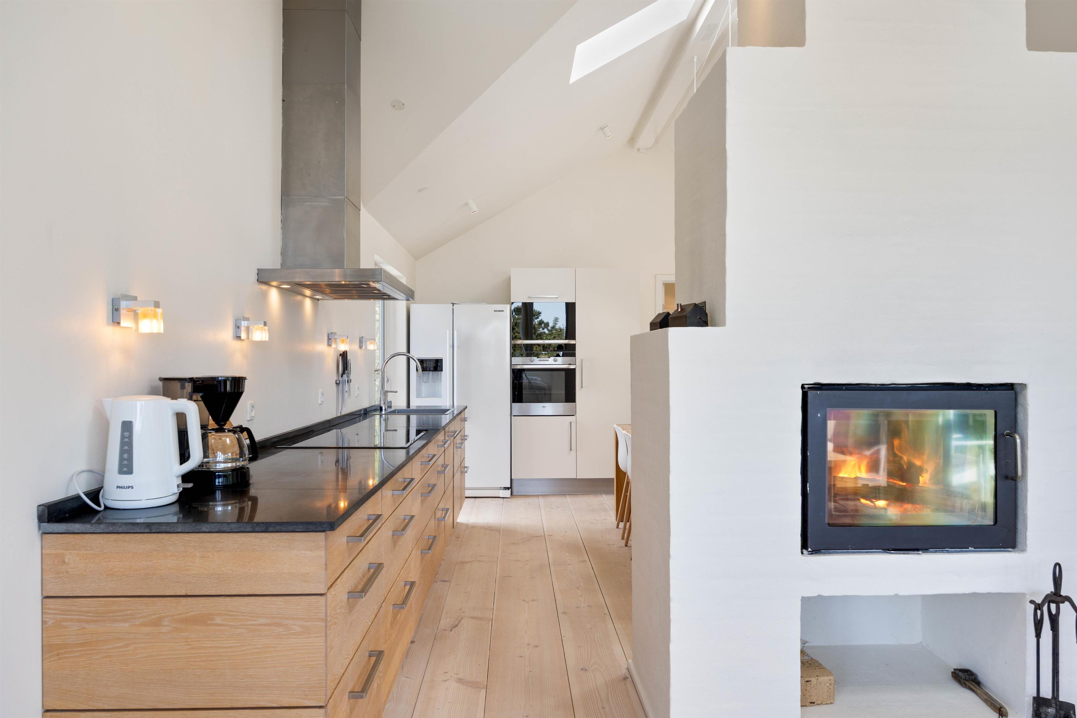 På øverste etage finder I et stort, lyst opholdsrum, der er forbundet med køkkenet, og er udstyret med opvaskemaskine. Det er her, familien mødes for at lege, lave mad eller bare nyde tiden sammen. Møbleringen er meget smagfuld og moderne, og tv’et har også tyske kanaler. Uanset om man sætter sig godt til rette i sofaerne eller sidder ved spisebordet og leger, kan man se og høre brændeovnens knitren på begge sider.