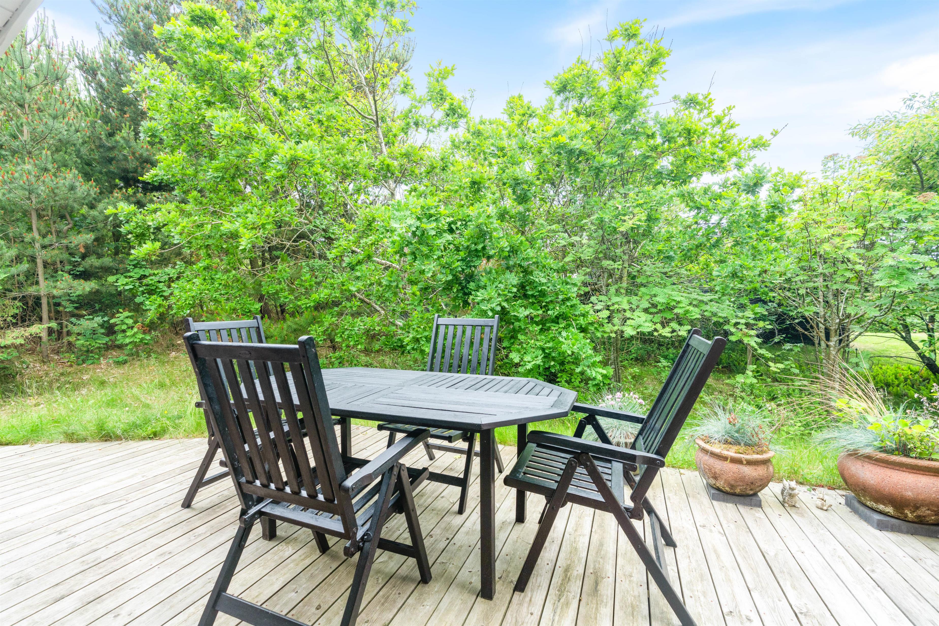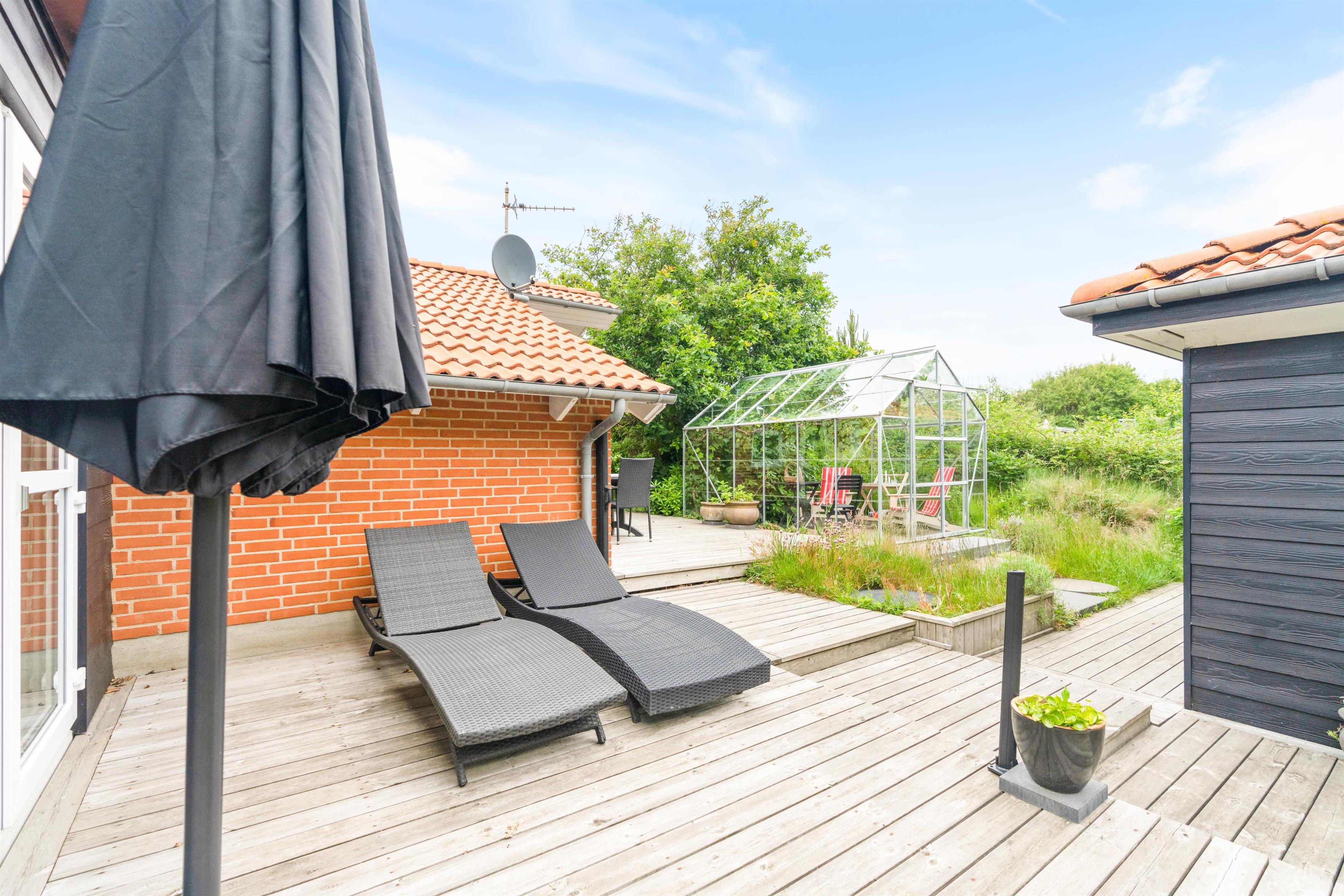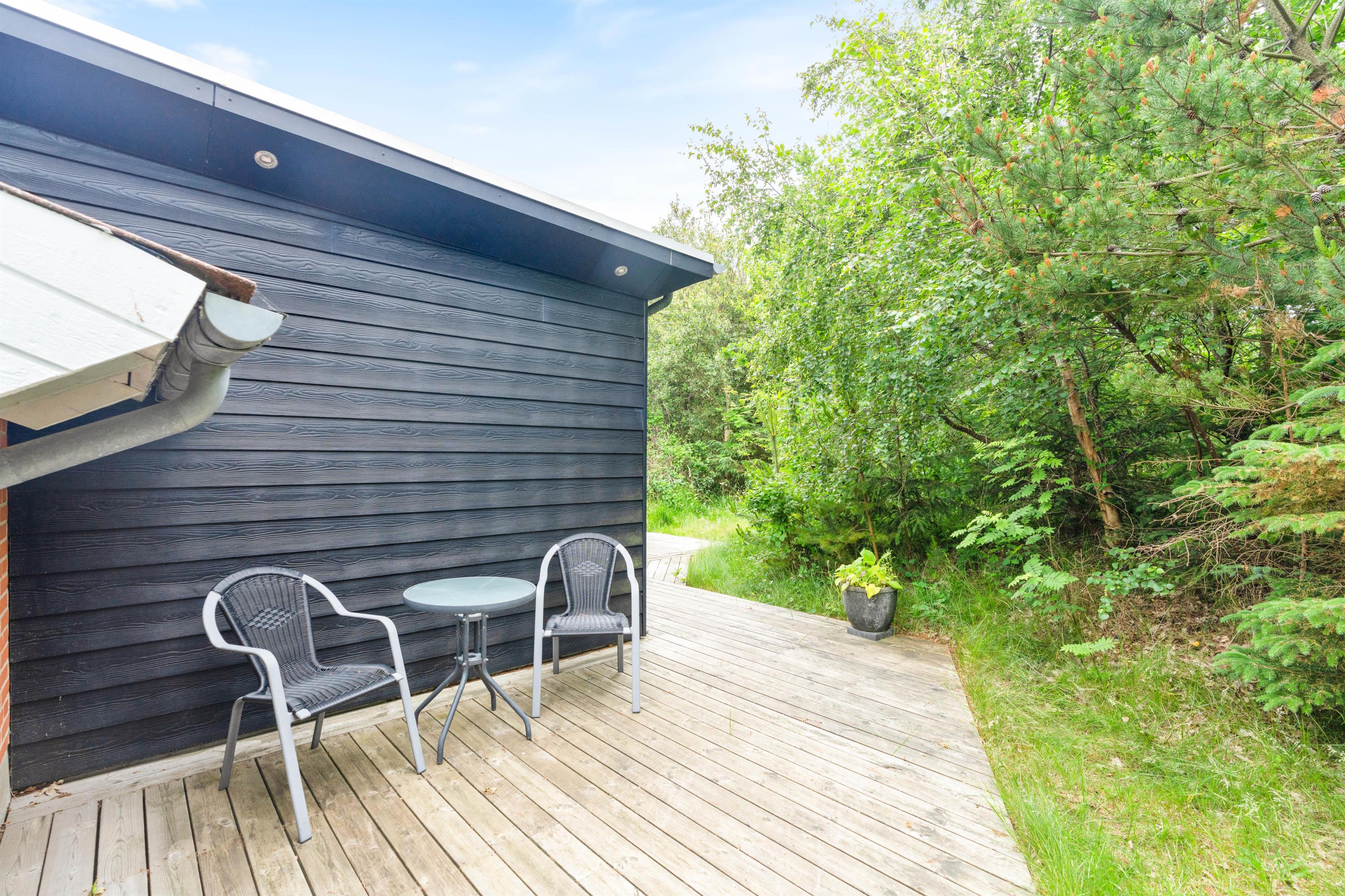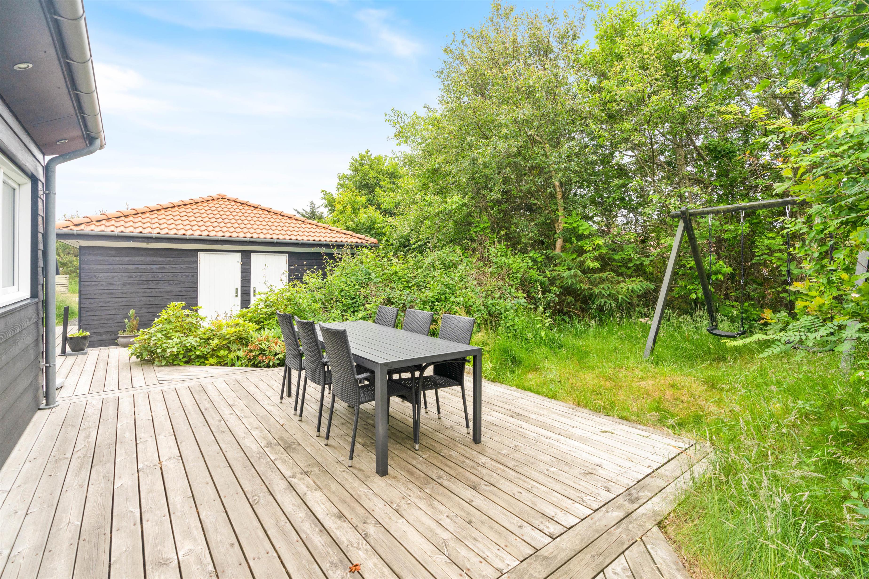 Ved sommerhuset finder I flere gode hjørner og kroge, hvor I kan hygge jer og nyde solen. Der er flere lækroge, hvor I kan sidde godt beskyttet mod vestenvinden – perfekt til en rolig morgenstund, mens resten af huset langsomt vågner, eller til aftensmad, mens grillen bliver varm.