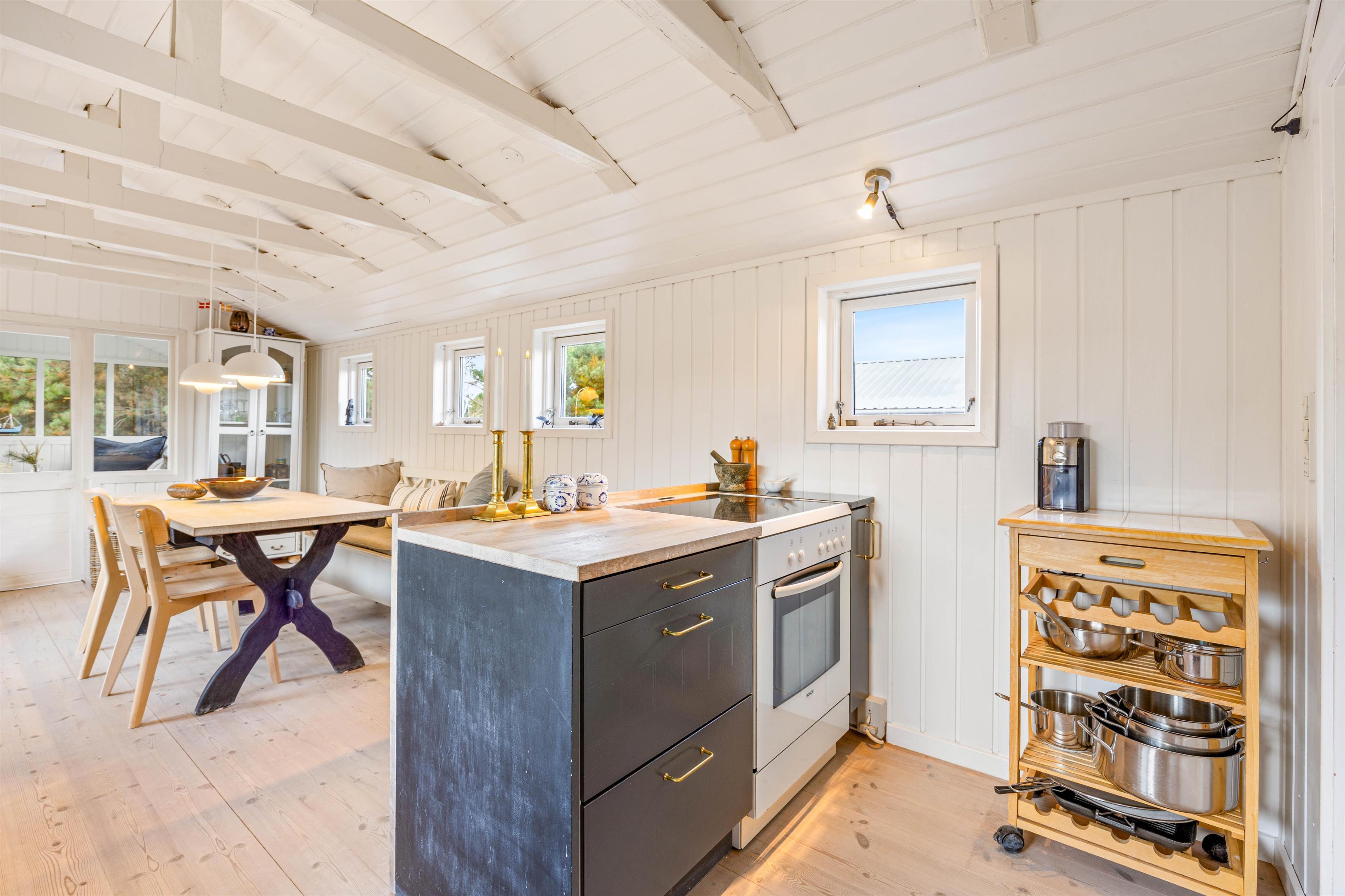 Det lille træhus på Bjerghuse 113 leder straks tankerne hen på den klassiske sommerhusferie. Sommerhuset har i 2020 gennemgået en delvis renovering, som har resulteret i et charmerende og velafstemt indre med fine detaljer og en indbydende atmosfære. Og praktiske detaljer som vaskemaskine og tørretumbler gør, at feriekufferten ikke behøver at være så tung.