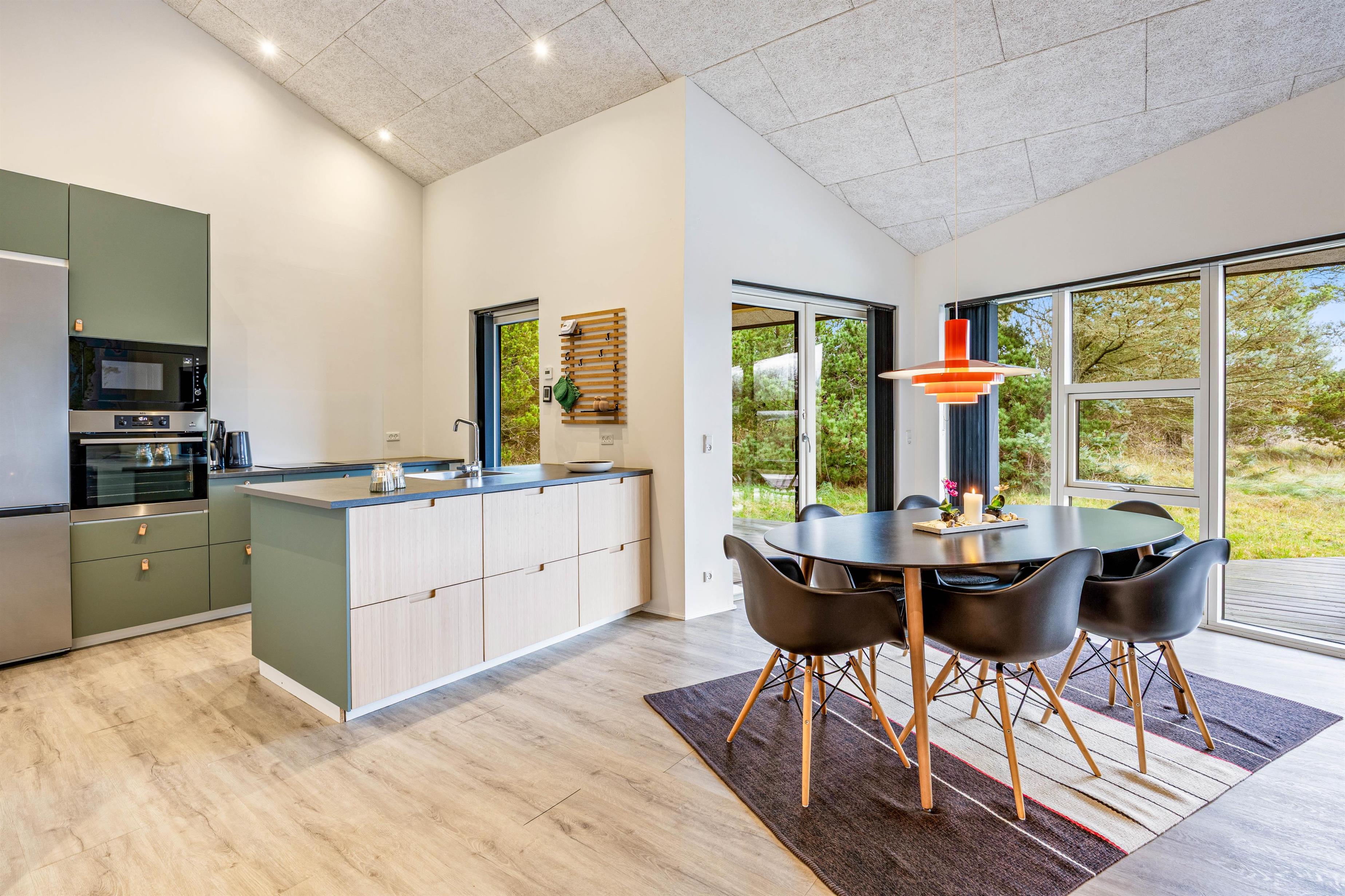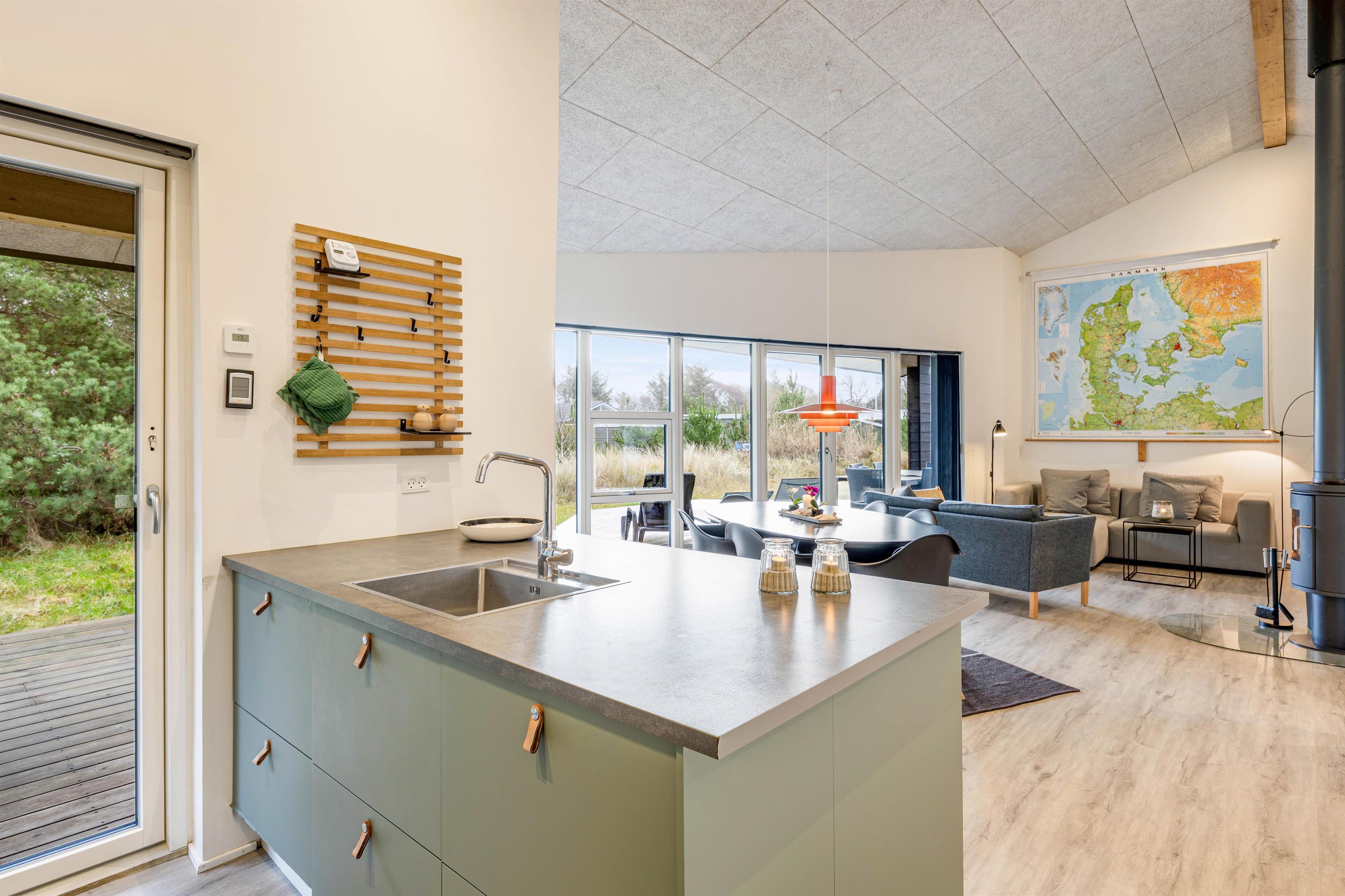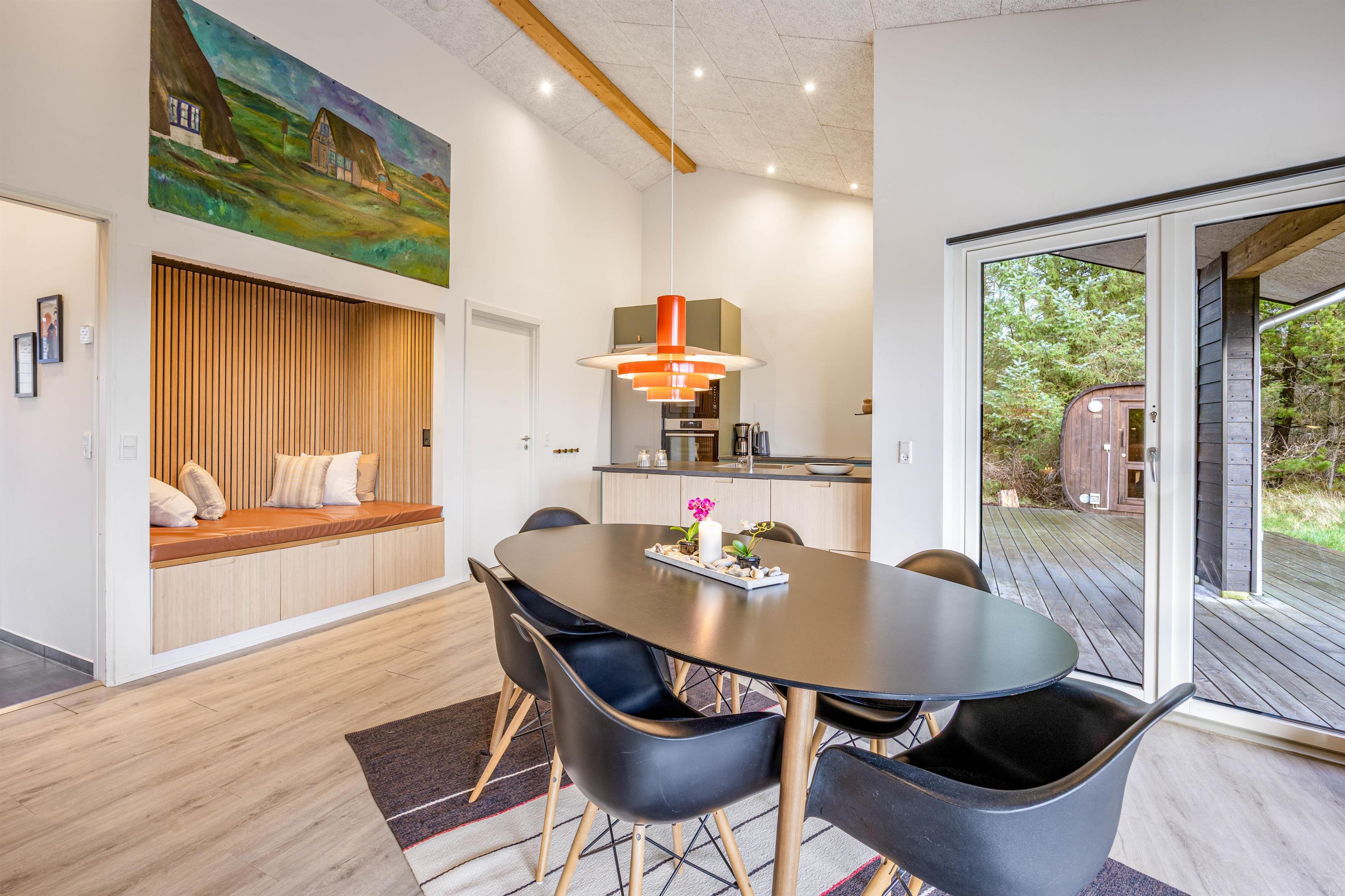 De lækre omgivelser byder jer straks velkommen. Her er der virkelig taget godt imod jer som gæster. Stue og køkken er i åben forbindelse, og der er indbygget en hyggekrog, som gør det muligt at samle hele familien i husets hjerte. Brændeovnen i stuen værner om hyggen, og foran den kan hele familien samles. Muligheden for en mere miljøvenlig opvarmning finder I også i husets luft-til-vand varmepumpe. Desuden kan I benytte det hurtige internet til at streame jeres yndlingsfilm.