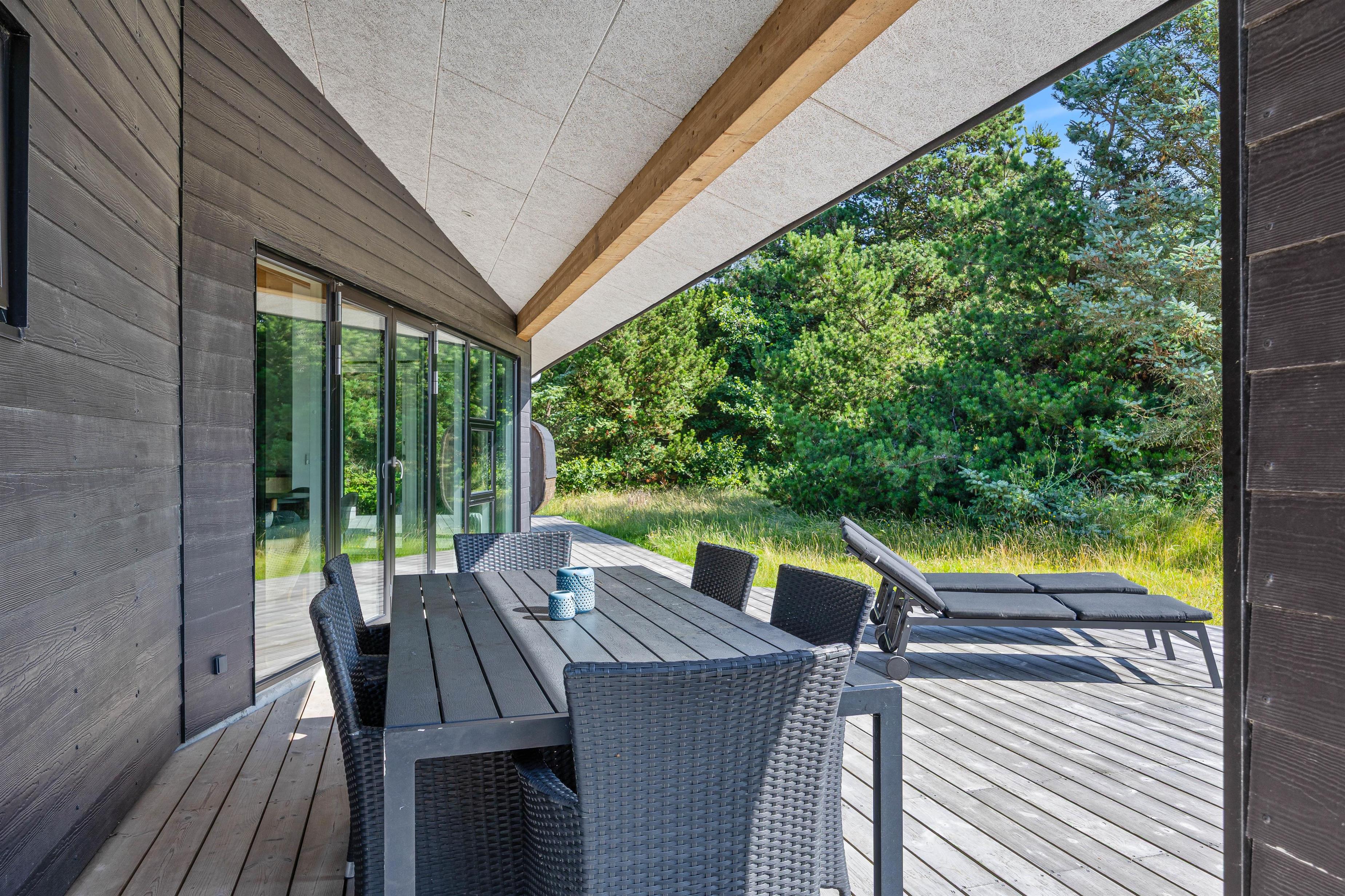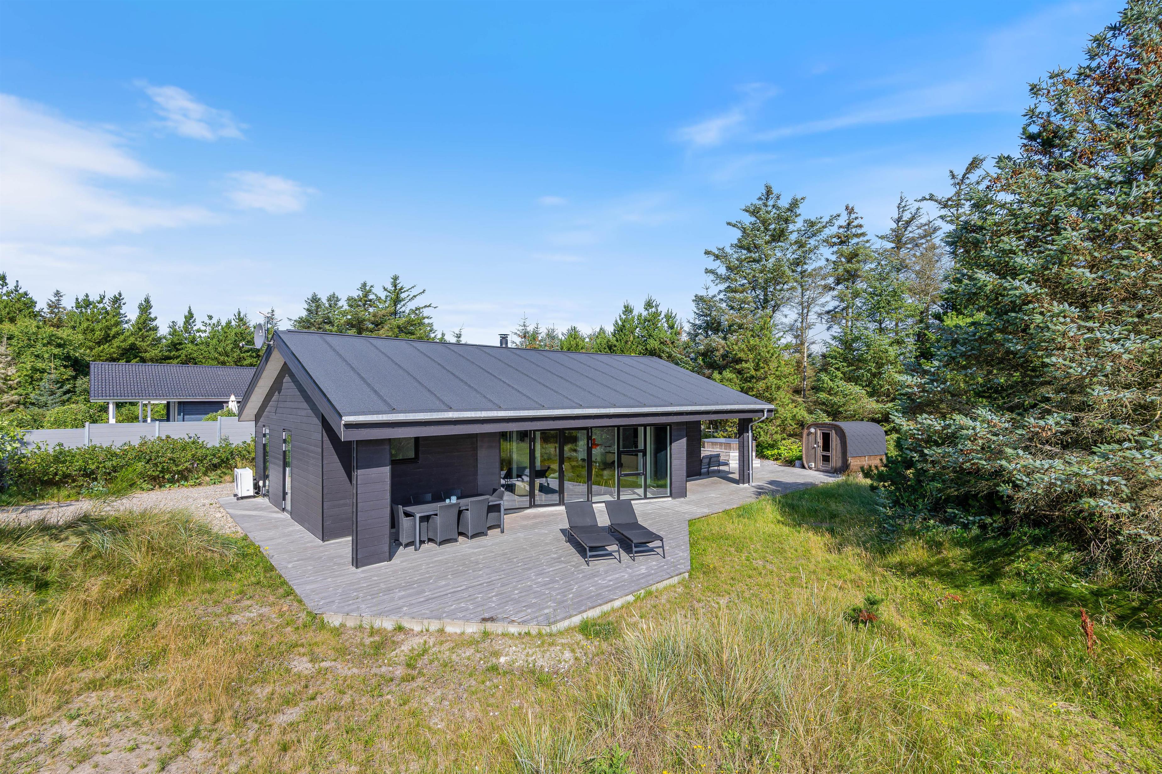 På Hagevej 15 i Fjand står dette lækre sommerhus og venter på jer. Sommerhuset, der blev opført i 2021, kan rumme 6 personer og 2 hunde, som er tilladt på adressen. Sommerhuset indbyder til forkælelse i form af et vildmarksbad og en udesauna, som begge er placeret i haven, der er afskærmet af store flotte træer, der bidrager til privatlivet.