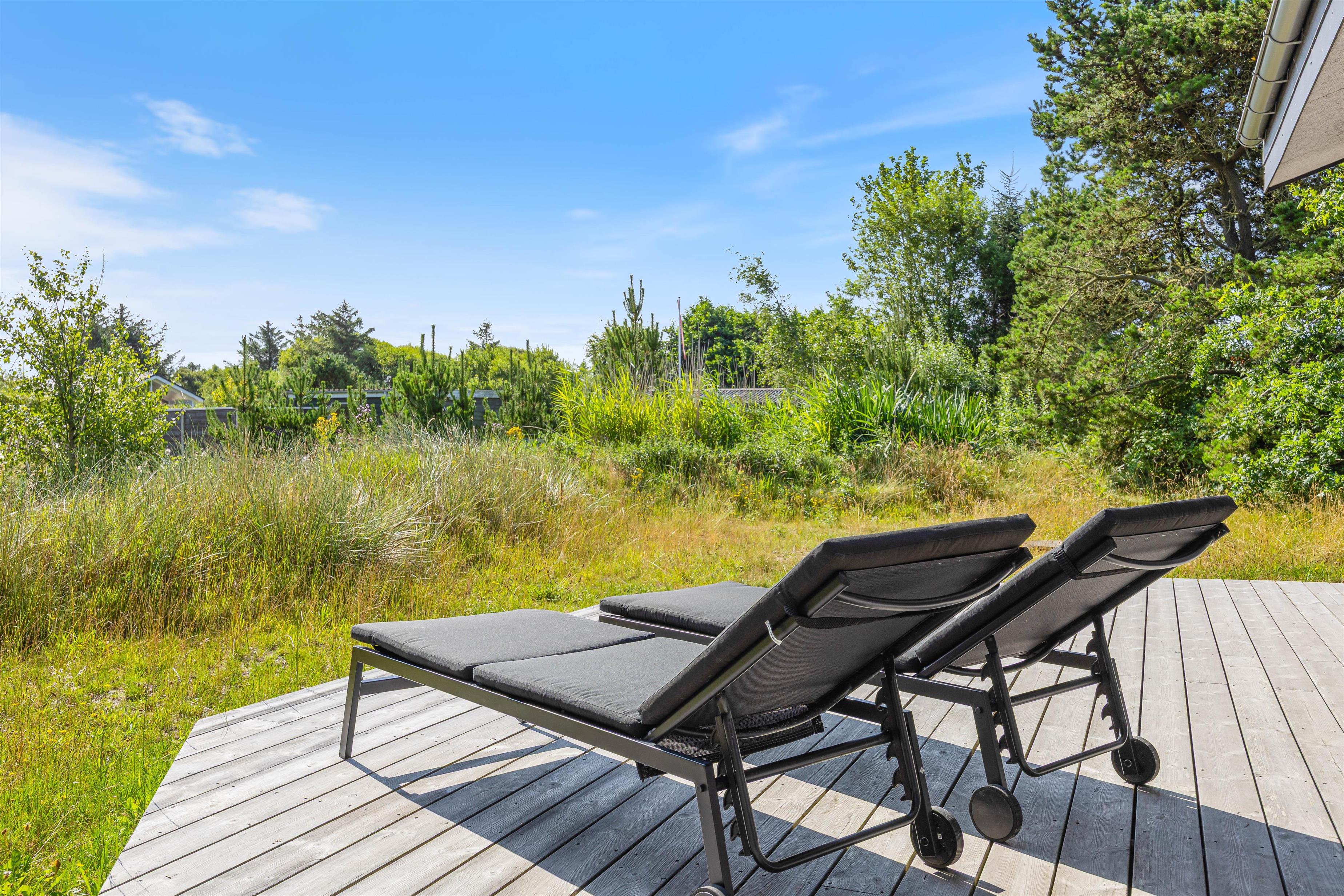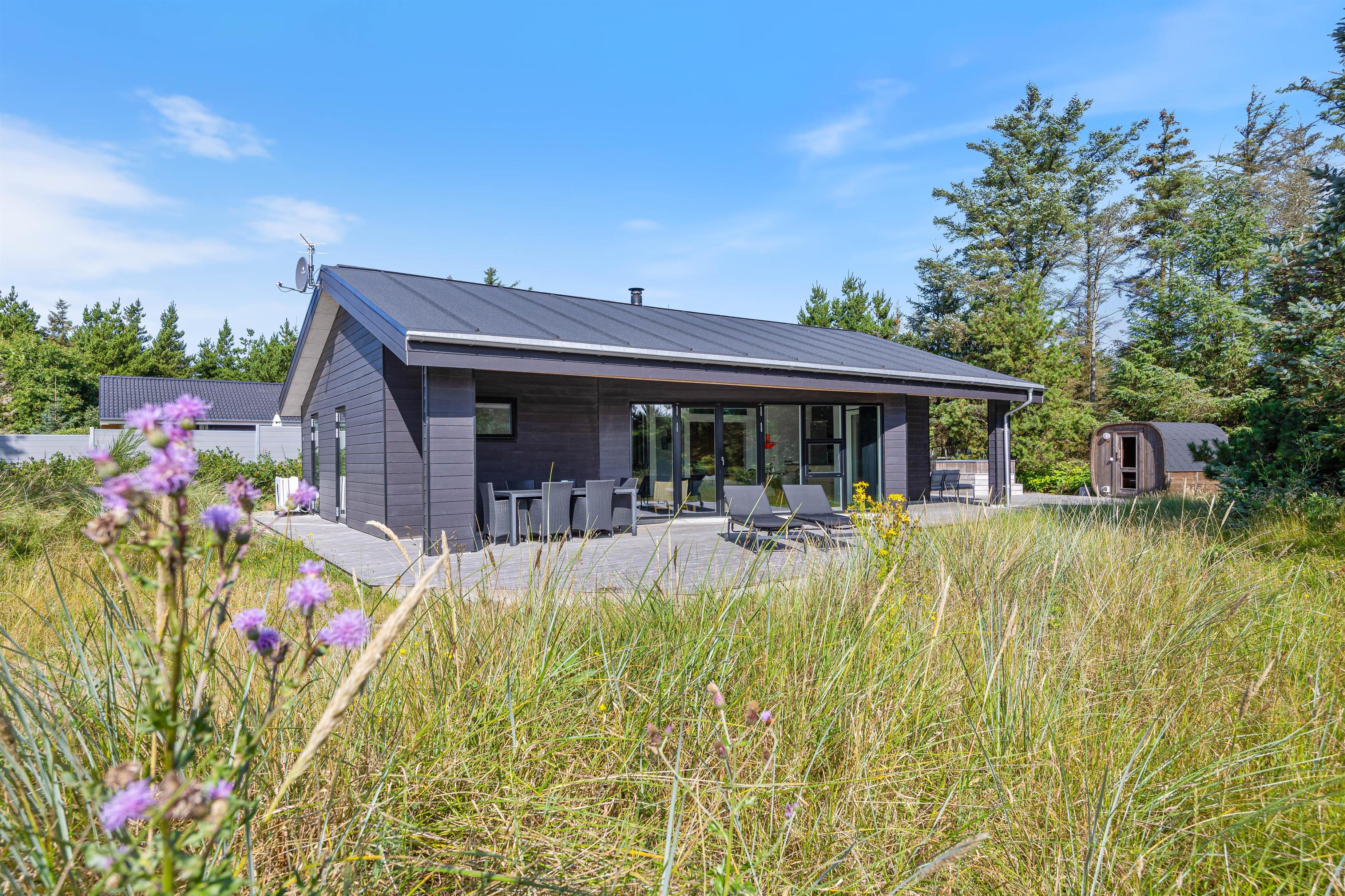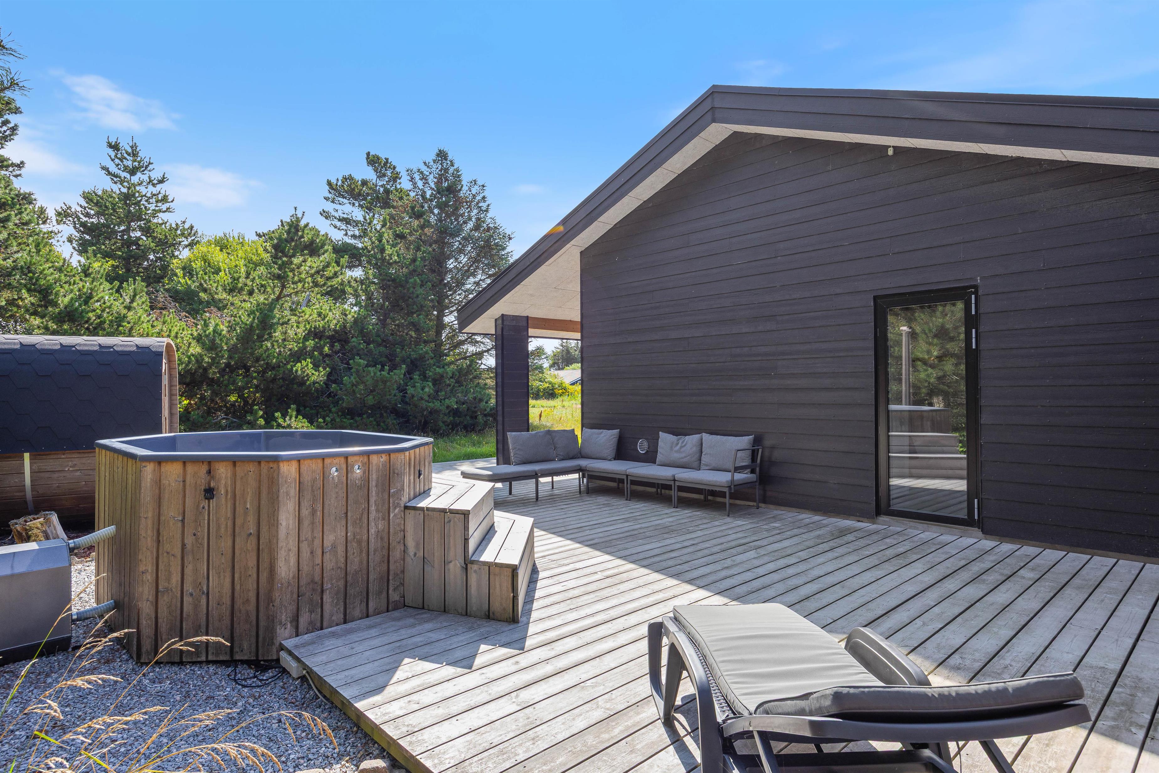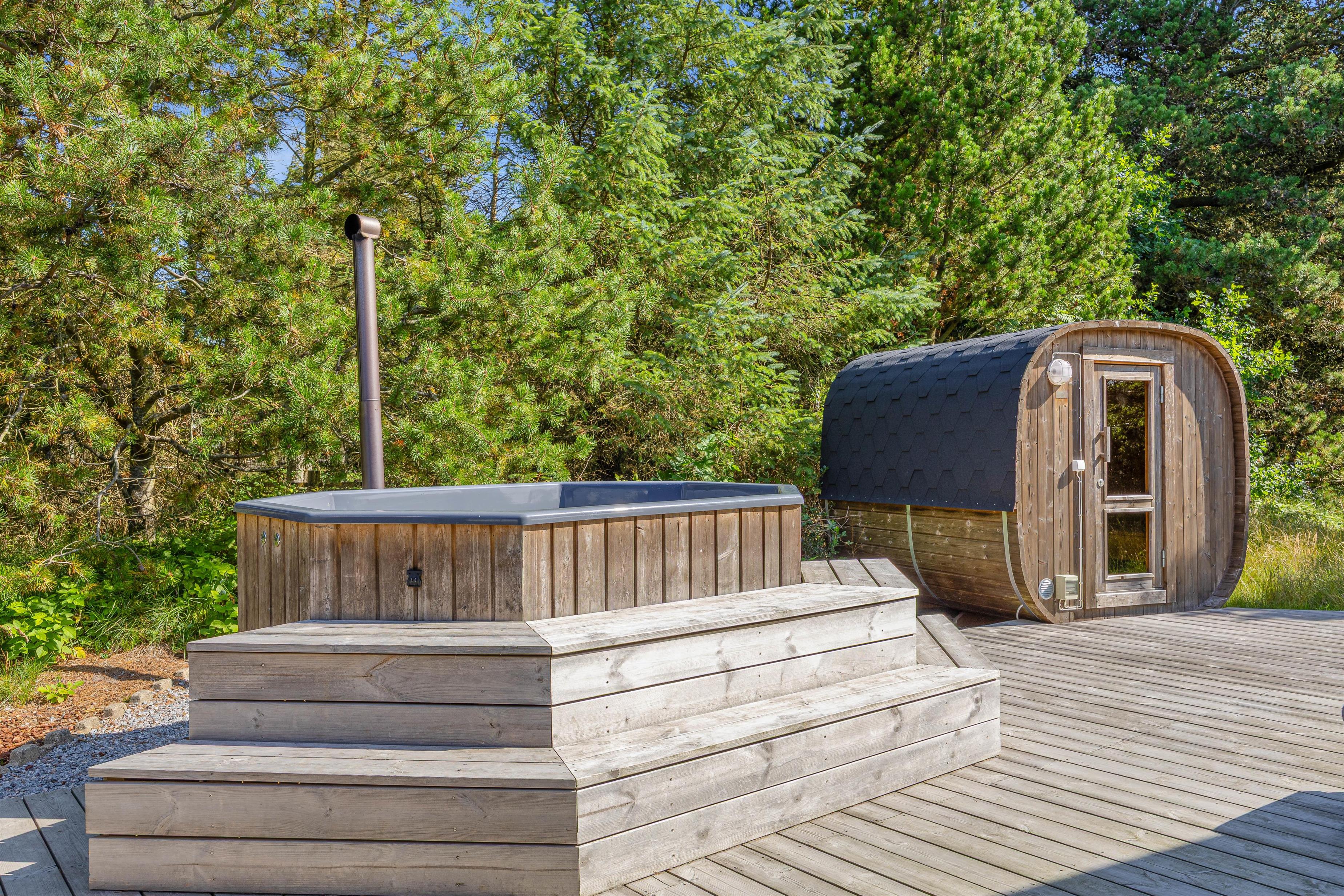 Til de lange, lyse sommeraftener står der en grill klar, og som noget helt særligt kan I forkæle jer selv med både vildmarksbad og udesauna, hvorfra I kan sidde i fred og ro og nyde udsigten til de smukke træer, der skærmer haven af.