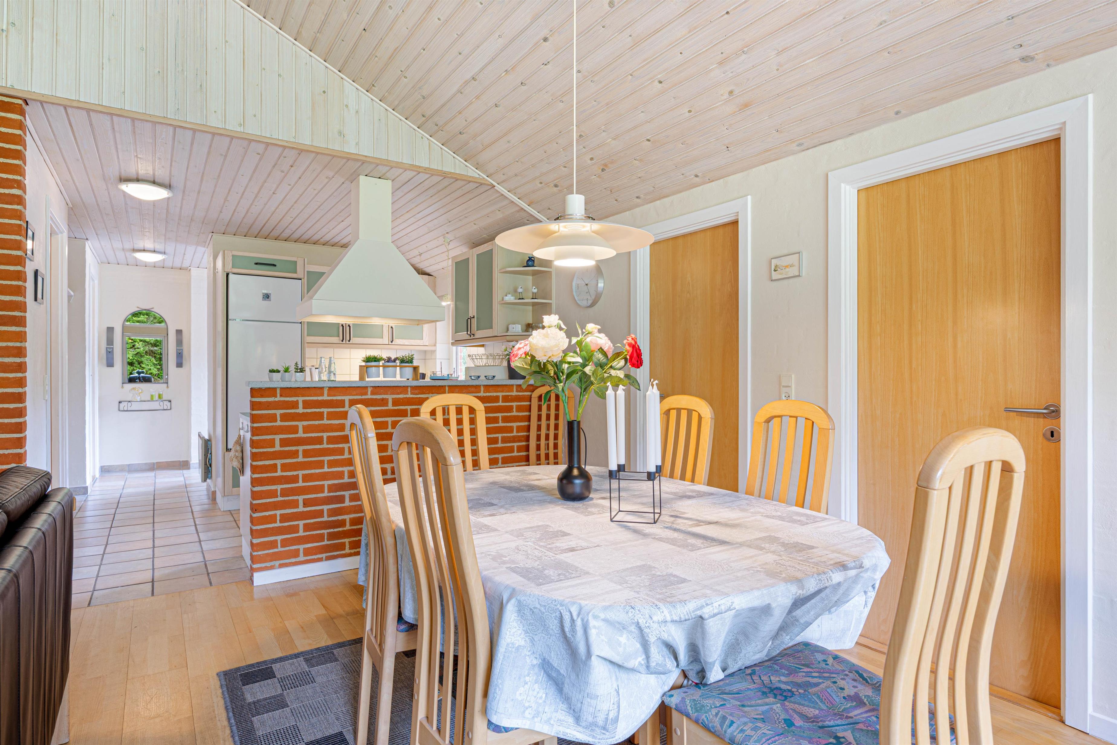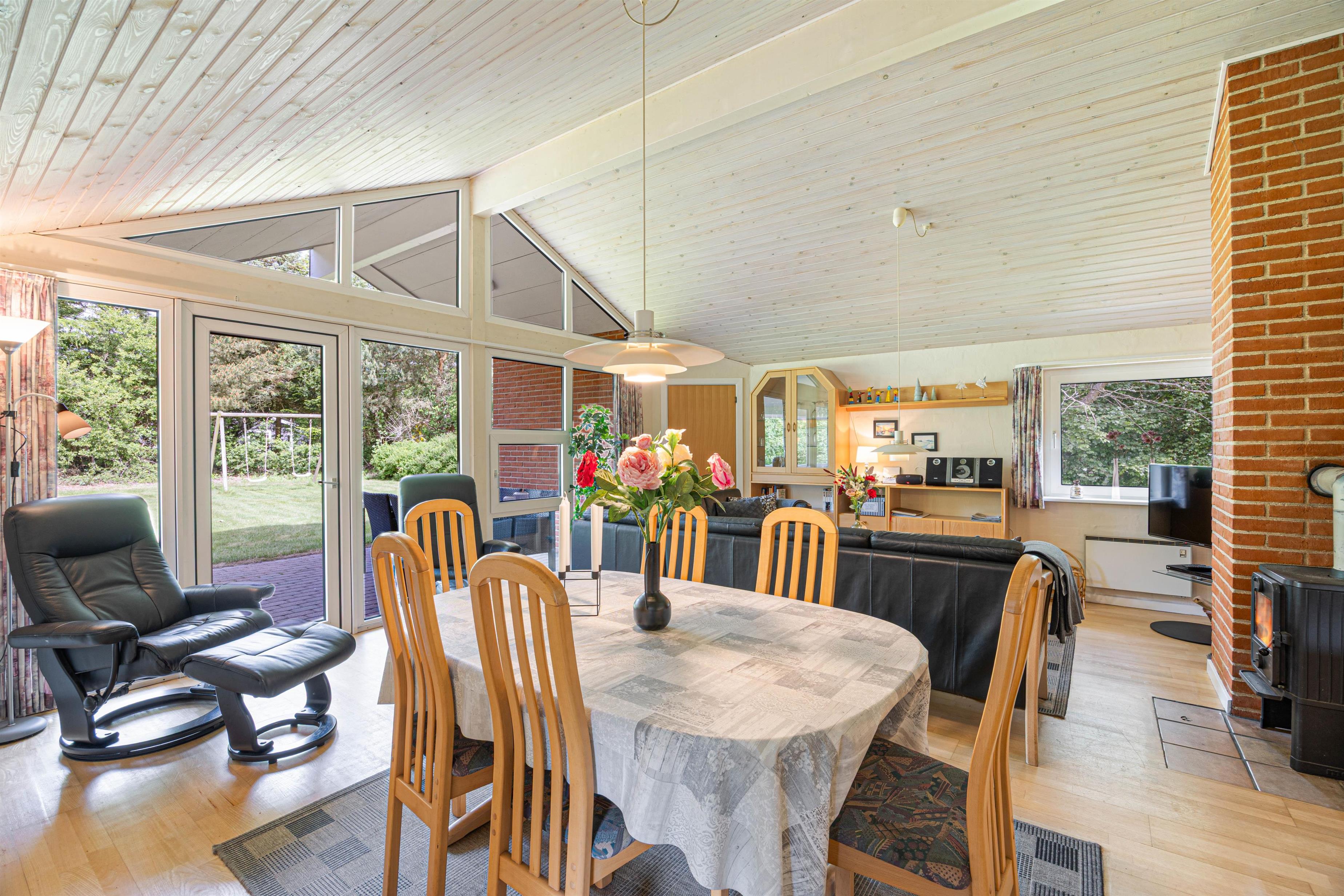 Det åbne køkken-alrum er uden tvivl sommerhusets midtpunkt, og her er der lagt op til mange gode stunder. Det veludstyrede køkken er udstyret med opvaskemaskine, et stort køleskab og alt, hvad man skal bruge til madlavningen. I opholdsstuen kan I hygge jer i den behagelige sofa eller nyde jeres måltider sammen ved spisebordet. Her venter en brændeovn, der kan skabe en hyggelig atmosfære på kølige aftener. Alternativt kan I tænde for den energibesparende luft-til-luft-varmepumpe, som også kan sørge for et behageligt indeklima i opholdsrummet.