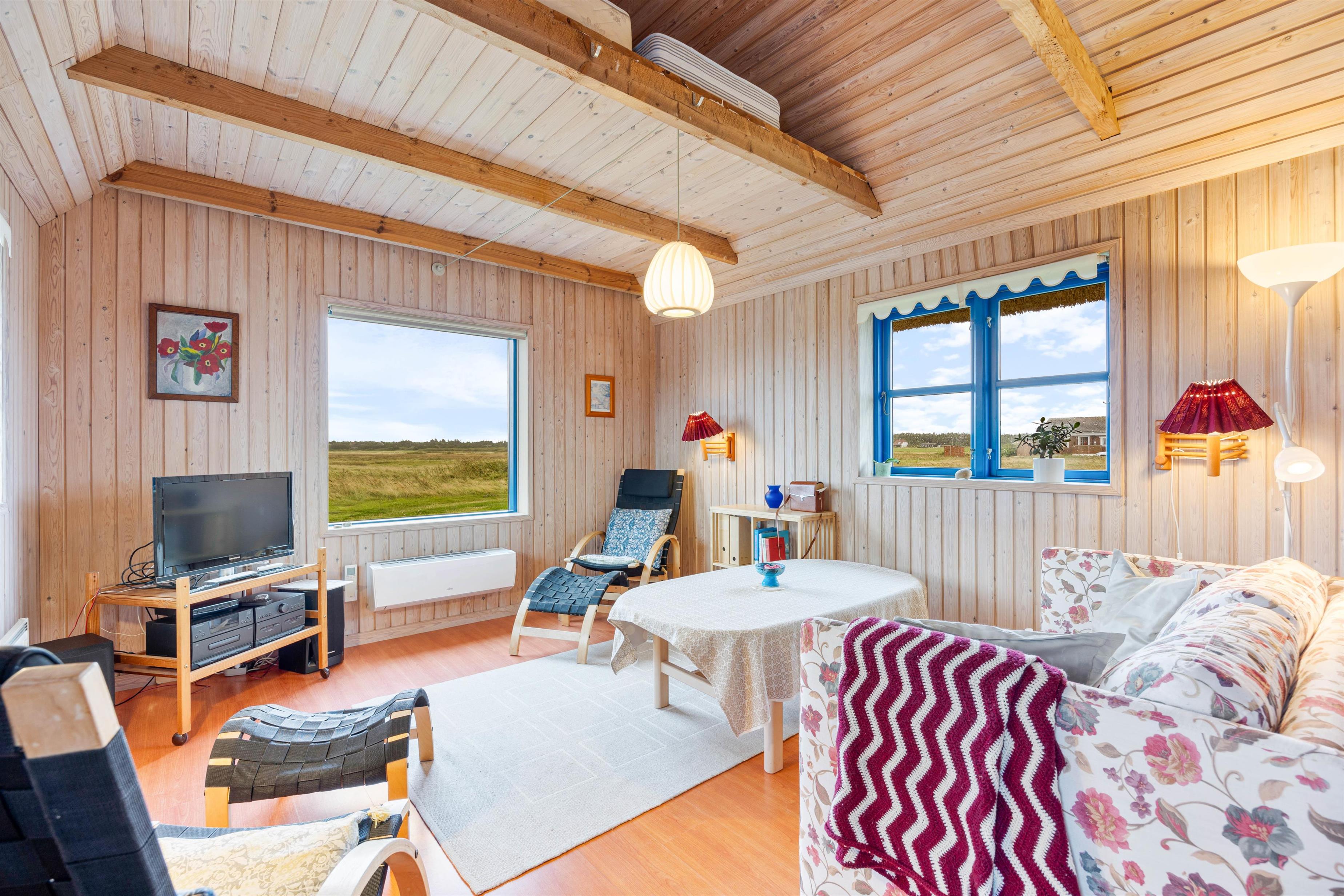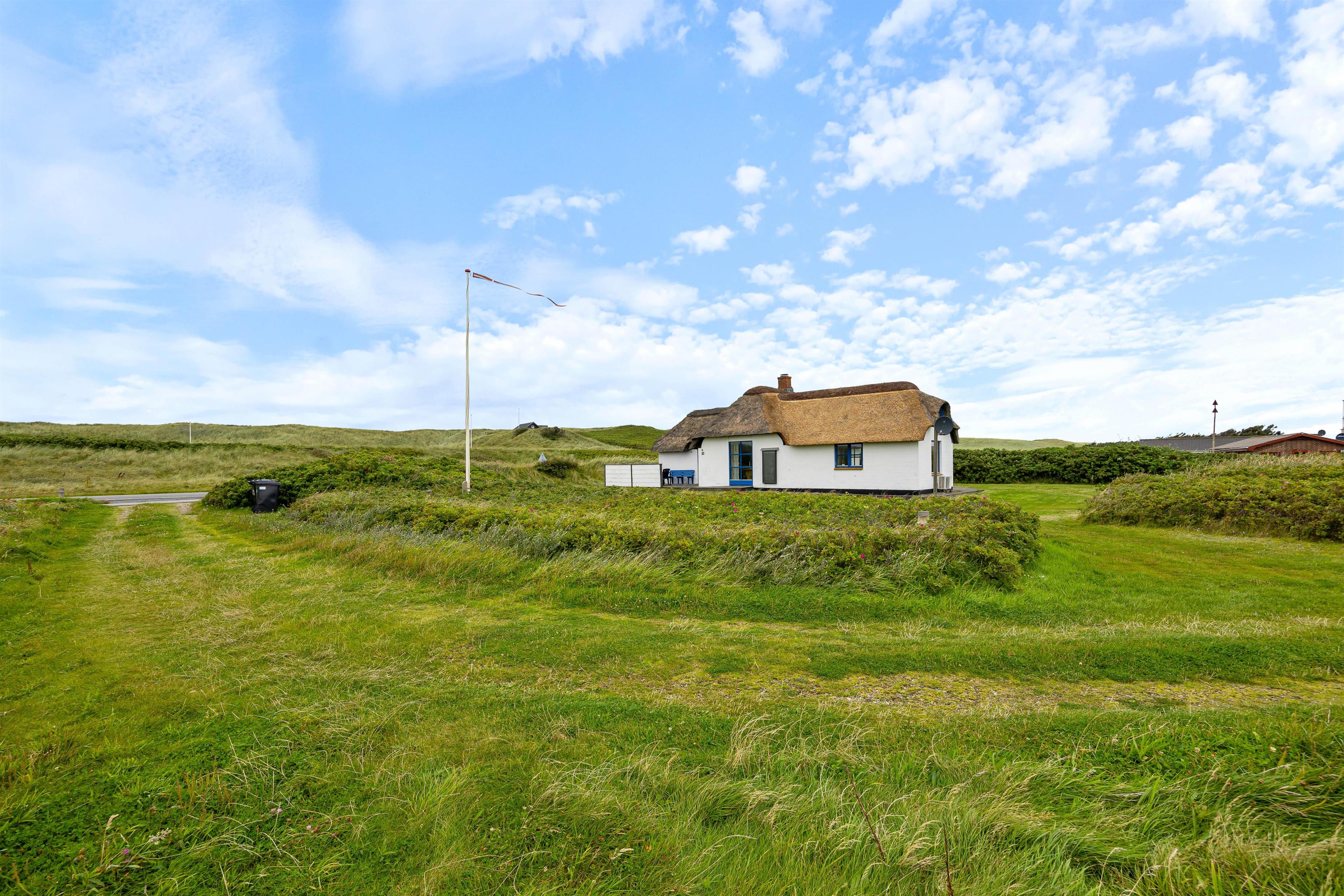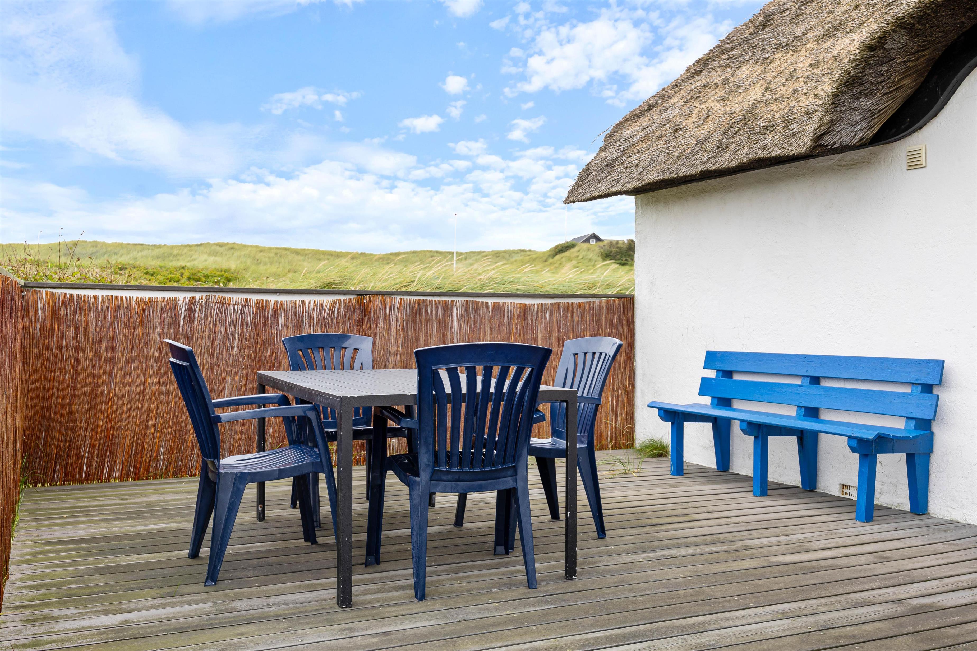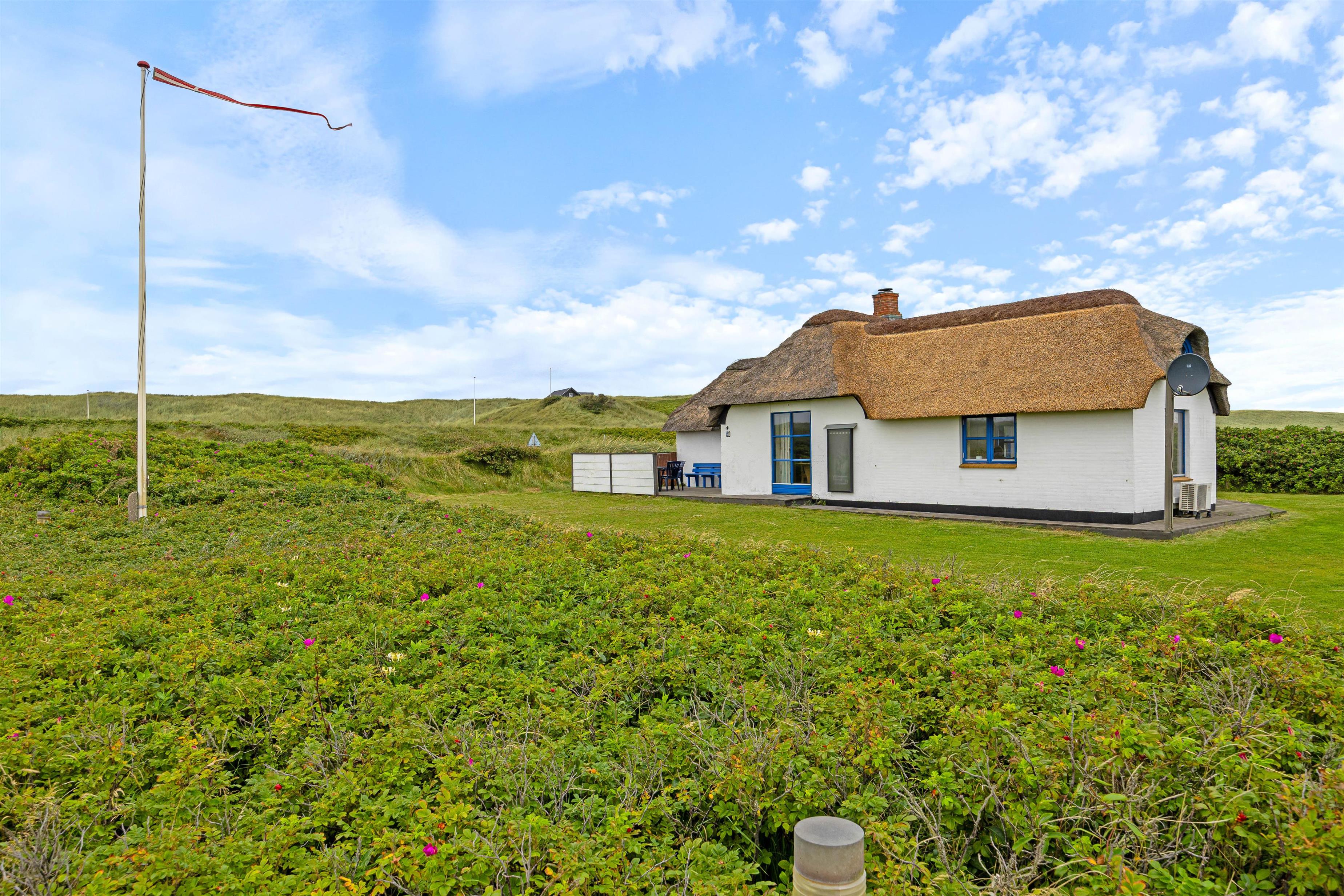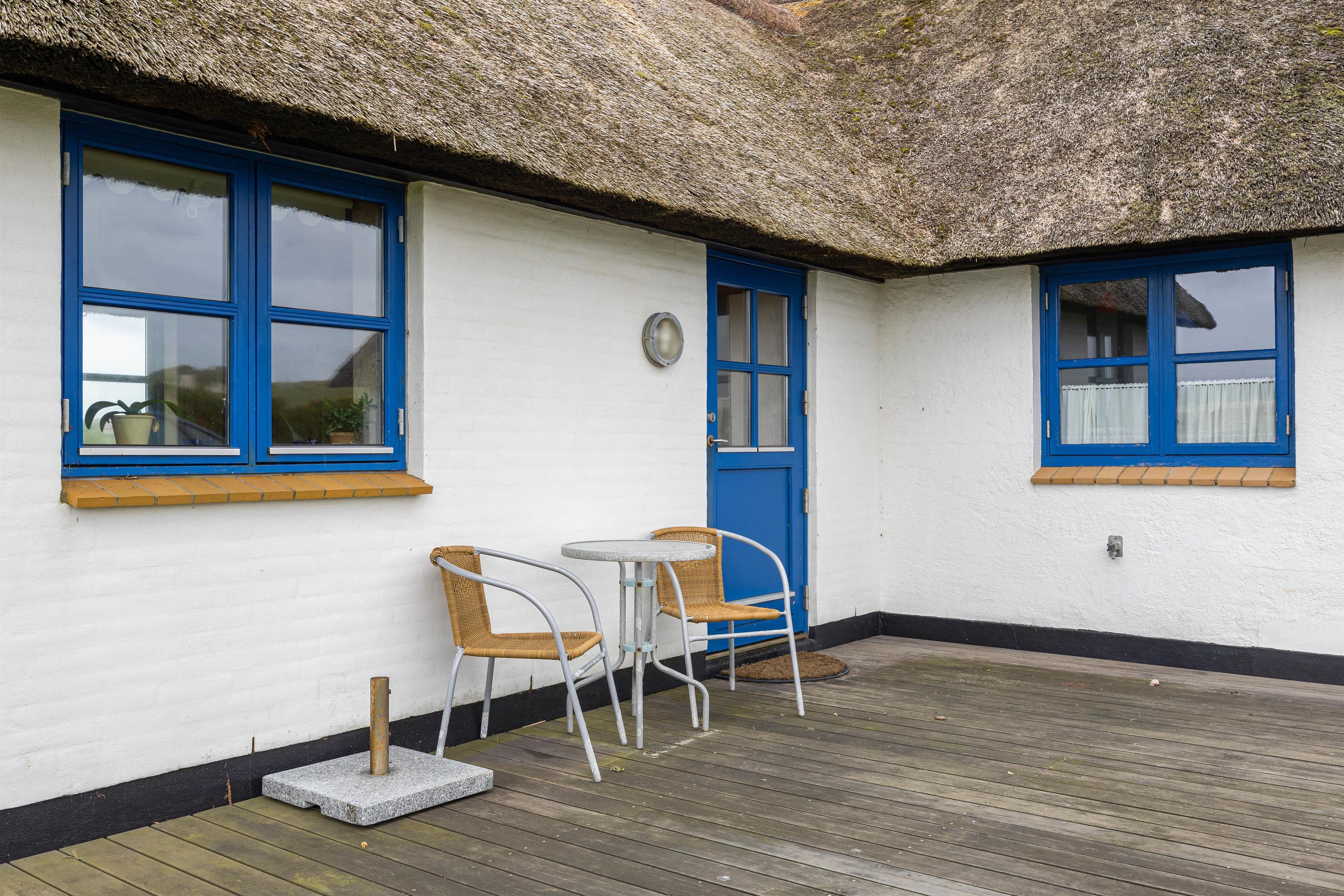 Det stråtækte feriehus med den hvide facade og de blåmalede vinduer og døre byder jer velkommen, så snart I ankommer. Feriehusets indre byder på en hyggelig atmosfære. I køkkenet er der en opvaskemaskine, så opvasken kan klares, mens I lader batterierne op efter en lang gåtur ved Vesterhavet. Når I kommer tilbage efter en lang gåtur, kan I tænde op i brændeovnen og lytte til ildens knitren.