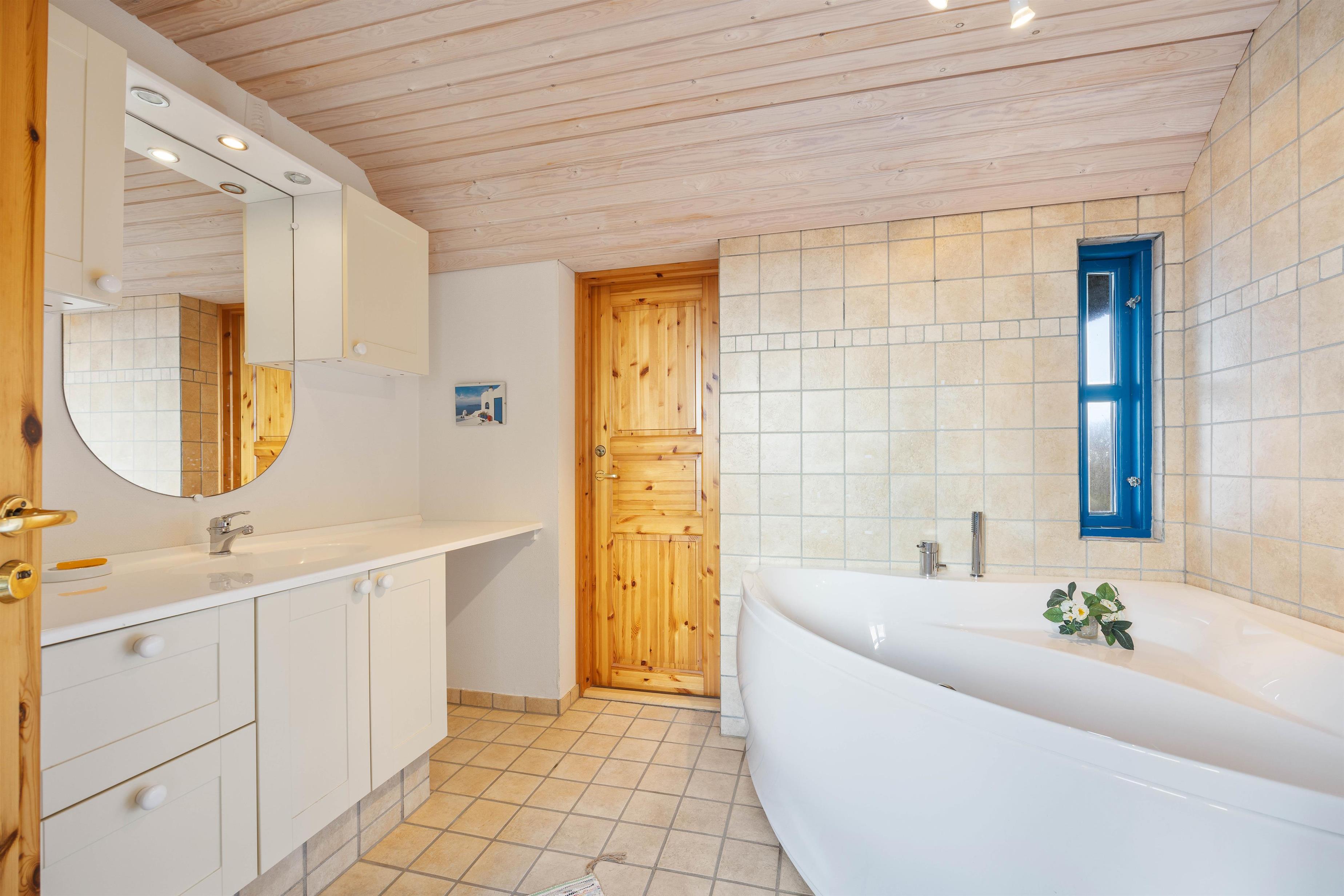 Der er også et tv med et Chromecast, så I kan fortsætte med at se jeres yndlingsprogram. I behøver ikke stresse på badeværelset om morgenen, for der er to badeværelser i feriehuset, og en energibesparende luft-til-luft-varmepumpe sørger for behagelig varme i feriehuset. På det ene af badeværelserne finder i et badekar, som i helt sikkert vil elske.
