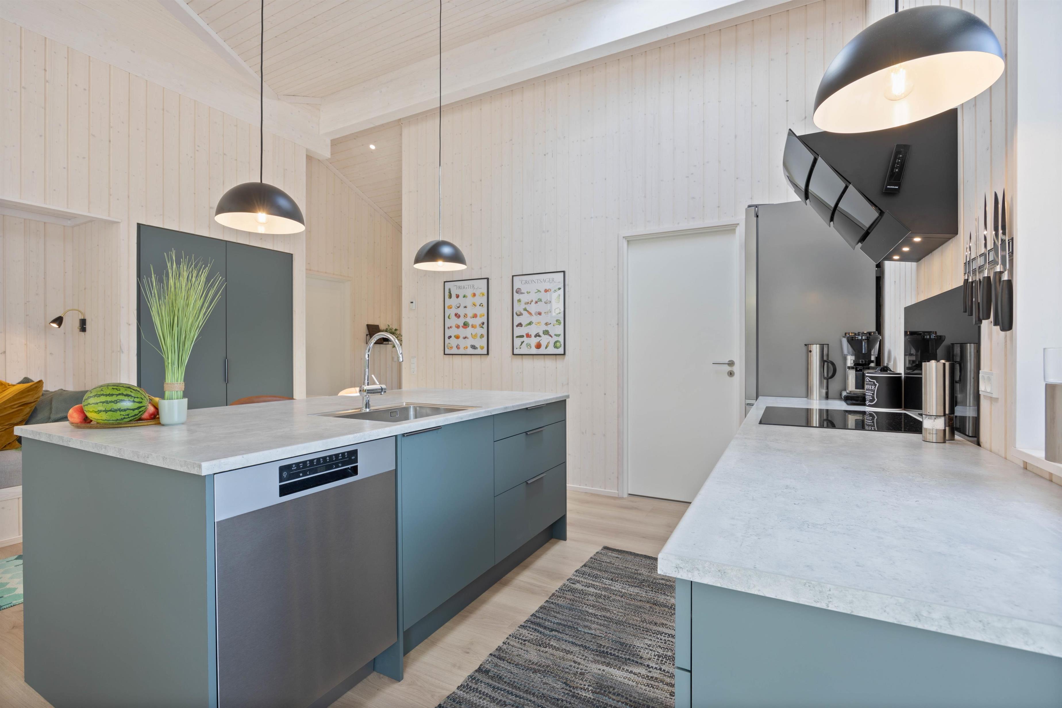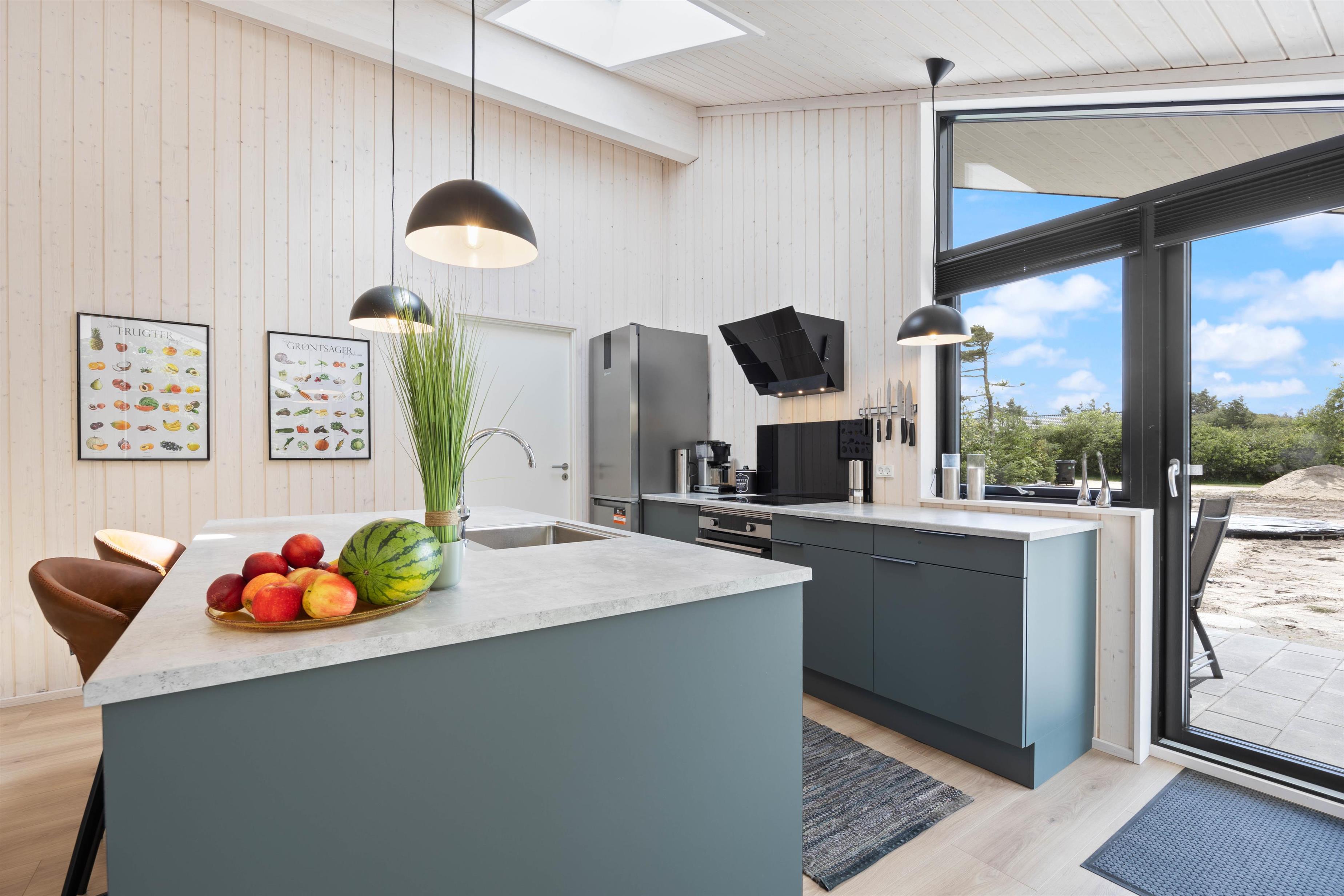 Hagevej 75 byder jer velkommen til en stor, dejlig opholdsstue som er i direkte åben forbindelse med både stue og køkken. Interiøret er stilrent og indretningen er lys og venlig. Køkkenet er fuldt udstyret med alt det nødvendige køkkenudstyr, tilmed vinkøleskab. Opvaskemaskinen klarer hurtigt opvasken på ferien, og der er god plads til at samles samt nyde et glas vin, imens børnene slapper af og lader op i alkoven med en iPad, så længe maden simrer.