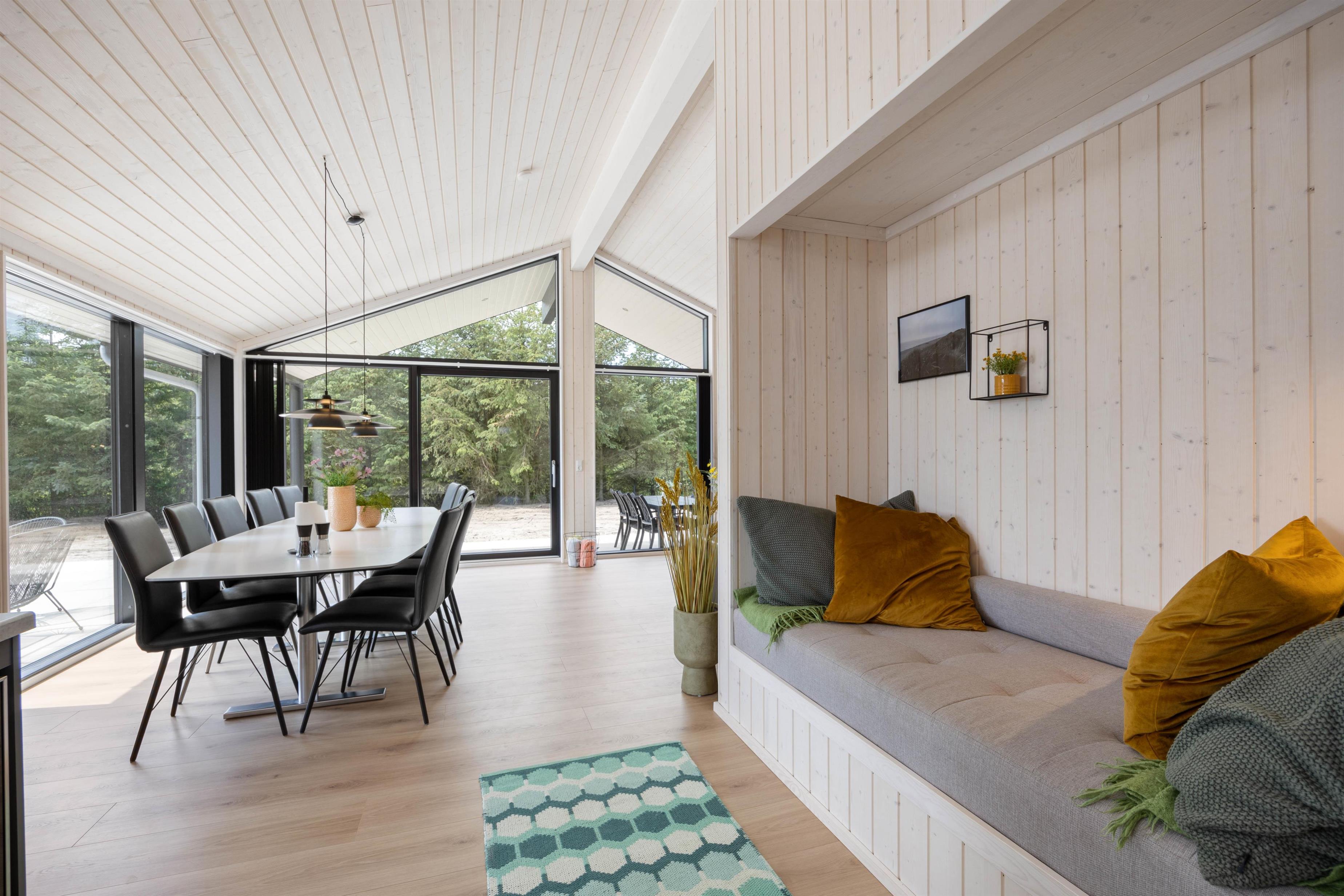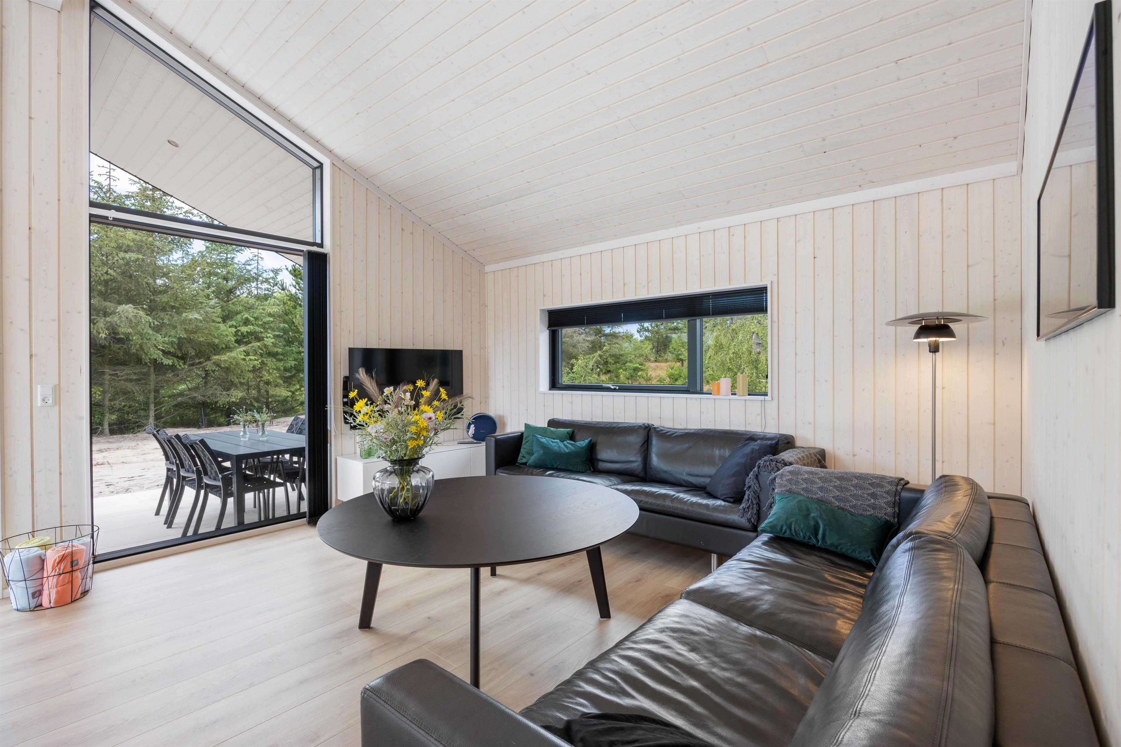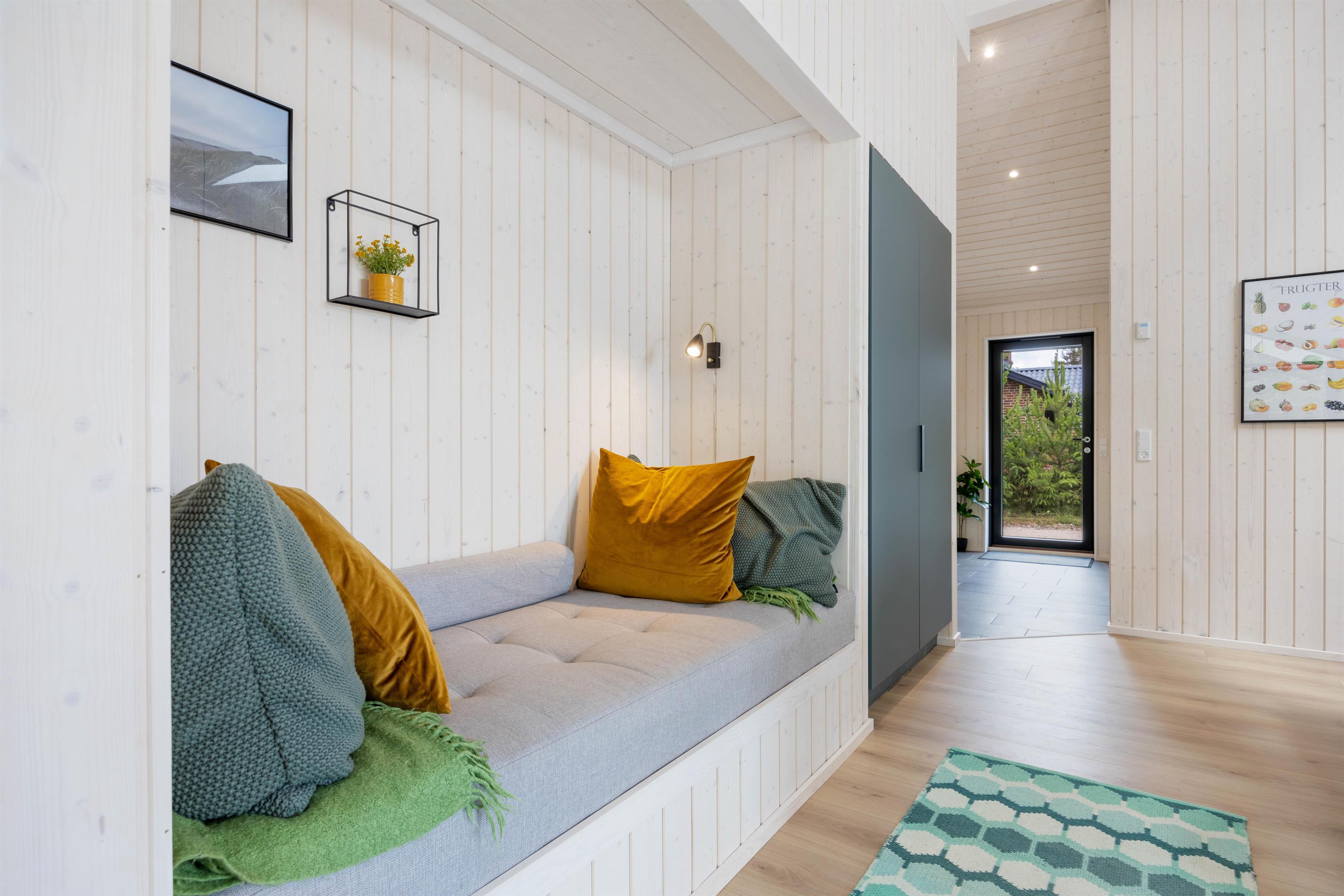 Om aftenen kan I synke ned i sofaen og kigge ud på stjernehimlen gennem de flotte, store vinduespartier, som bidrager til et fantastisk lysindfald i sommerhuset. Skulle I få brug for at vaske tøj under jeres ophold, så er der vaskemaskine til fri afbenyttelse.