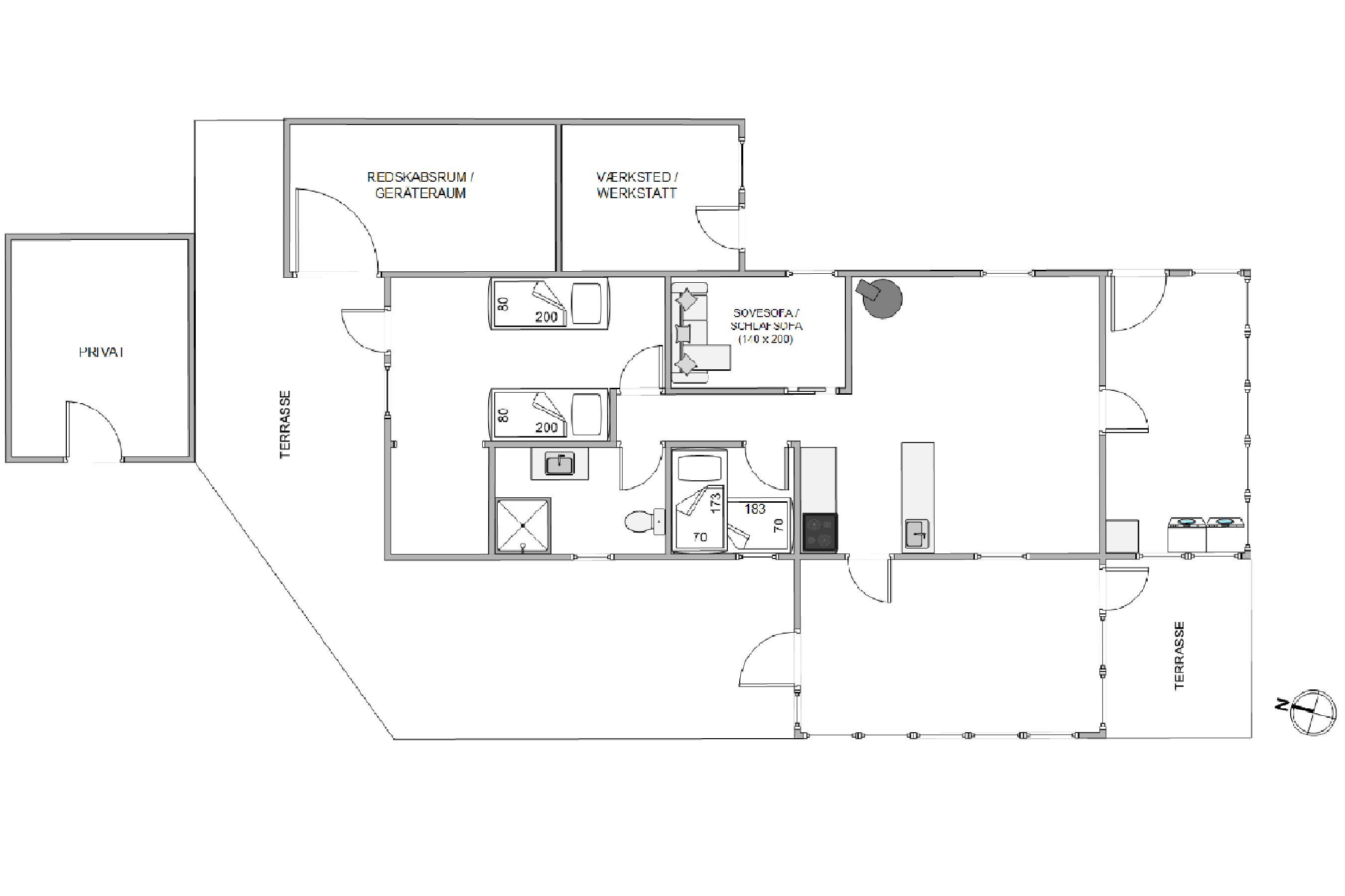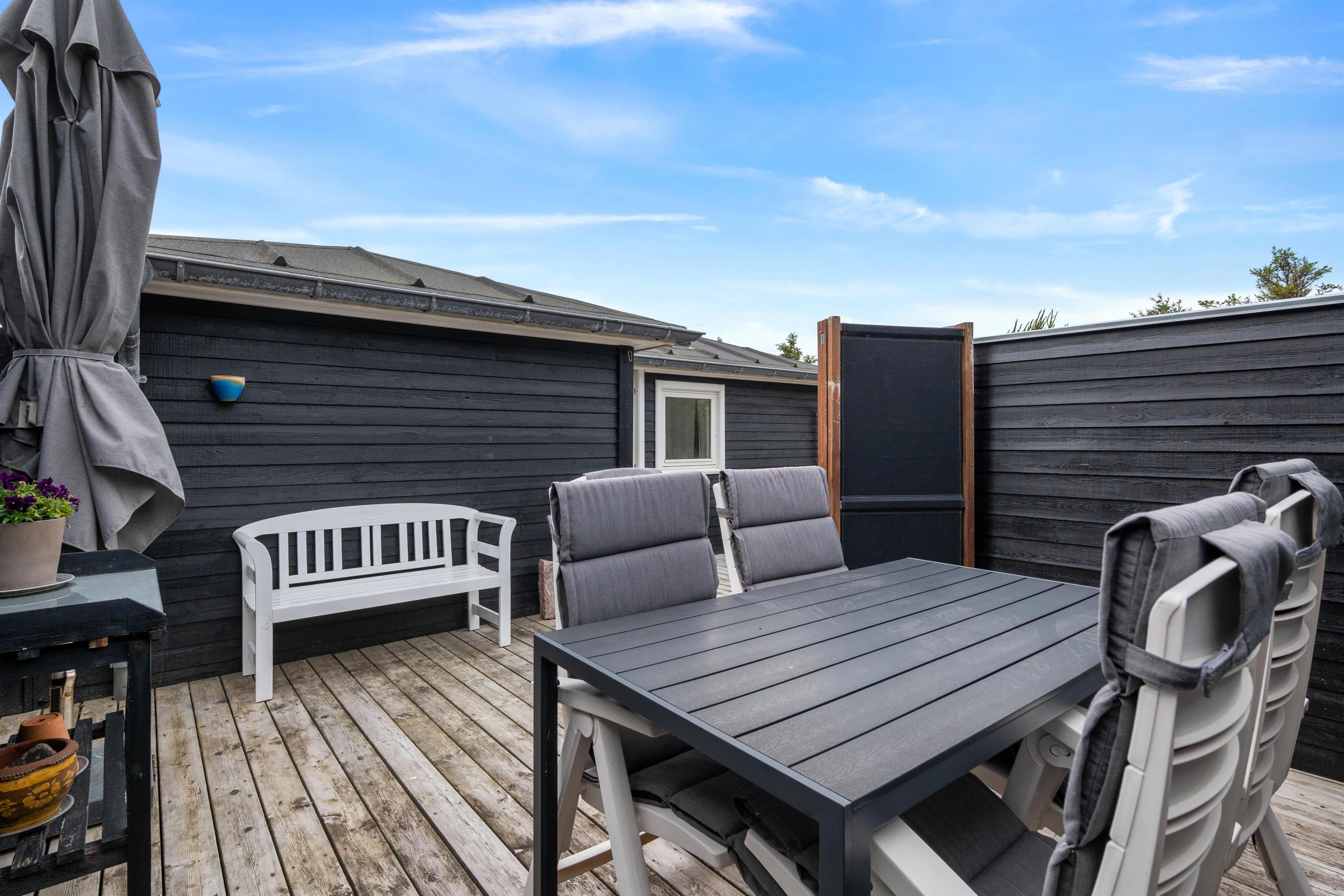 Udendørs venter jer en skøn terrasse, som er det oplagte sted at søge hen på de solrige feriedage. Her kan I finde jer en god plads i solen, hvor I kan læne jer tilbage i havemøblerne og liggestolene og bare slappe af.