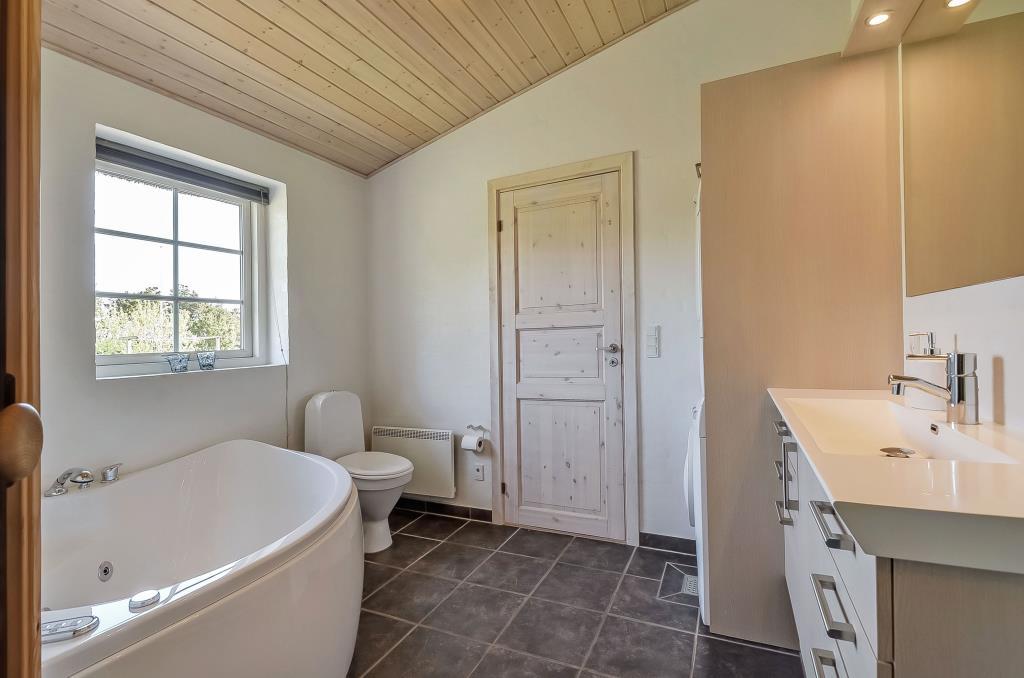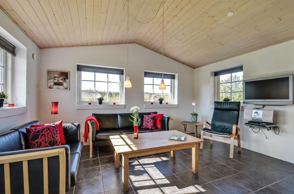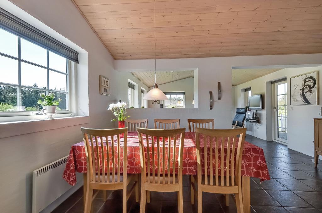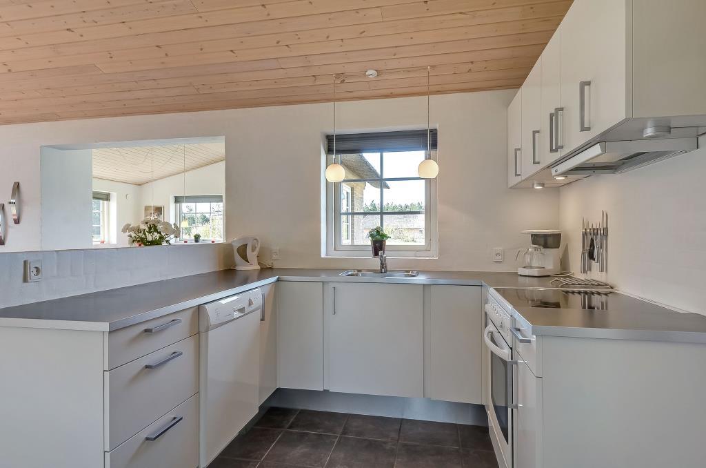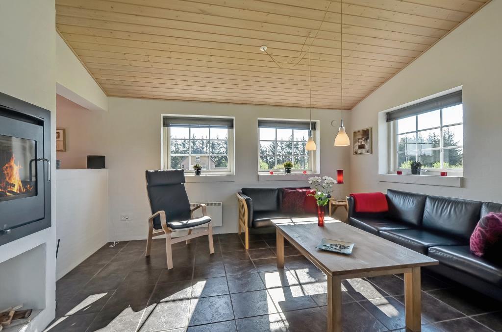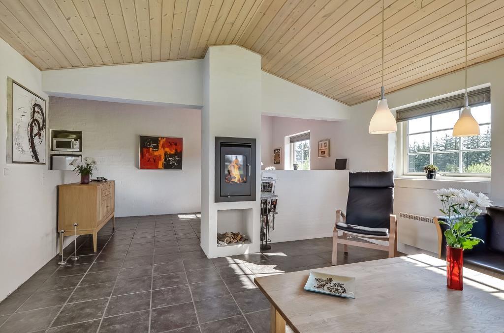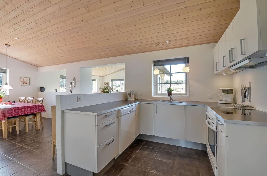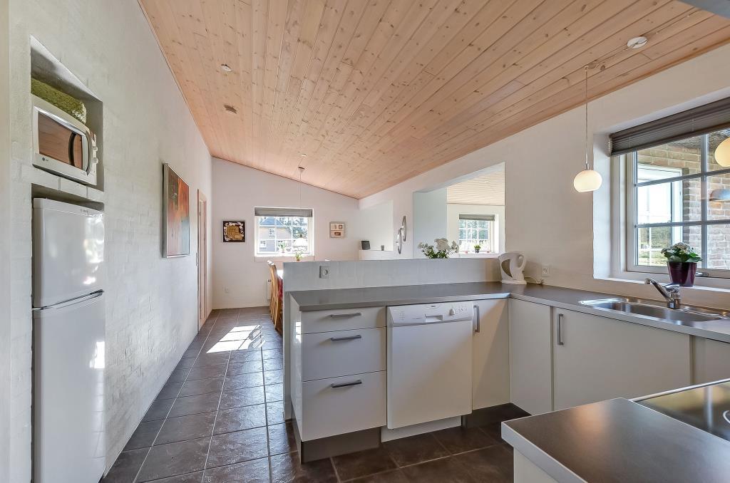 Feriehuset er lyst, rummeligt og smagfuldt indrettet med moderne møbler og en hyggelig atmosfære. Det store køkken/alrum og stue ligger i ét, og herfra er der udgang til den sydvestvendte terrasse, hvor solen kan nydes fra middag til aften.