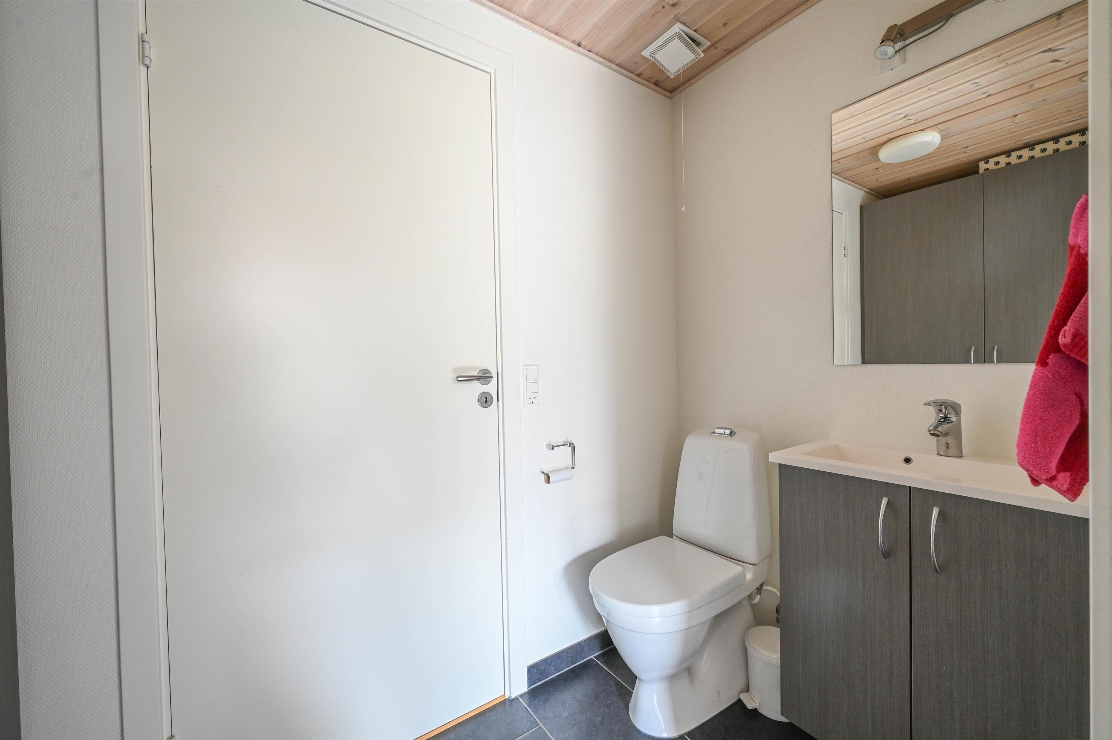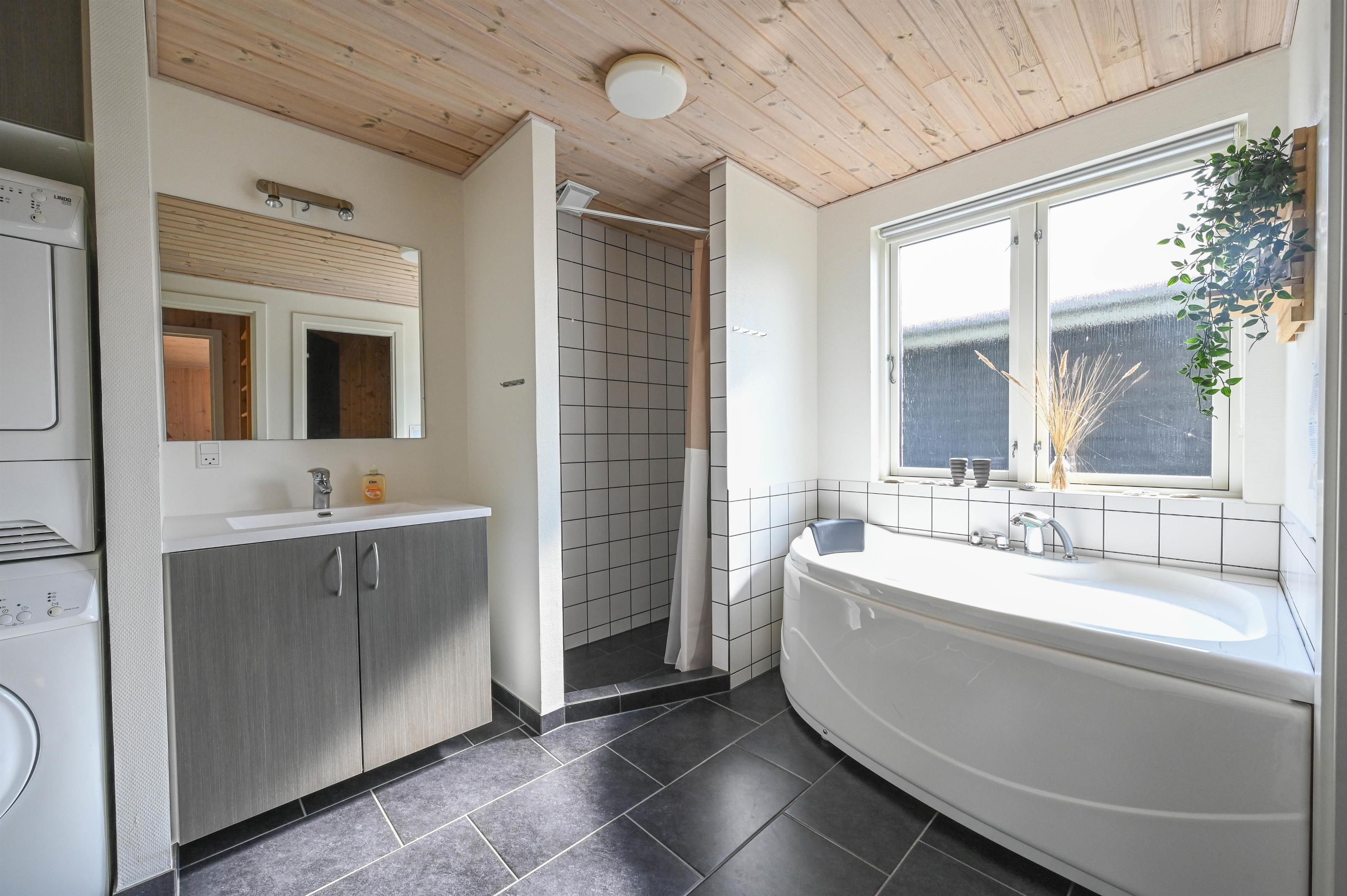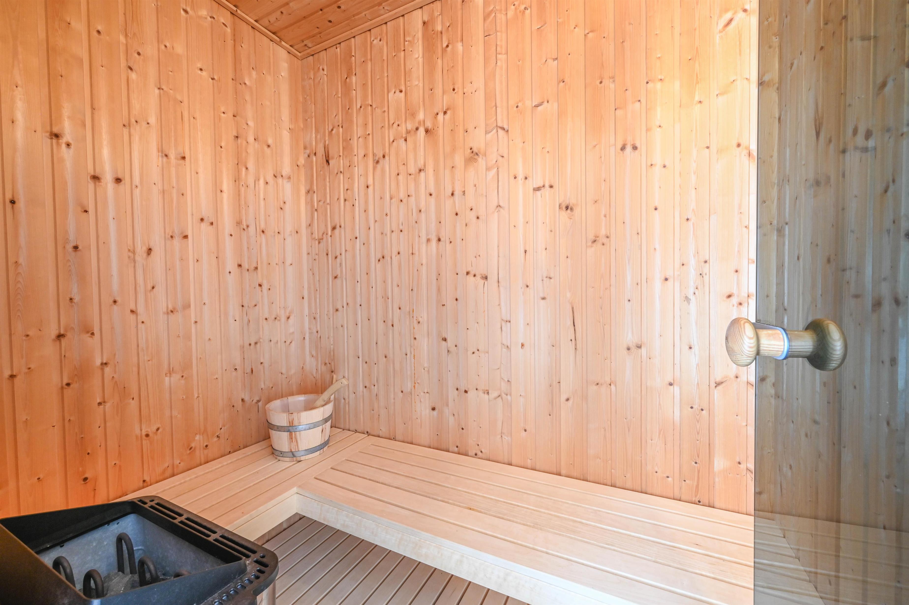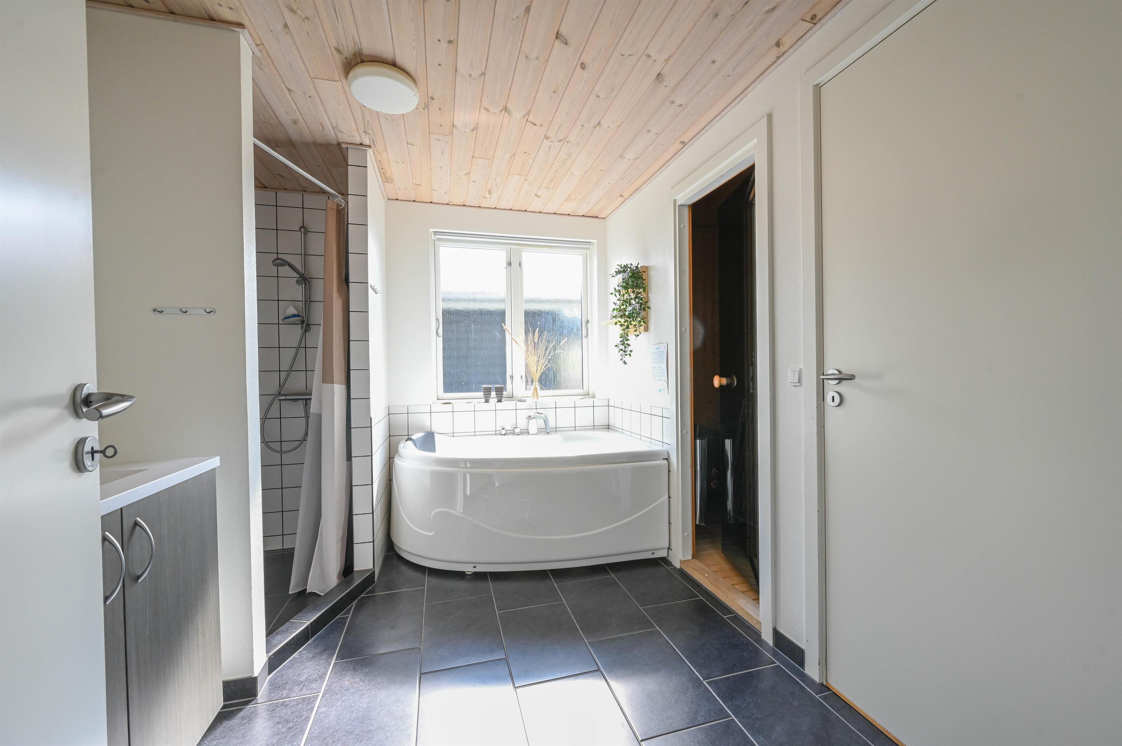 Badeværelset er lyst og indbydende med både spabad, bruseniche og sauna – en lille wellness-oase i sig selv. Toiletområdet er praktisk placeret i forlængelse af badeværelset, så det kan benyttes separat, selv når der er gang i spa, sauna eller bruser.