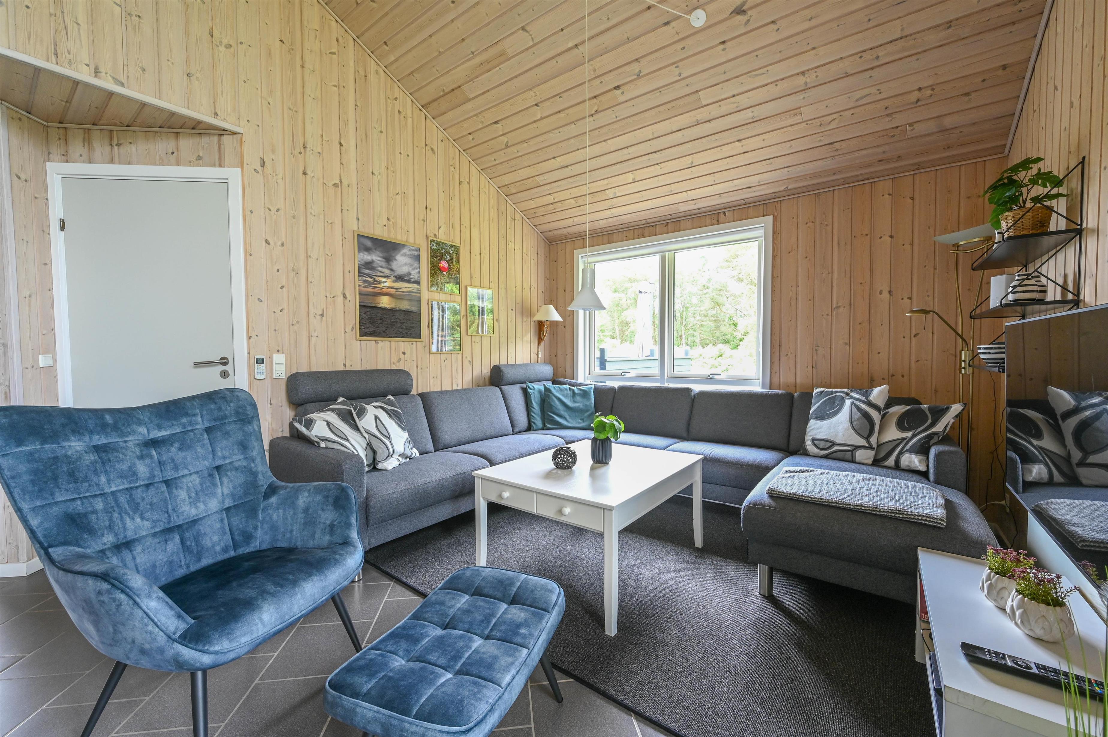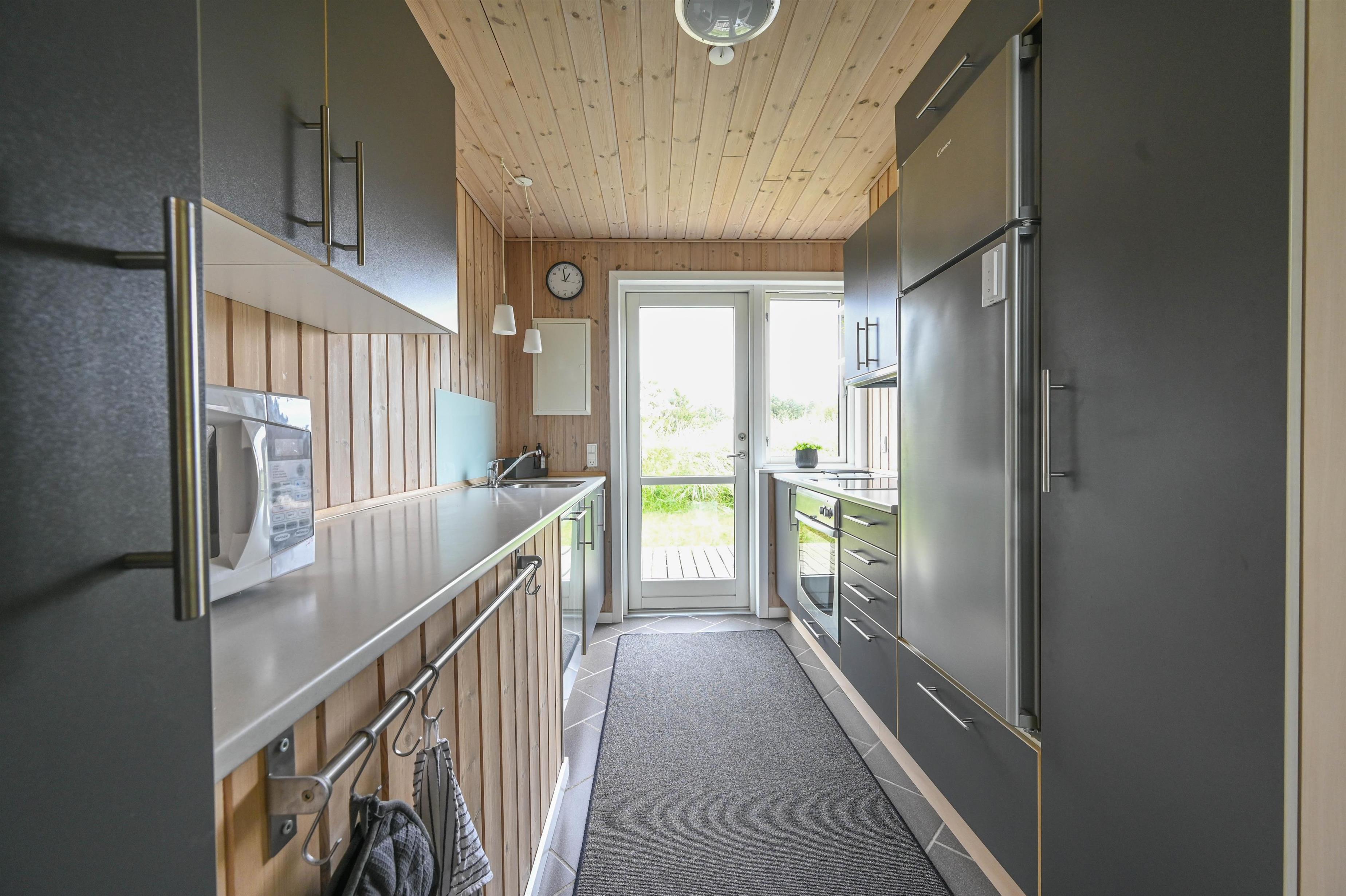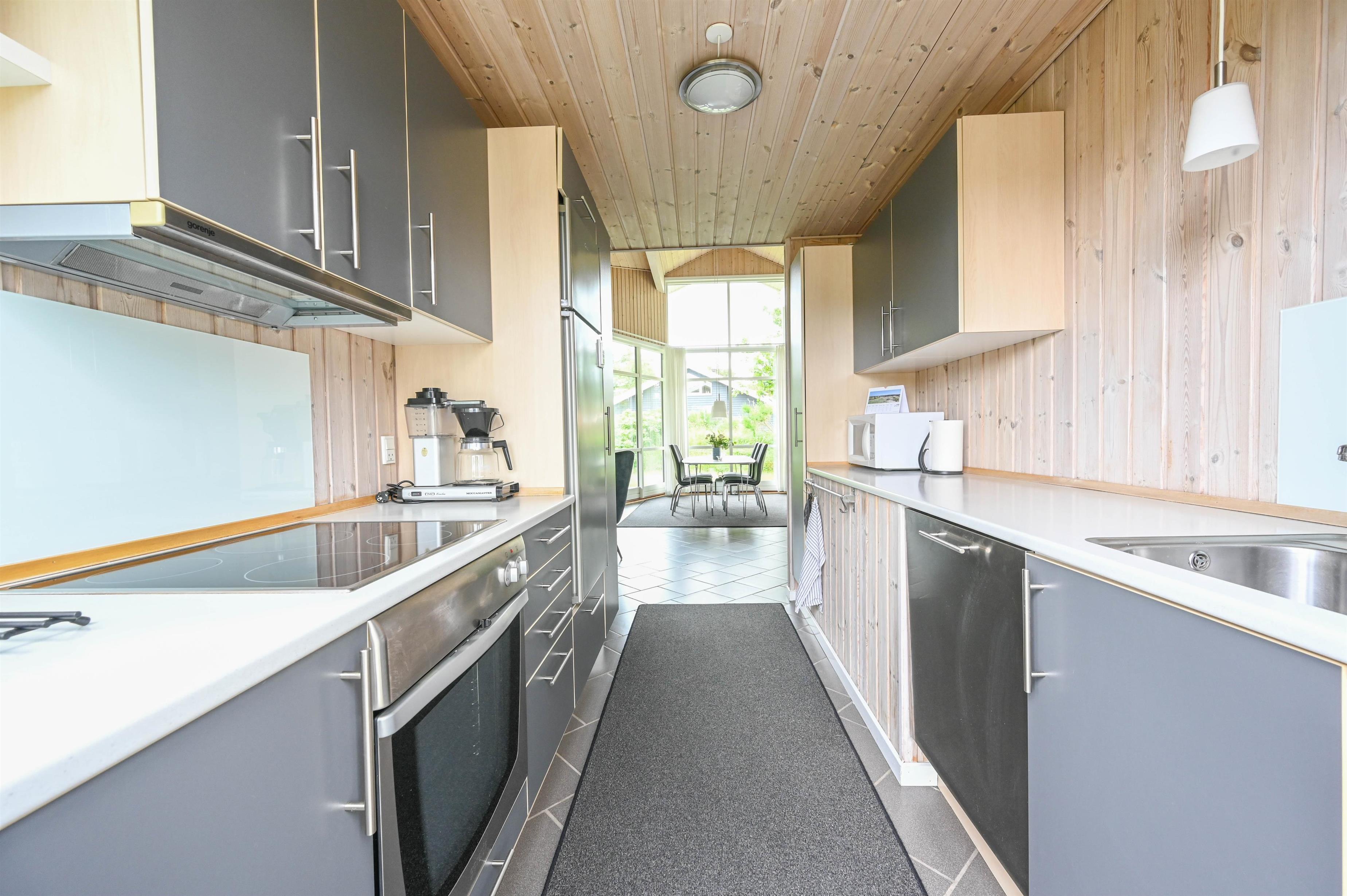 Feriehuset er lyst, indbydende og praktisk indrettet med gode materialer og sans for detaljen. Køkkenet ligger i åben forbindelse med stuen, hvor brændeovn og varmepumpe sørger for behagelig varme året rundt. Her er både spiseplads og sofagruppe – et hyggeligt samlingspunkt for hele familien.