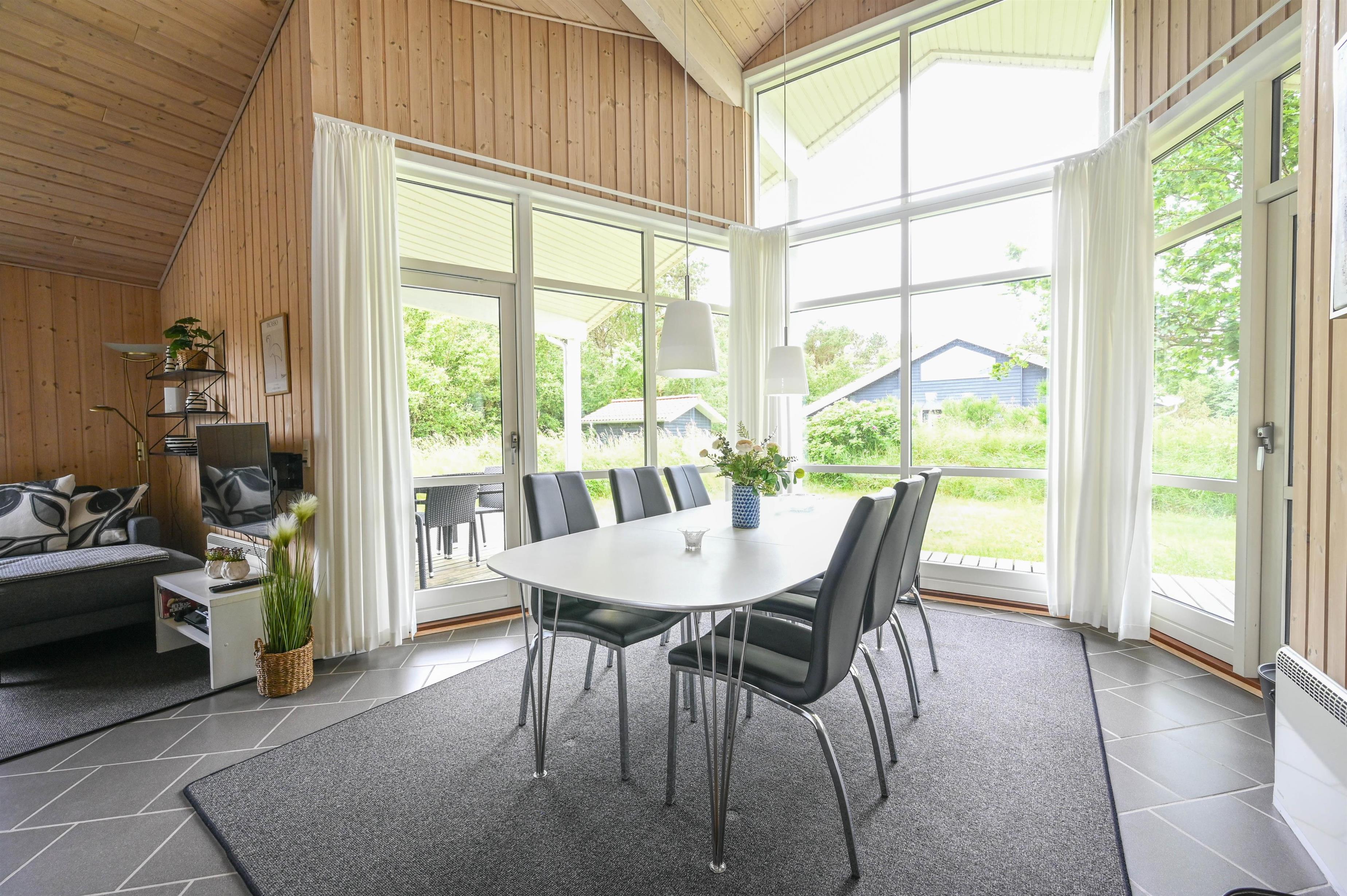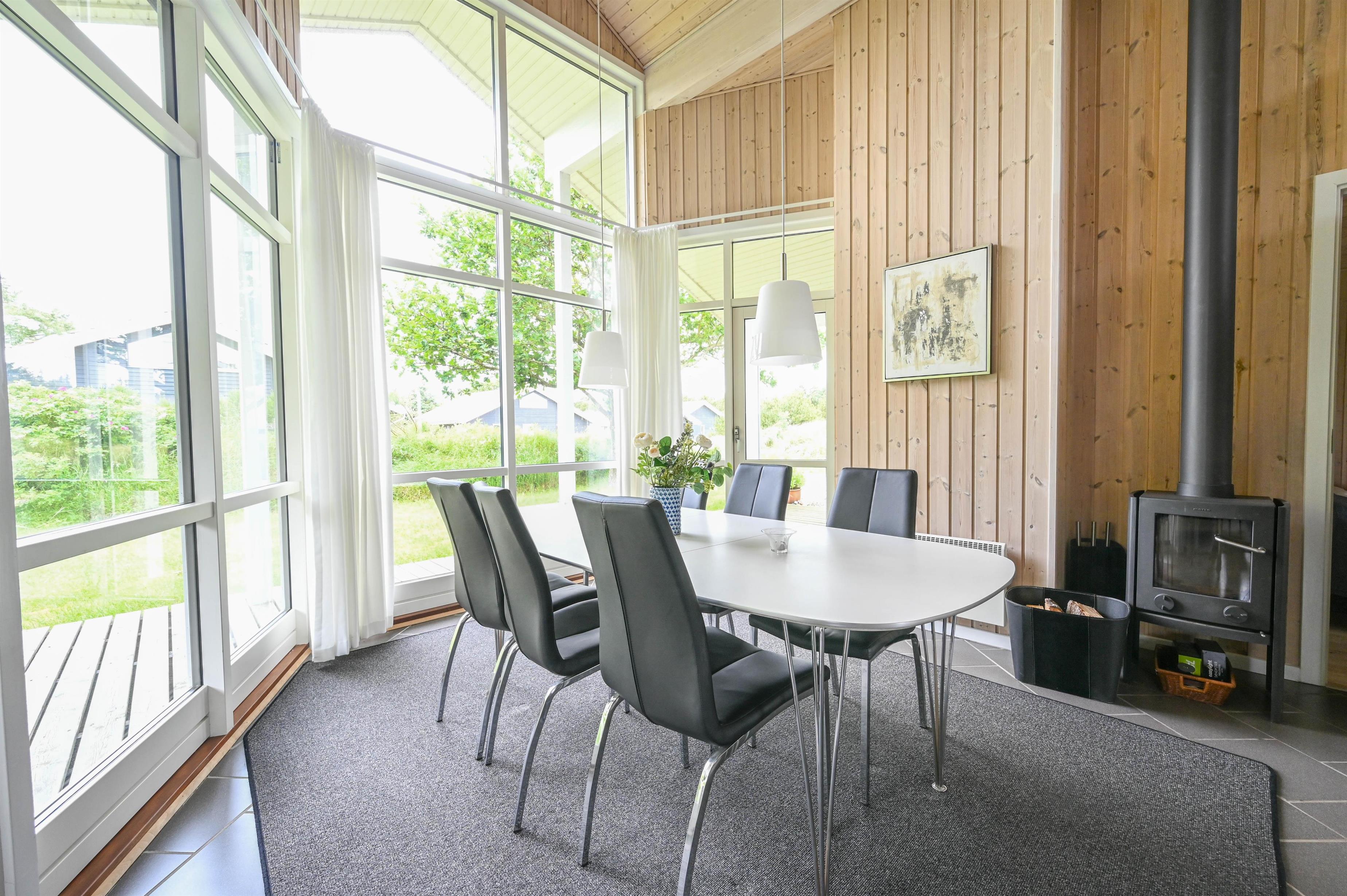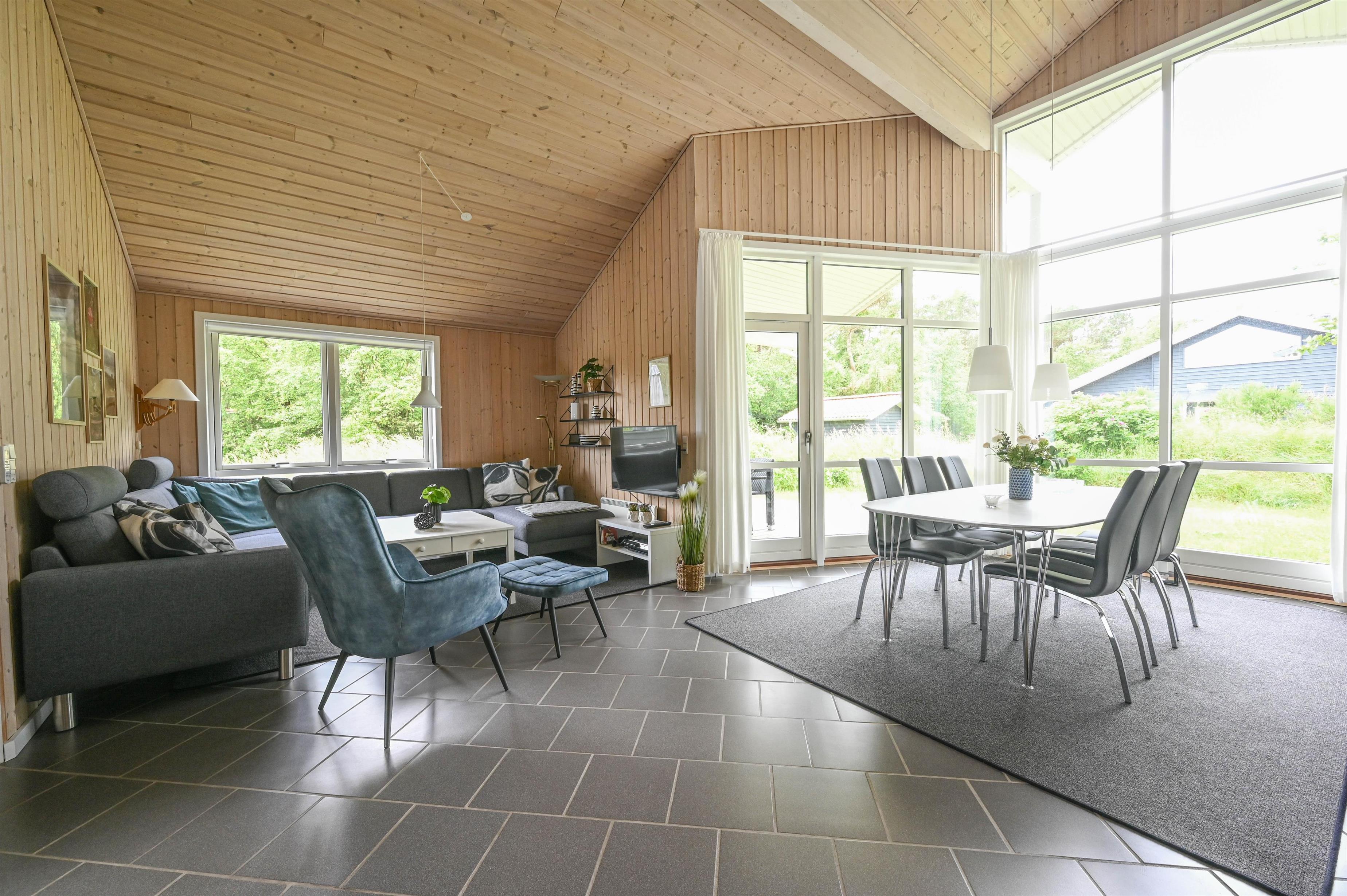 Feriehuset er lyst, indbydende og praktisk indrettet med gode materialer og sans for detaljen. Køkkenet ligger i åben forbindelse med stuen, hvor brændeovn og varmepumpe sørger for behagelig varme året rundt. Her er både spiseplads og sofagruppe – et hyggeligt samlingspunkt for hele familien.