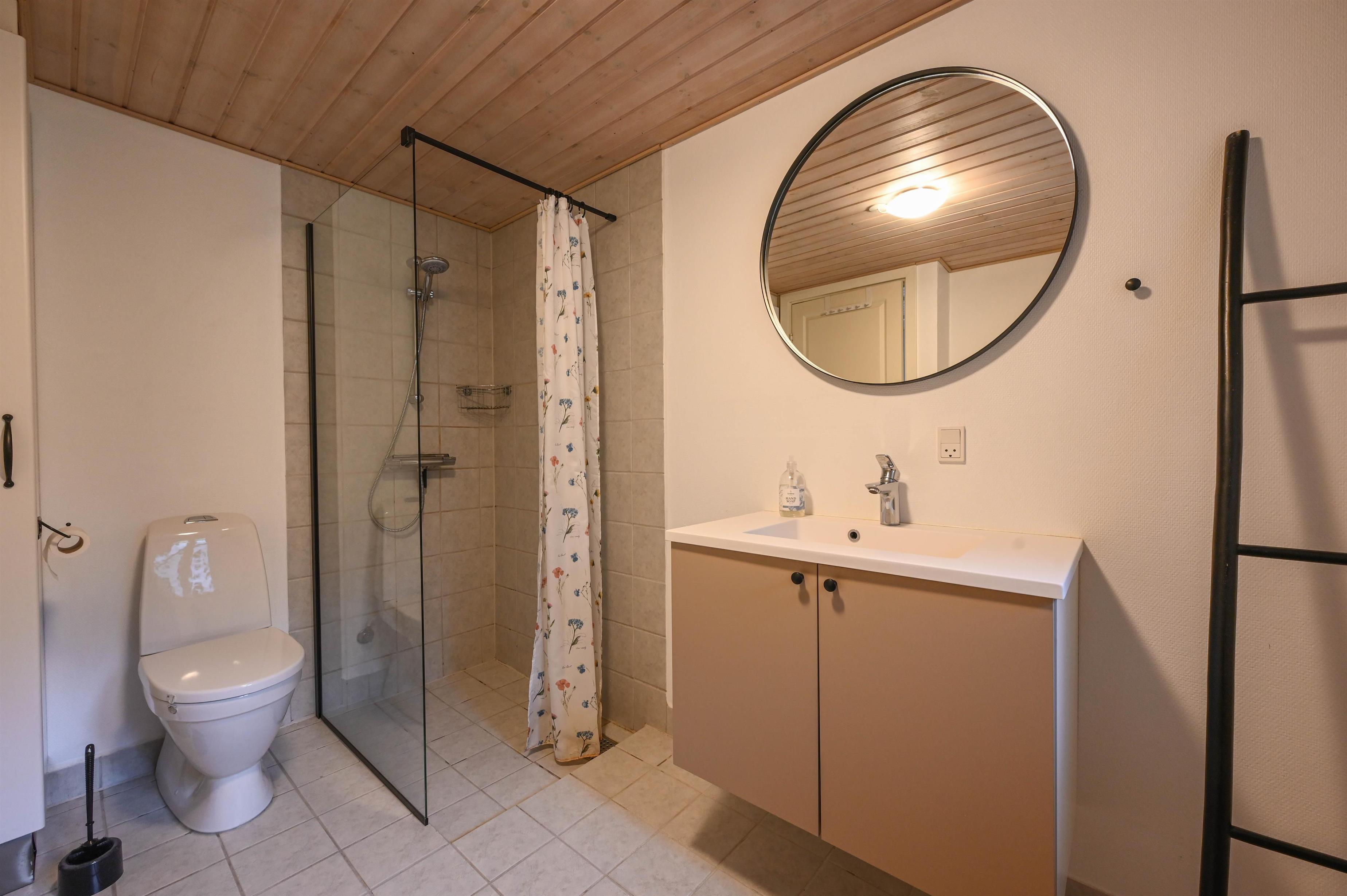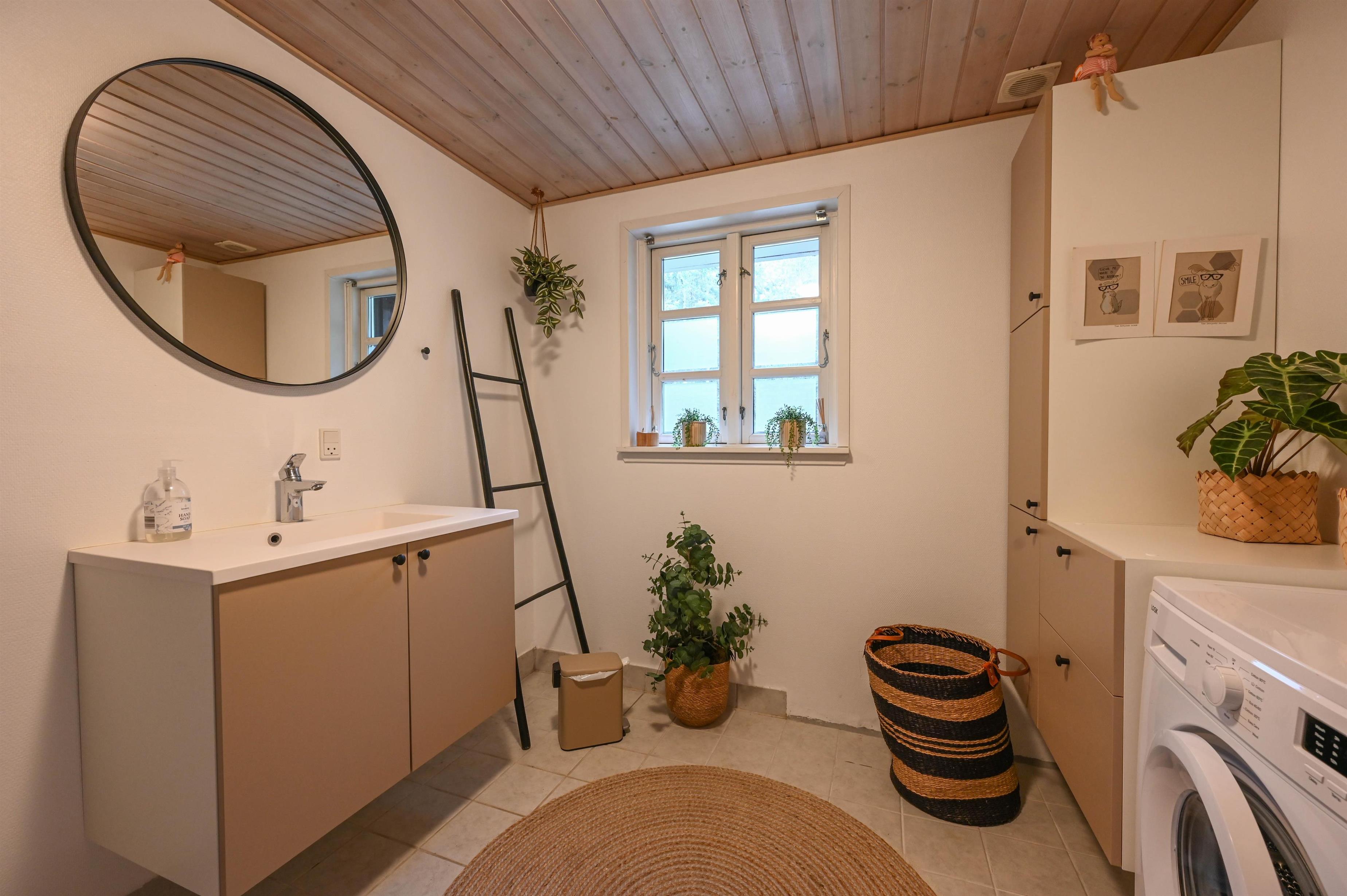 Badeværelset er pænt og funktionelt indrettet med bruseniche og lille vaskemaskine.