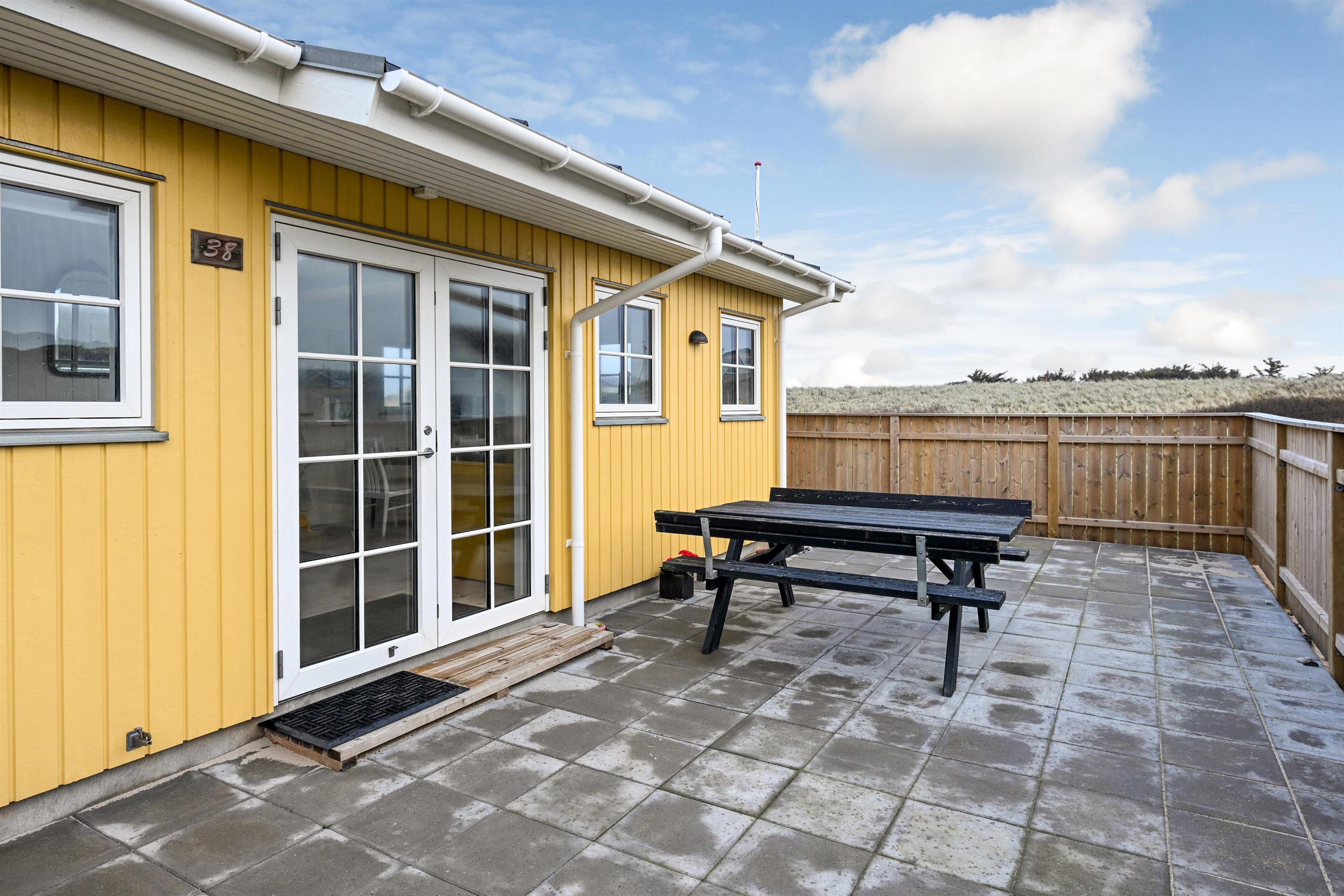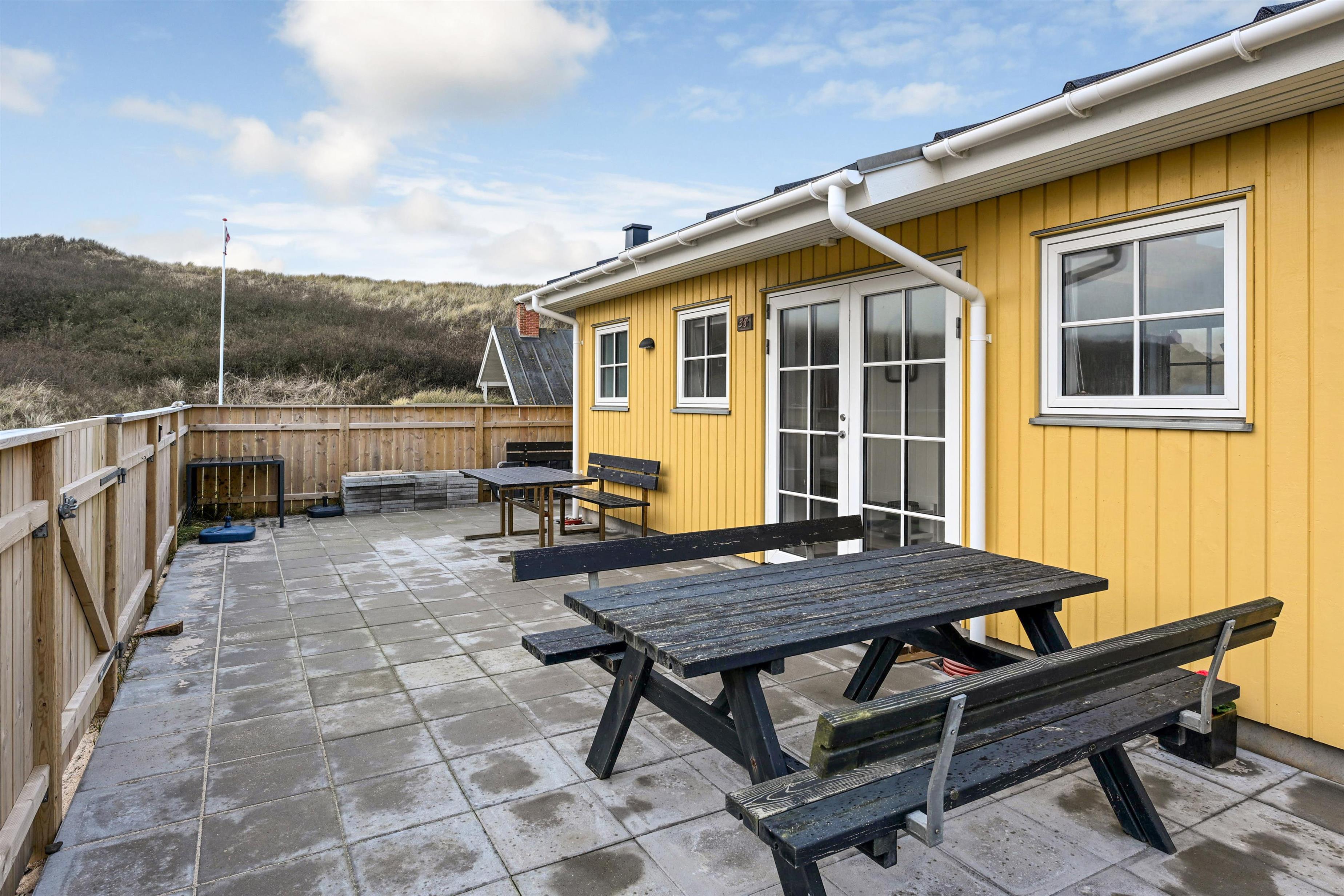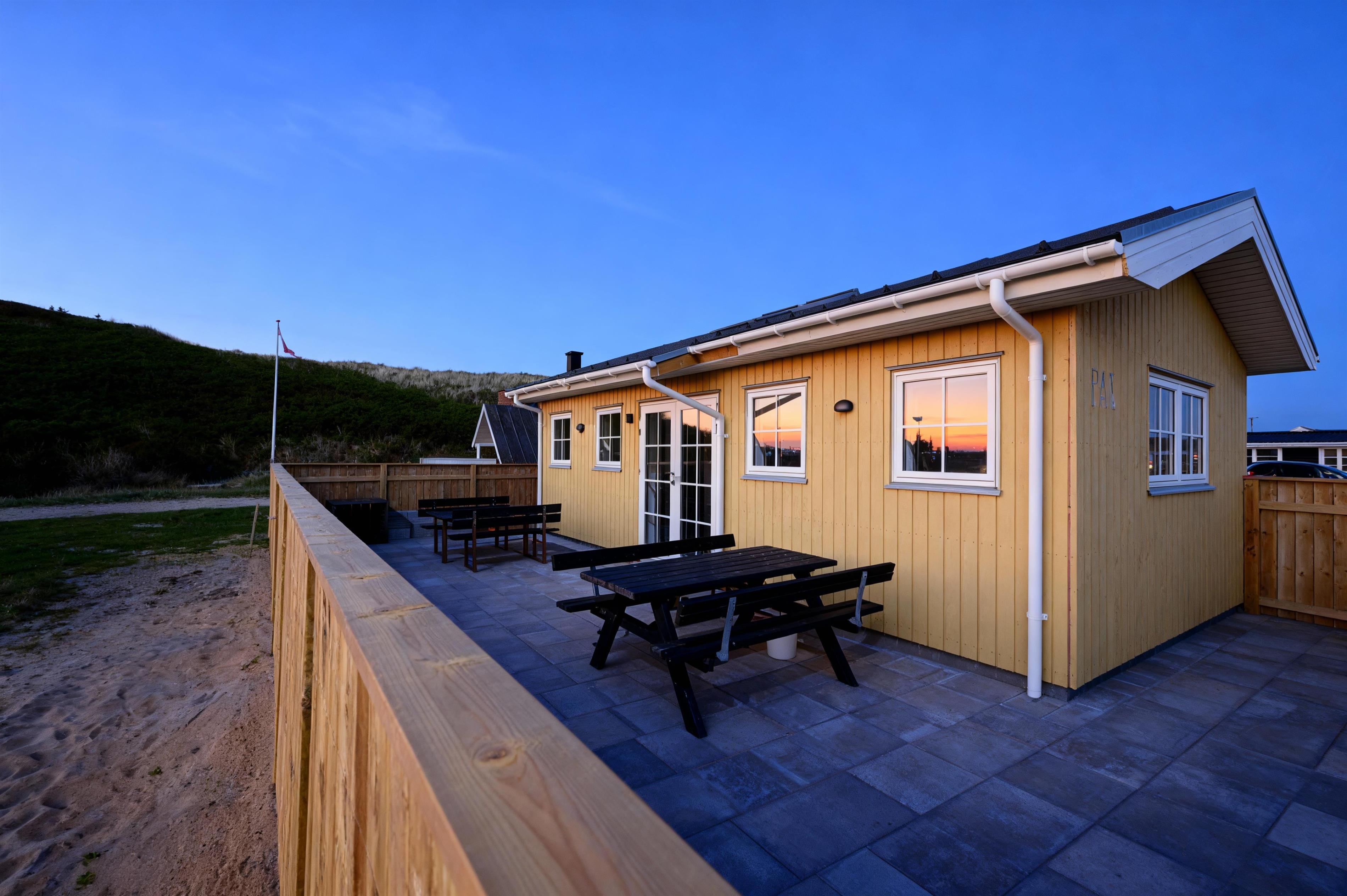 Udenfor finder du en stor terrasse, perfekt til solbadning, afslapning og måltider under åben himmel, mens havluften og naturens ro sætter rammen om ferien.