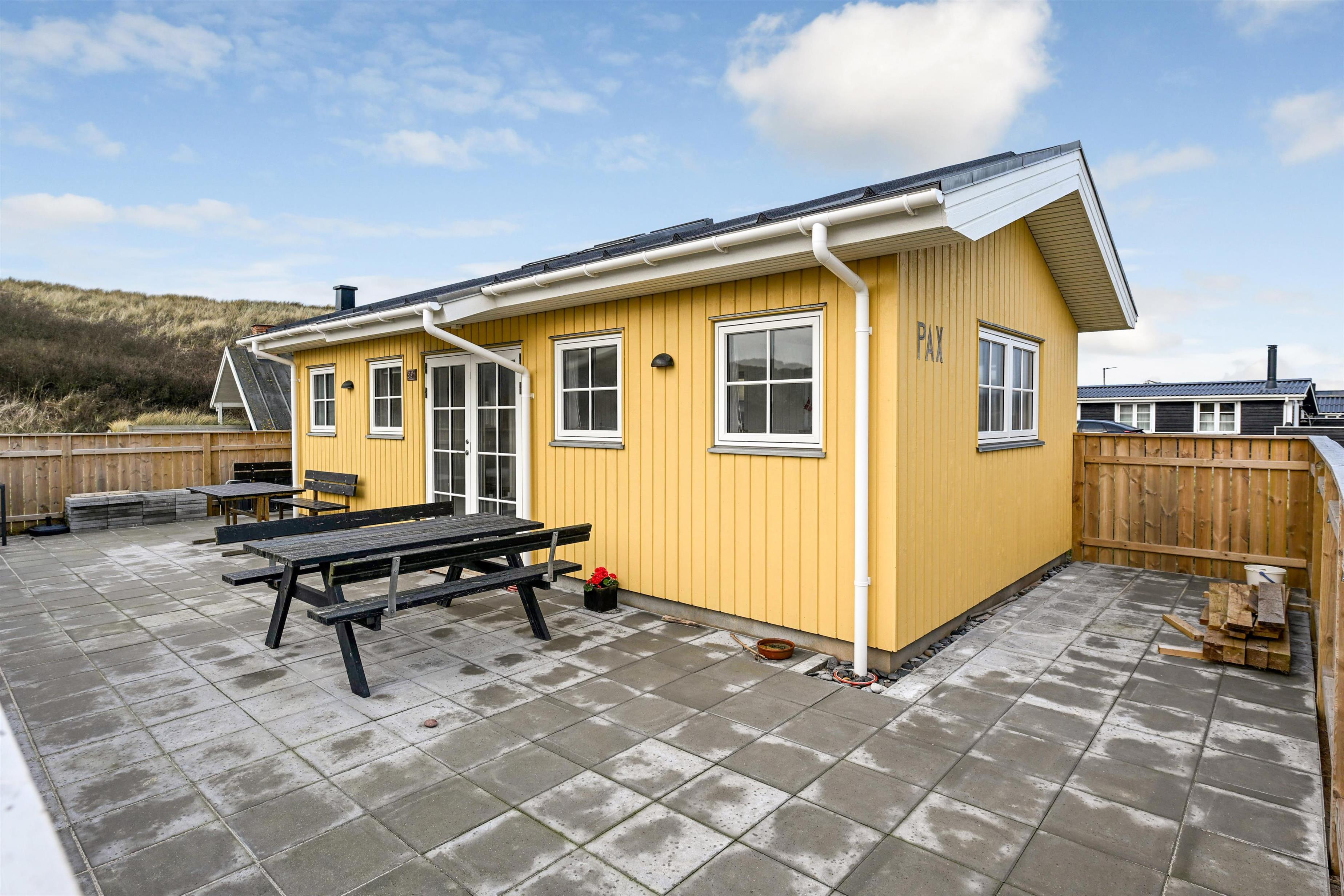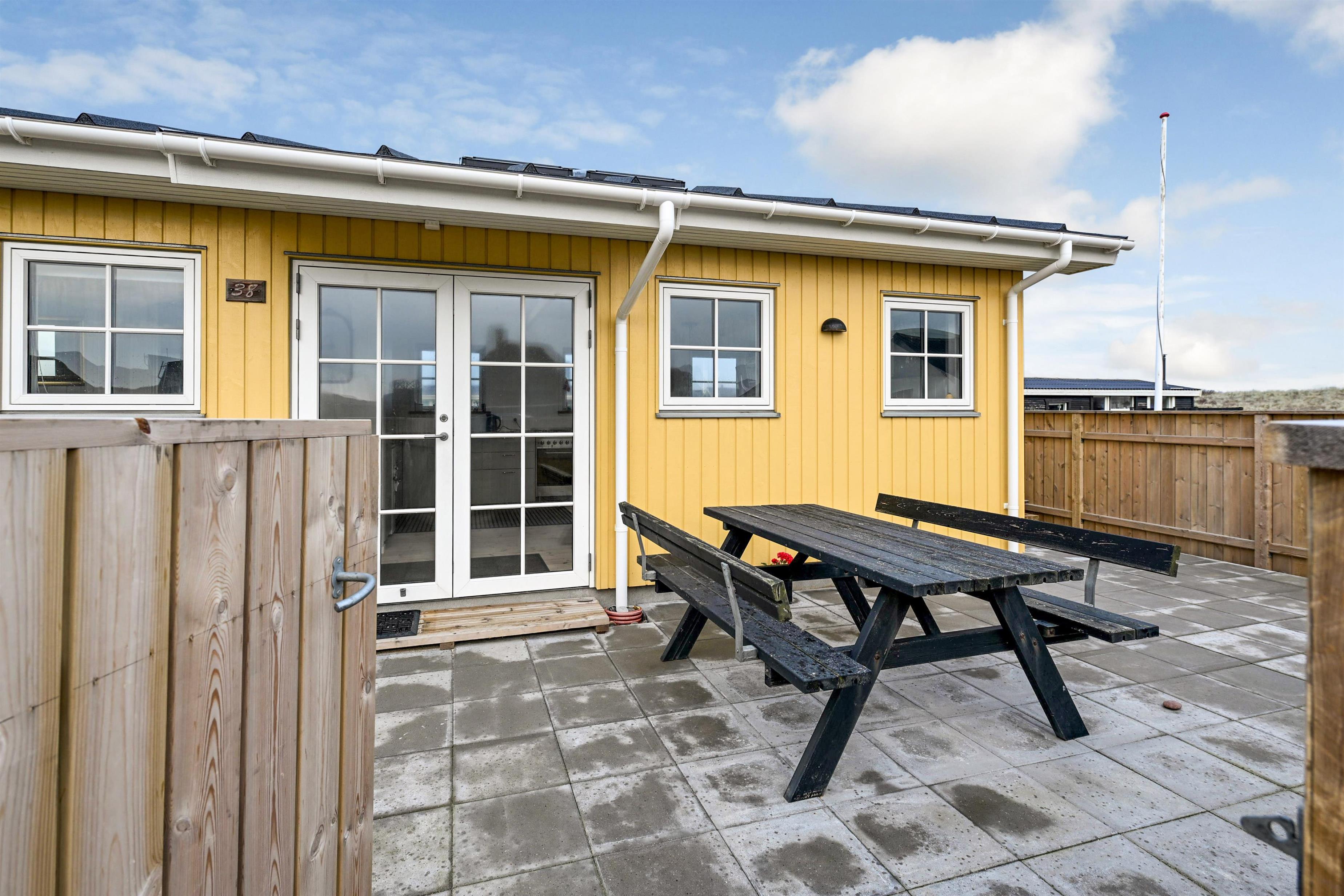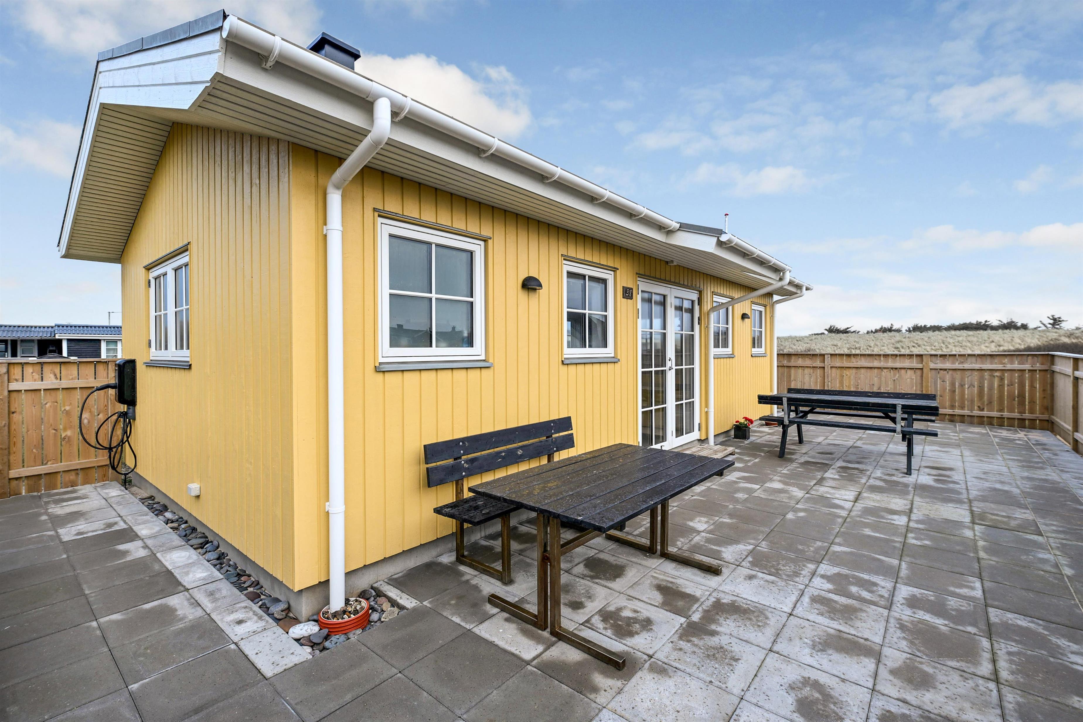 Udenfor finder du en stor terrasse, perfekt til solbadning, afslapning og måltider under åben himmel, mens havluften og naturens ro sætter rammen om ferien.