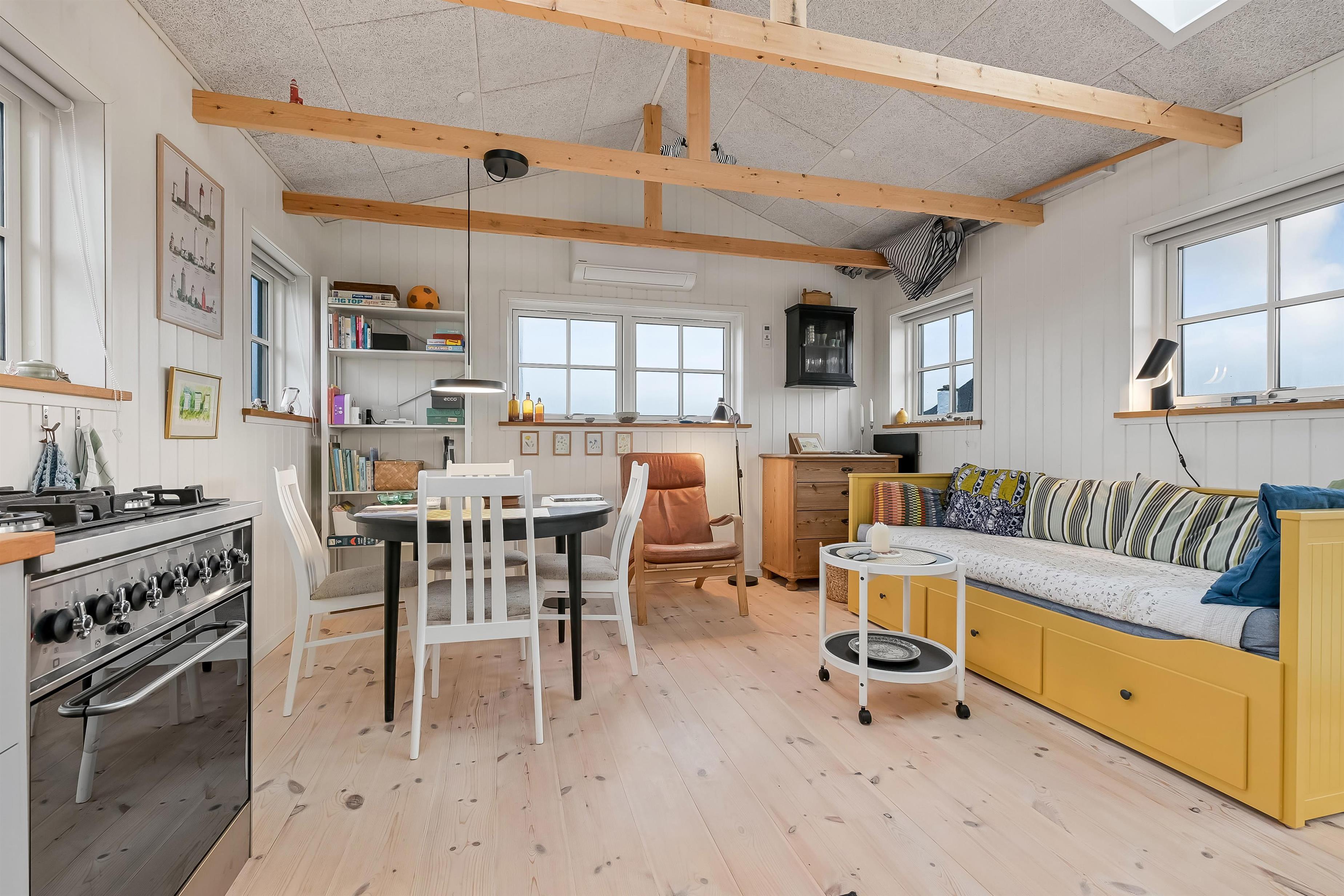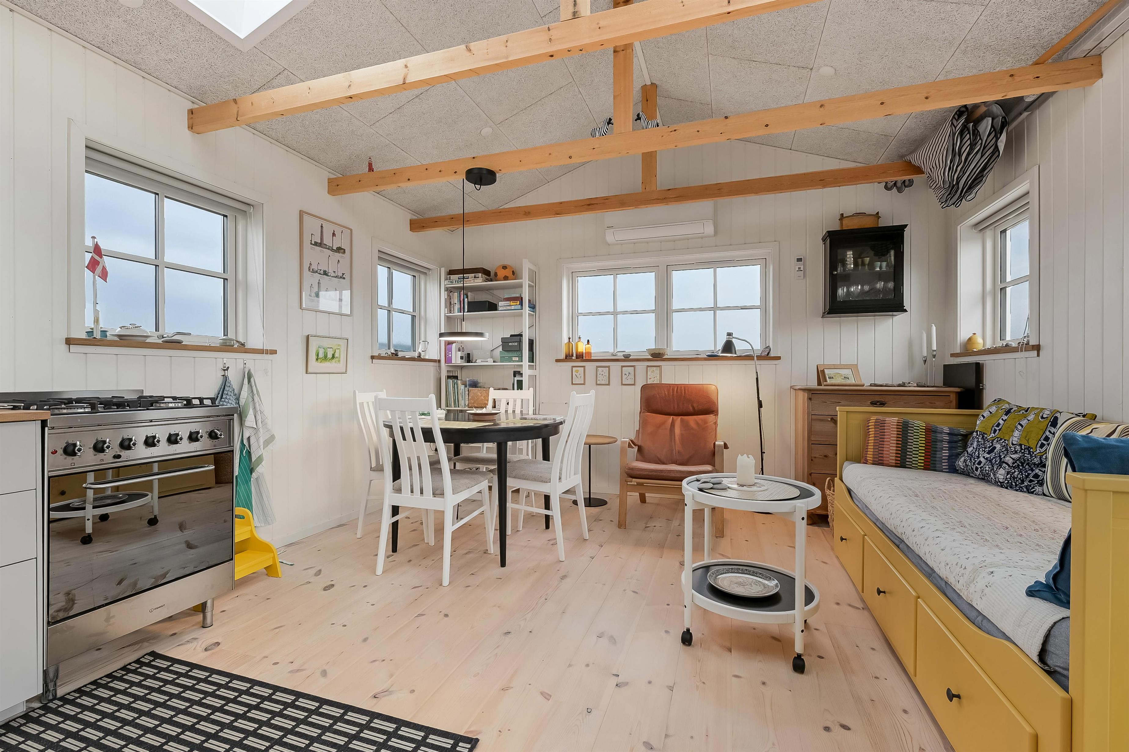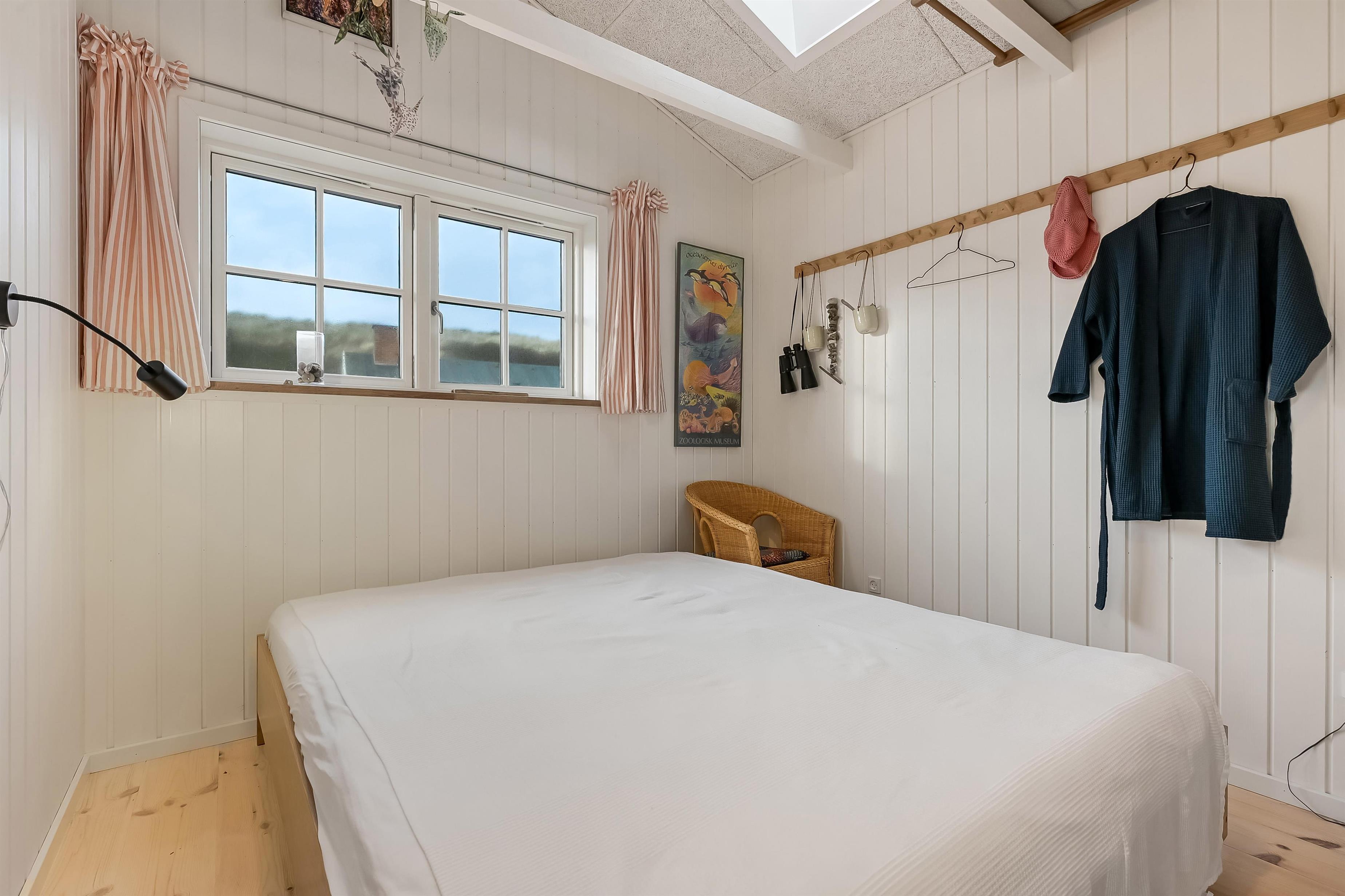 Indvendigt rummer huset et hyggeligt soveværelse med dobbeltseng, et veludstyret køkken og et pænt badeværelse med bruser og gulvvarme. Opholdsrummet fungerer som husets naturlige samlingspunkt, hvor du kan slappe af efter en dag ved stranden eller i klitterne.