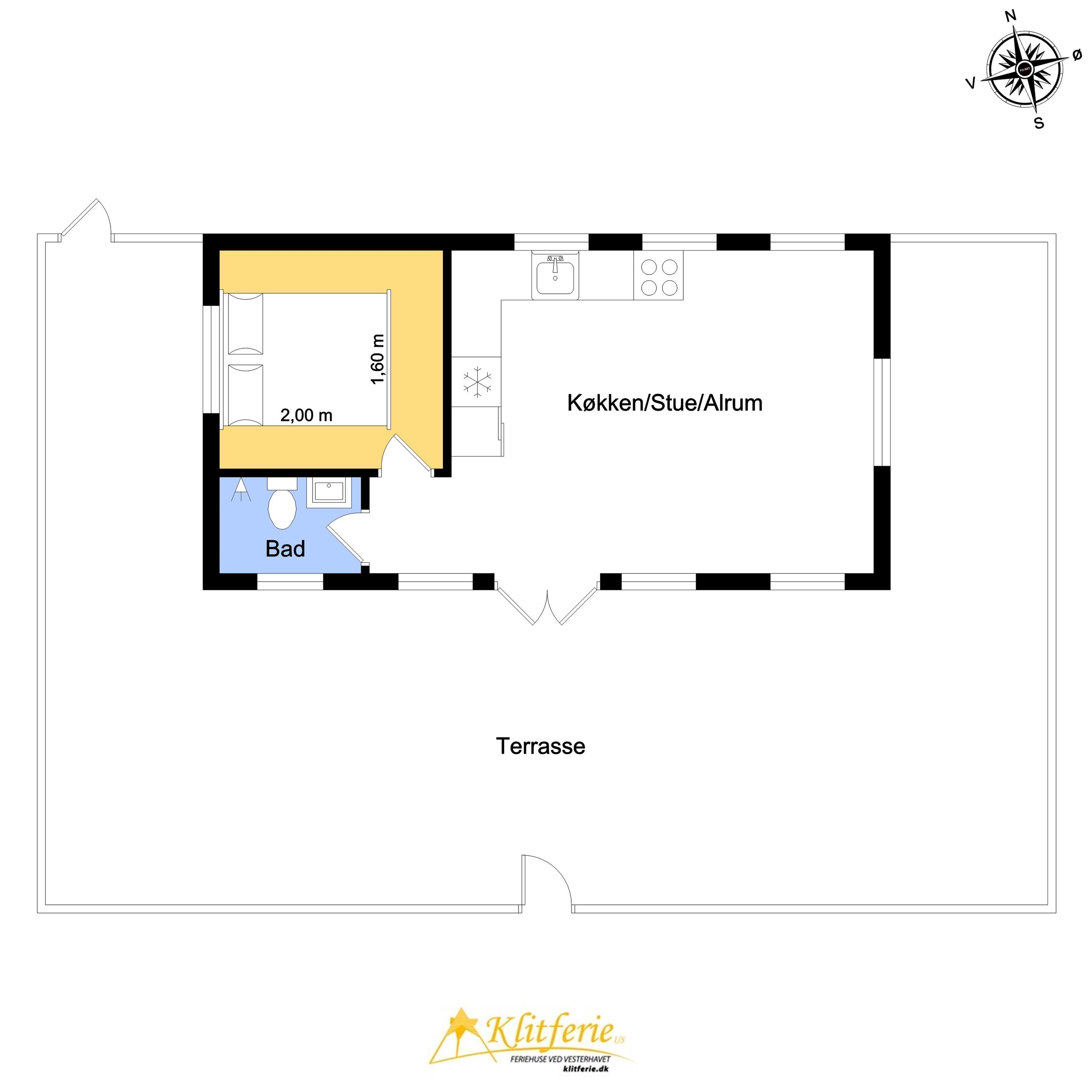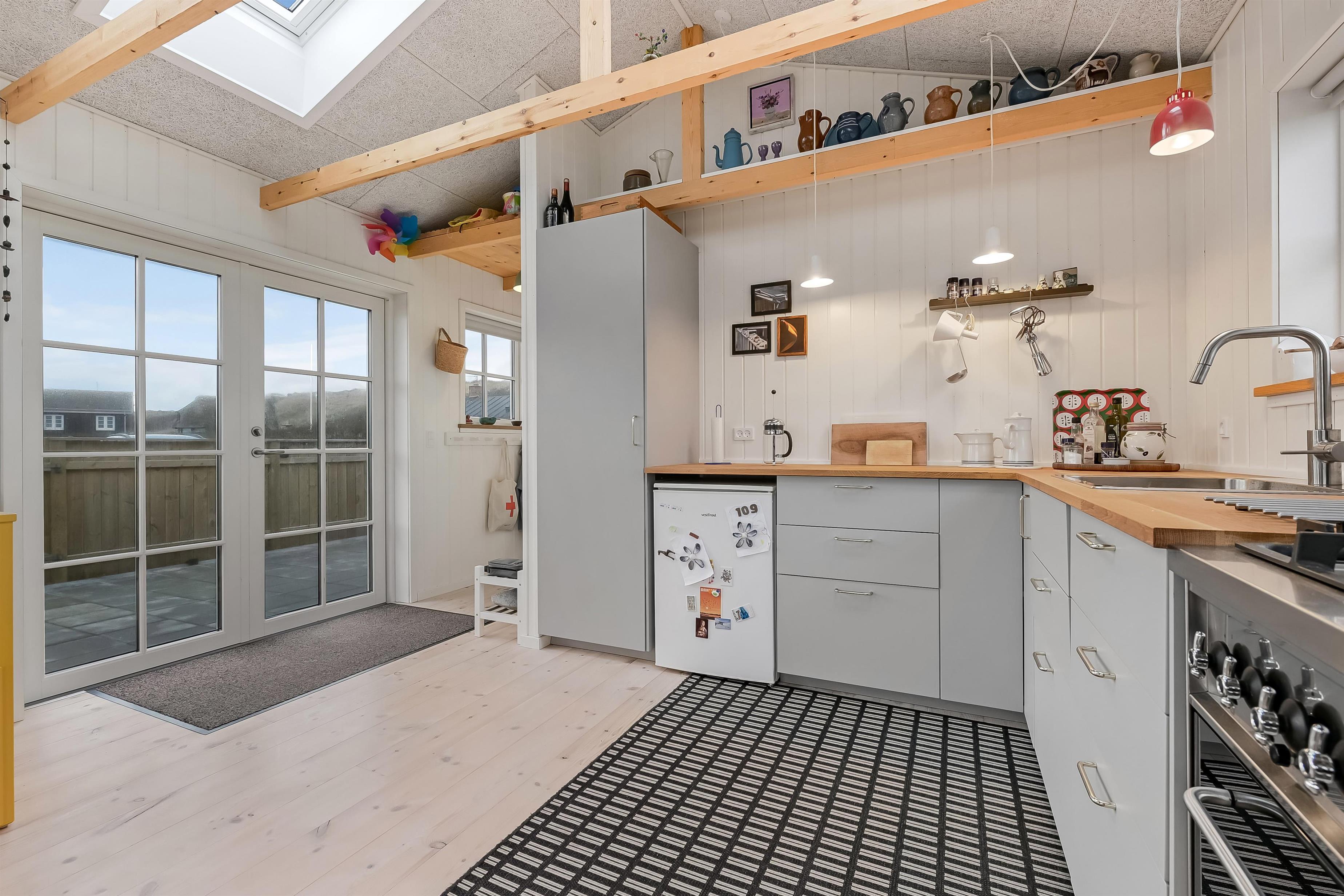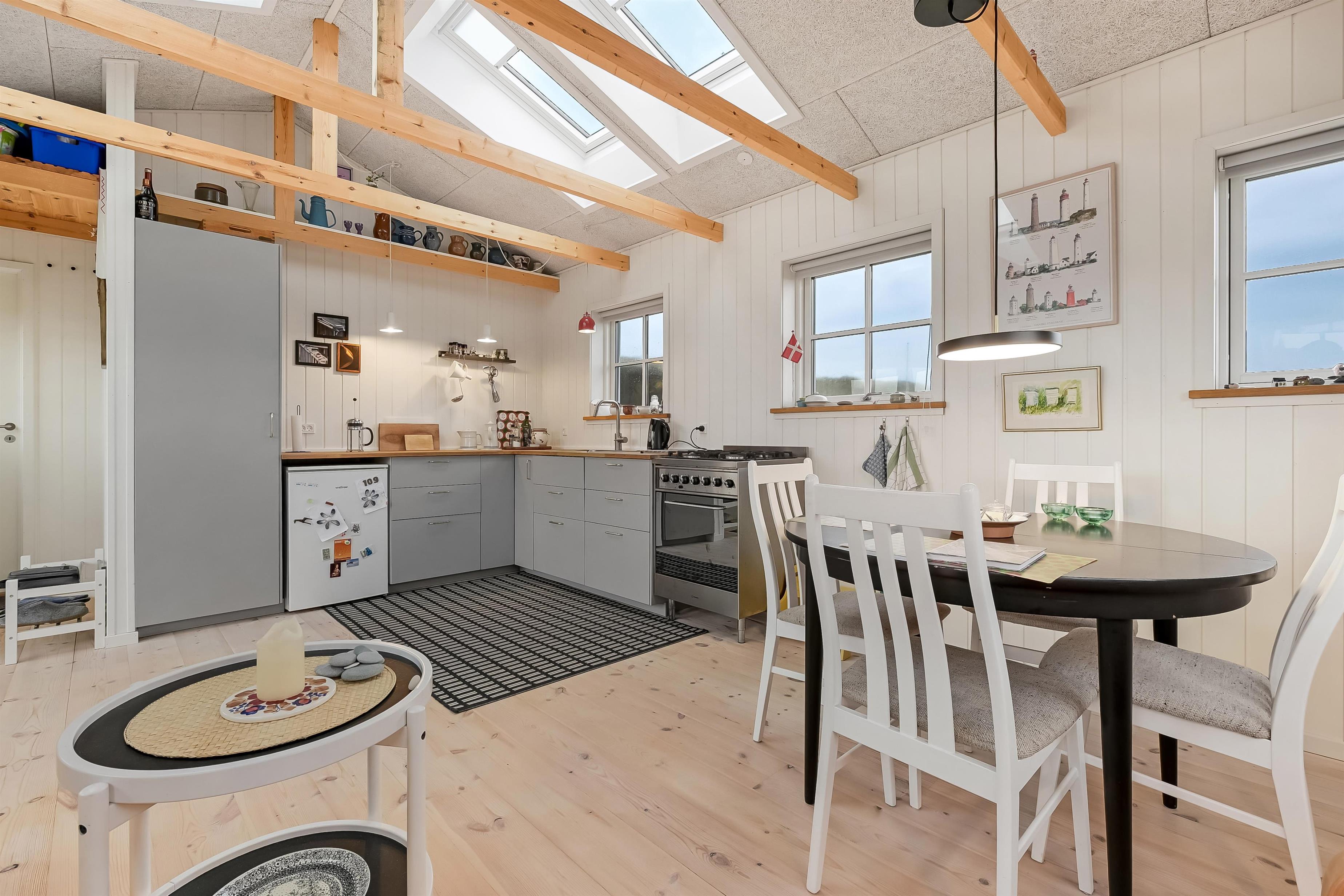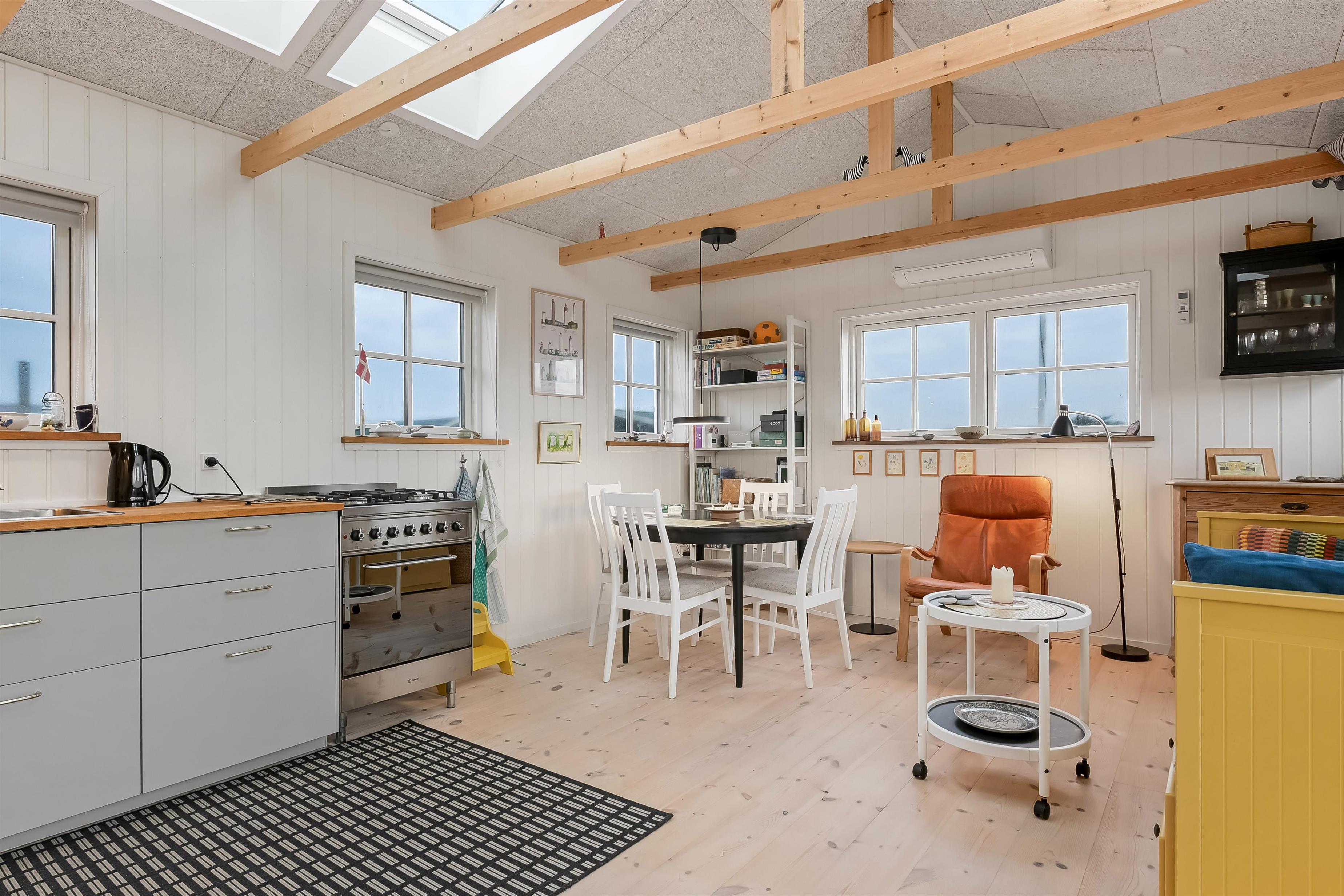 Indvendigt rummer huset et hyggeligt soveværelse med dobbeltseng, et veludstyret køkken og et pænt badeværelse med bruser og gulvvarme. Opholdsrummet fungerer som husets naturlige samlingspunkt, hvor du kan slappe af efter en dag ved stranden eller i klitterne.