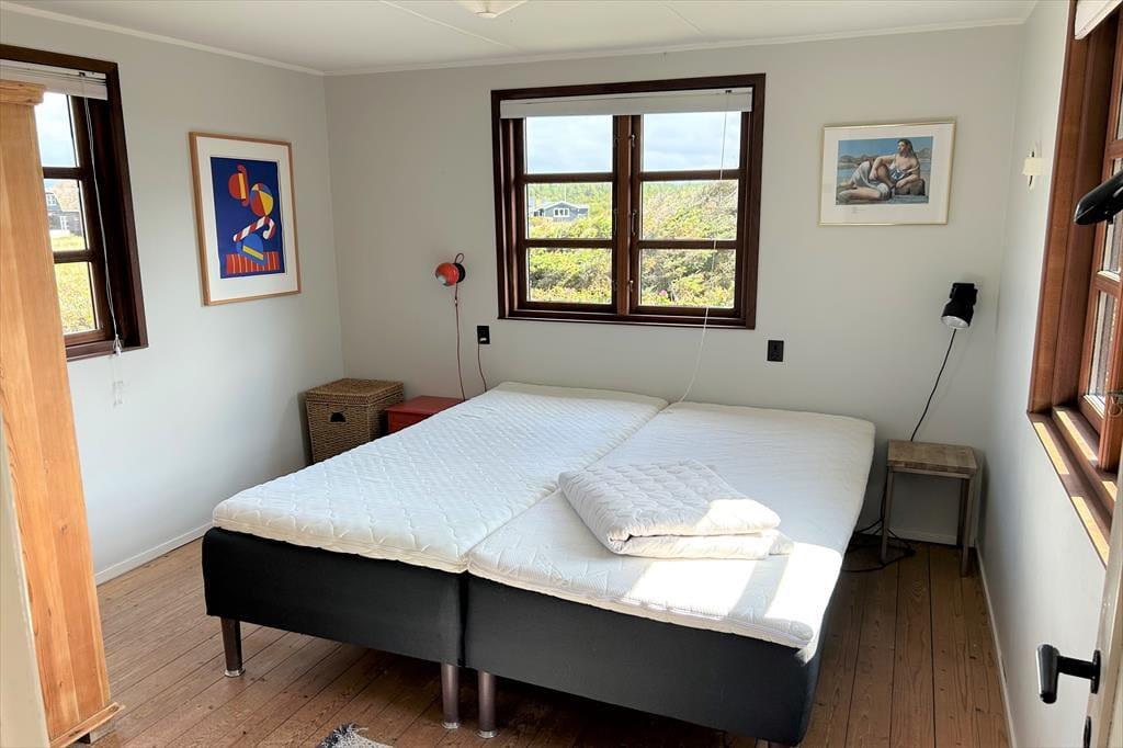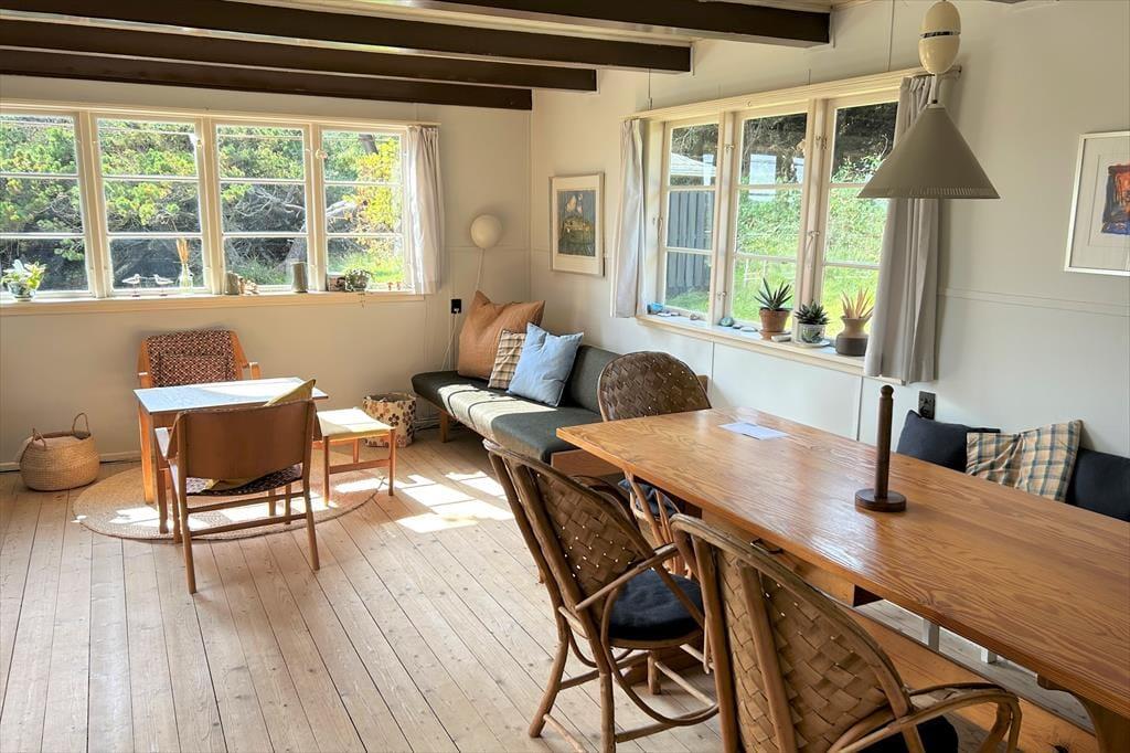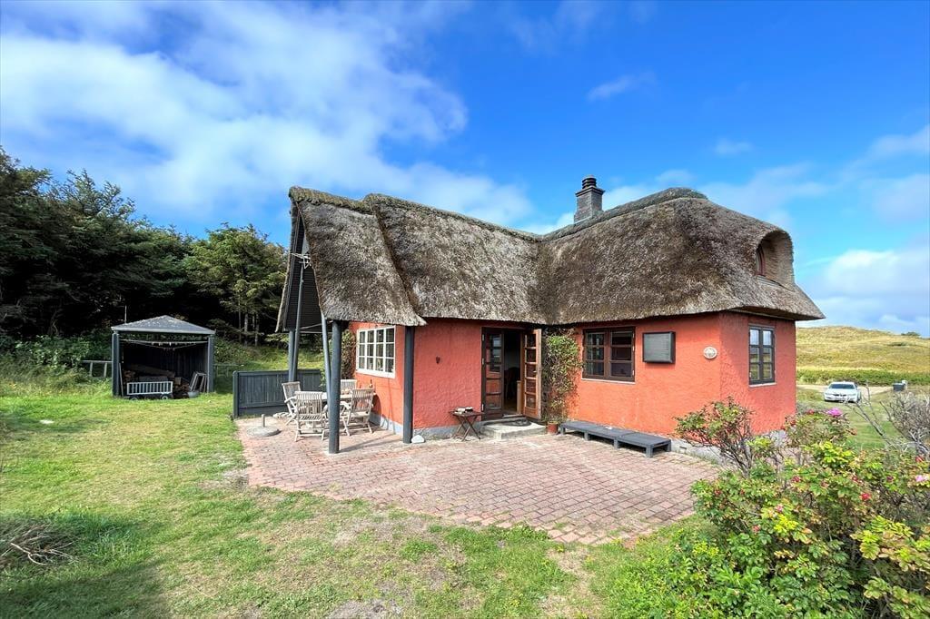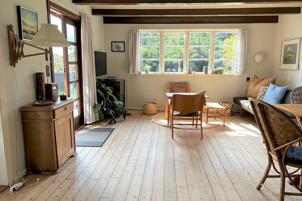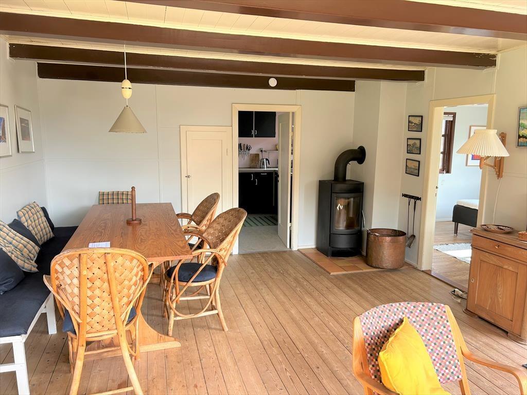 Forestil jer at vågne op til lyden af Vesterhavets bølger og træde direkte ud i klitterne – fra havelågen har I jeres helt egen sti til stranden. Dette charmerende feriehus ligger midt i den rå, vestjyske natur og byder på ro, nærvær og autentisk sommerhusstemning. De lyse, indbydende rum er indrettet med klassiske møbler, der skaber varme og personlighed, og stuen med brændeovn indbyder til hyggelige timer med afslapning, gode samtaler eller læsning af en god bog. Køkkenet er funktionelt og veludstyret, så I kan tilberede lækre måltider og nyde dem i det åbne spisestueområde. Her får I et helt særligt fristed, hvor I kan lade hverdagen blive hjemme og nyde hav, hede og hygge i rolige omgivelser.
