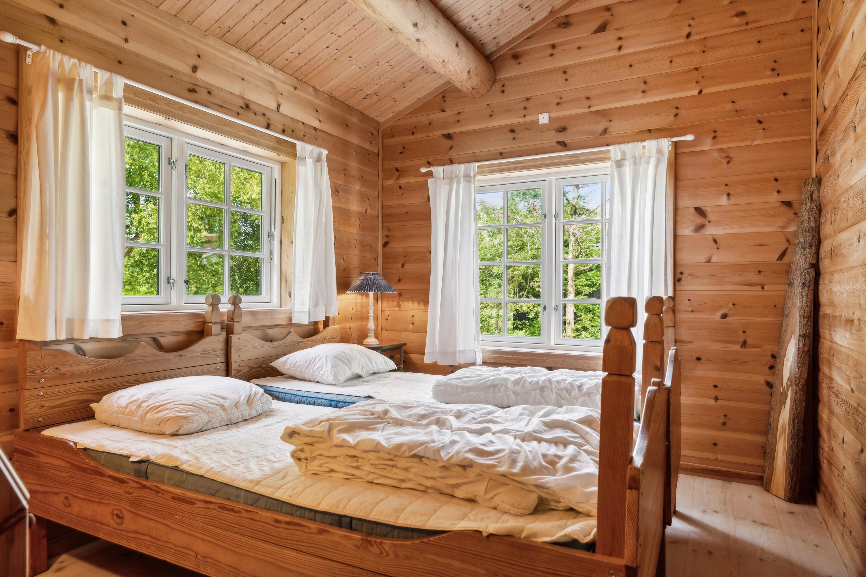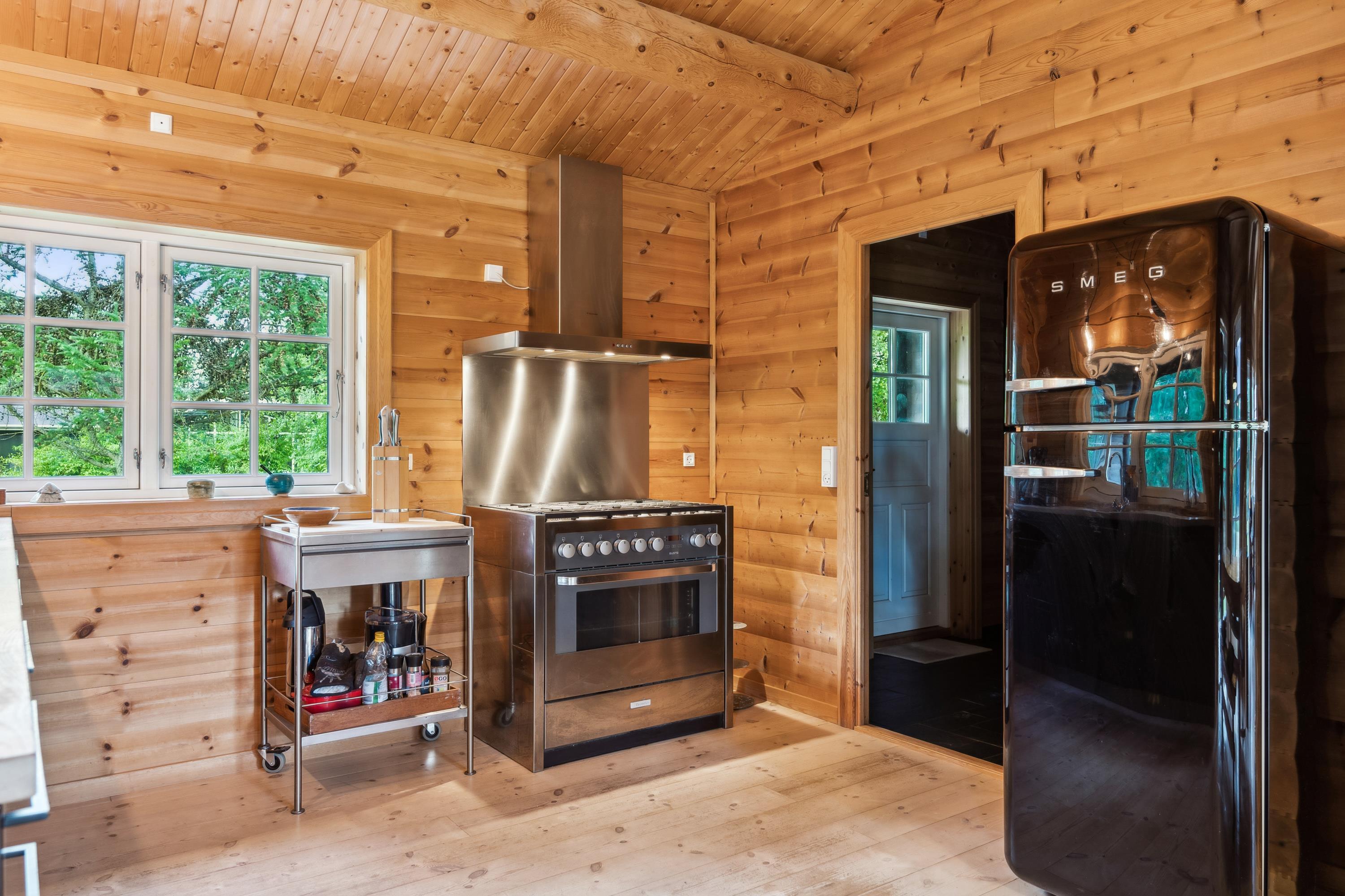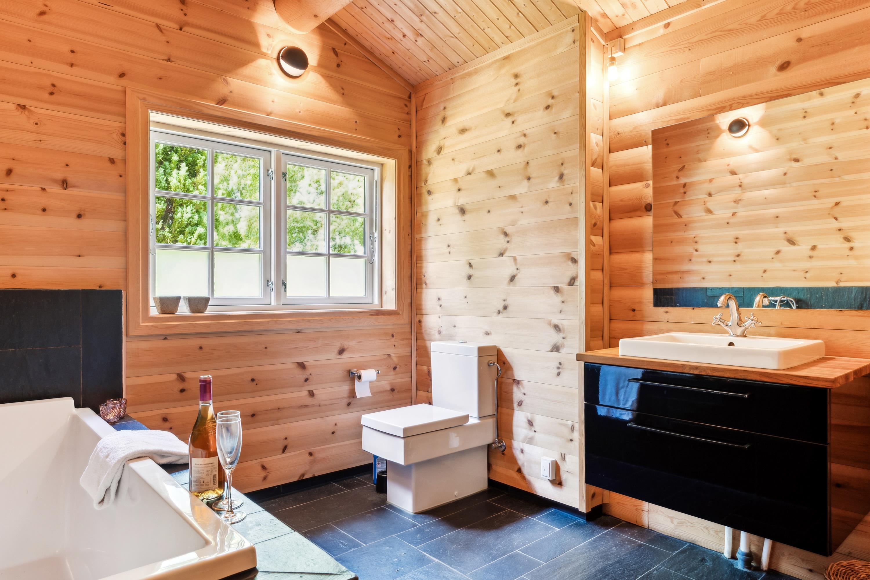 Charmerende norsk bjælkehus nær børnevenlig strand med stor terrasse og skønne udendørsarealer.