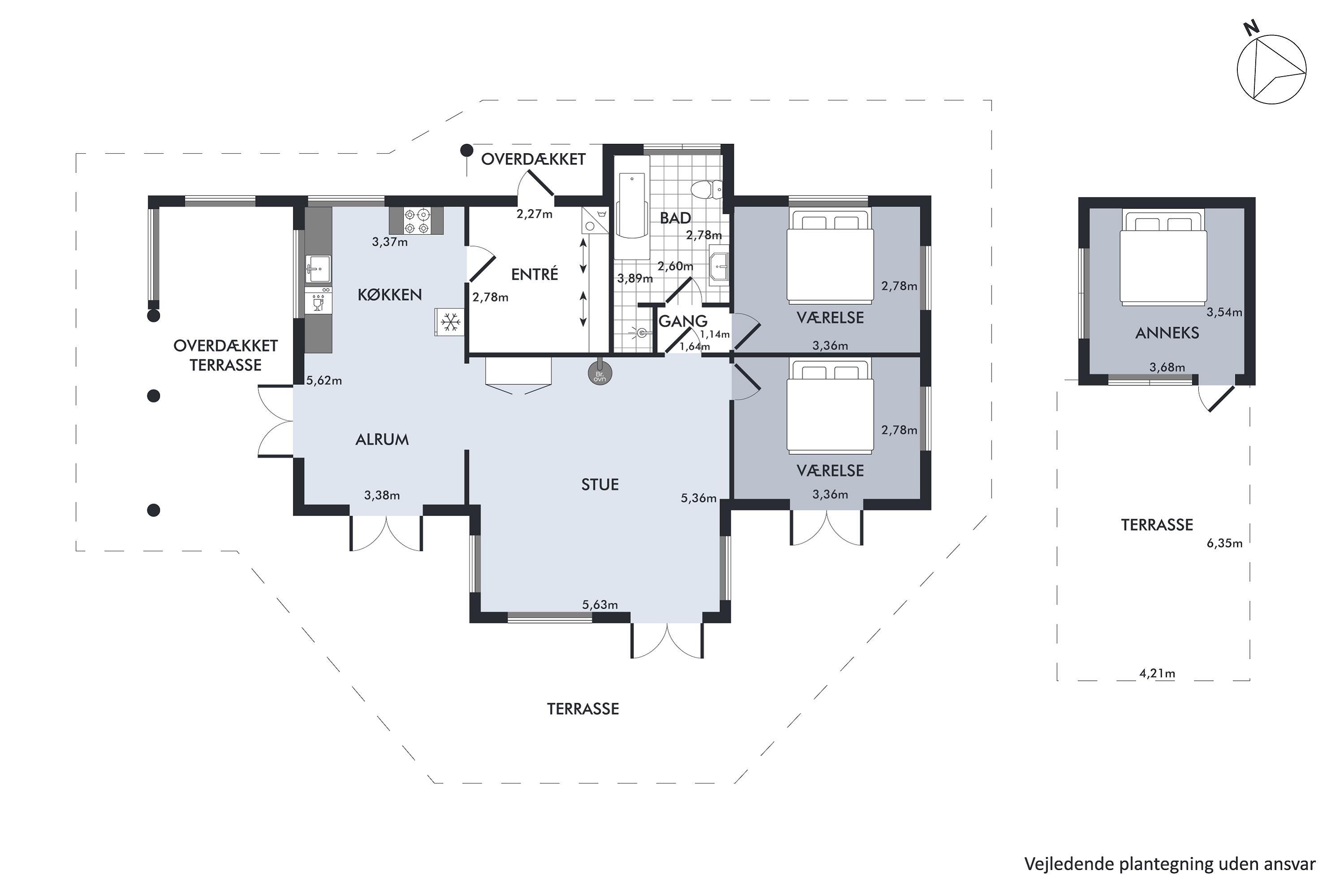 Sort, norsk bjælkehus beliggende på stor og naturligt afskærmet naturgrund med god plads til udendørsaktiviteter. Skønne omgivelser tæt på børnevenlig strand og med stor, delvis overdækket terrasse med havemøbler og grill, der går hele vejen rundt om huset. Huset fremstår lyst og venligt med loft og store bjælker til kip. Stor, dejlig stue med brændeovn og TV til streaming fra egen Chromecast. Stuen ligger i åben forbindelse med dejligt køkken og stor spiseafdeling. Køkkenet har stort stålkomfur med 6 gasblus, køleskab med fryser samt opvaskemaskine. I bryggers/indgang desuden vaskemaskine samt tørretumbler. Stort, skønt badeværelse i norsk skifer med stor, flot bruseniche samt lækkert karbad. Husets 6 sovepladser fordeler sig på 2 store soveværelser: 1 med dobbeltseng og 1 med 2 enkeltsenge i huset, hvoraf det ene soveværelse desuden har udgang til terrassen via dobbeltdøre. Desuden er der et anneks ved terrassen med 2 enkeltsenge. Huset er beliggende i et område med mange aktivitetsmuligheder og tæt på mange af Djurslands turistattraktioner så som Djurs Sommerland, Randers Regnskov og Kattegatcentret. Huset er desuden beliggende i et område ideelt for lystfiskeren, hvor især havørreden ofte bider på krogen.